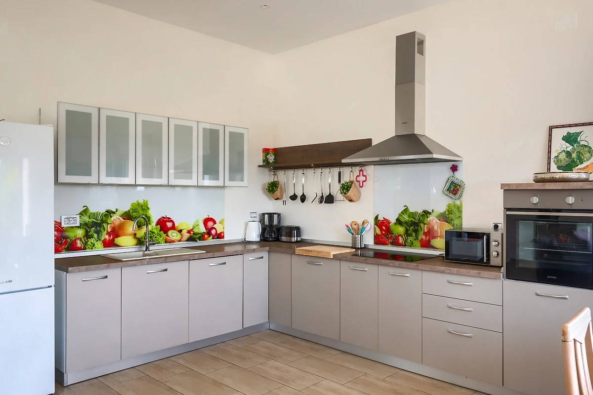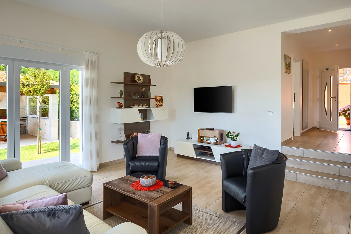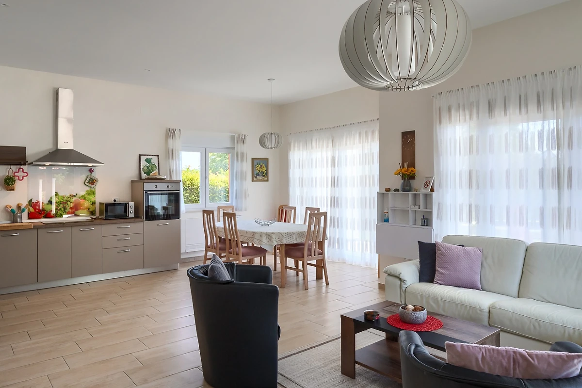 Entrando al piano terra, vi accoglie un'ariosa zona giorno a pianta aperta, con porte in vetro che lasciano entrare molta luce e forniscono un facile accesso al giardino e alla zona piscina. La zona giorno è composta da salotto, cucina e sala da pranzo. Il salotto è dotato di un accogliente divano ad angolo e di una smart TV, ideale per riunirsi e guardare un film. L'arredamento contemporaneo si combina con decorazioni incantate, mentre i toni neutri creano un'atmosfera piacevole. L'arredamento si estende anche alla cucina completamente attrezzata, dove troverete tutti gli elettrodomestici necessari, dalla macchina del caffè al microonde. Potrete gustare un pasto gustoso con la famiglia e gli amici al grande tavolo da pranzo, con vista sull'incantevole giardino della villa.