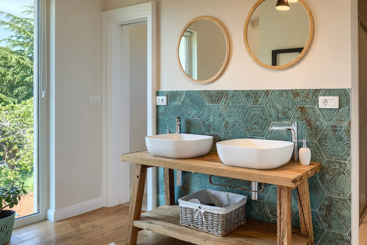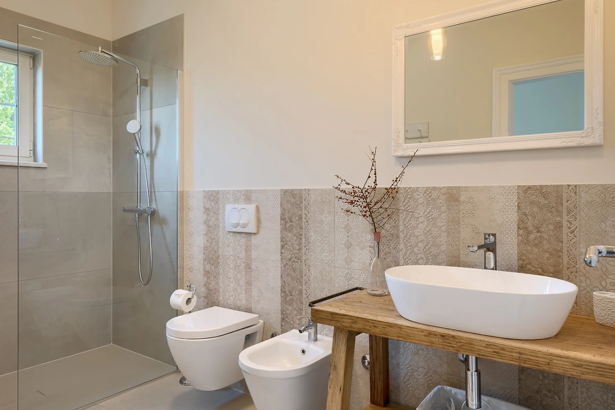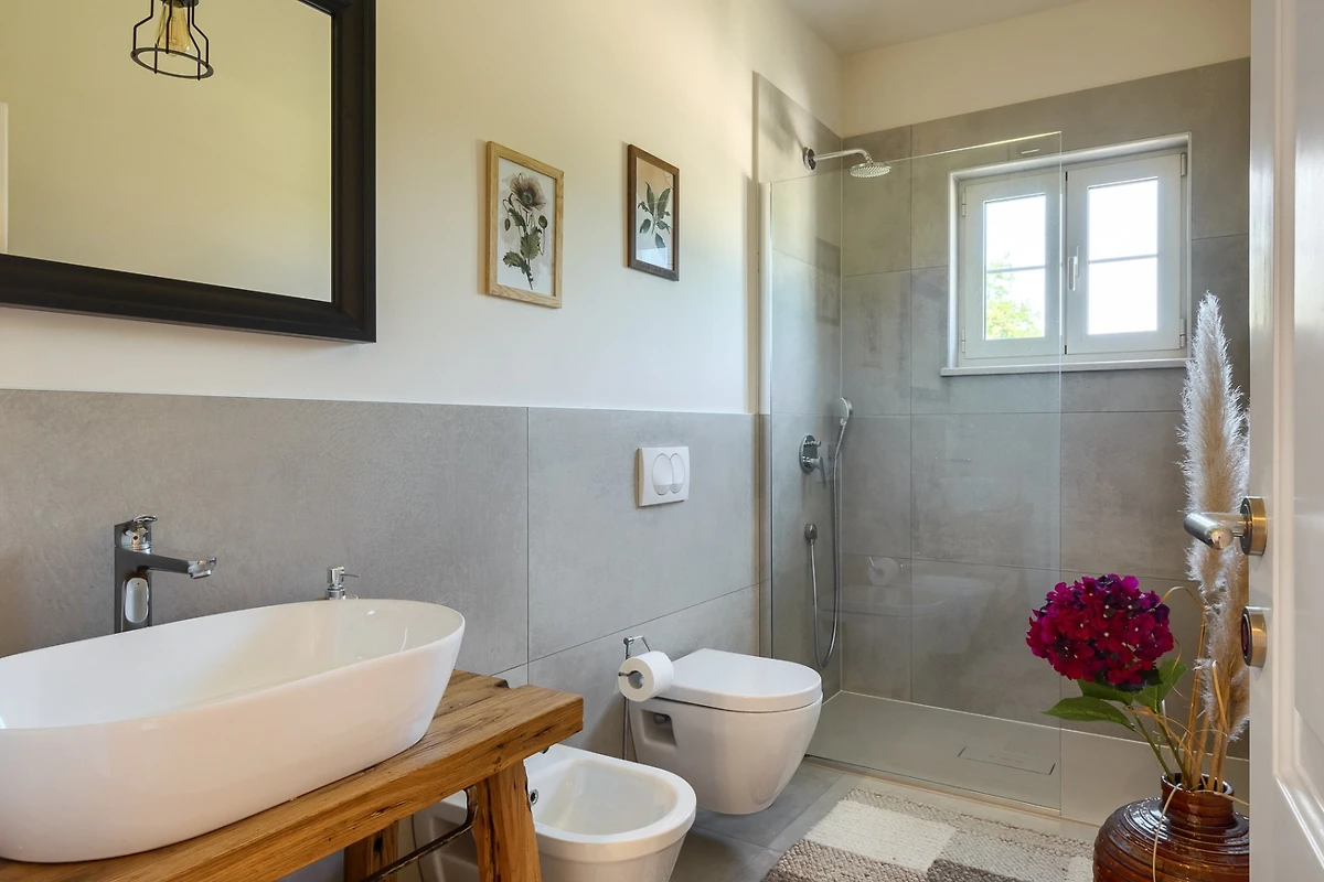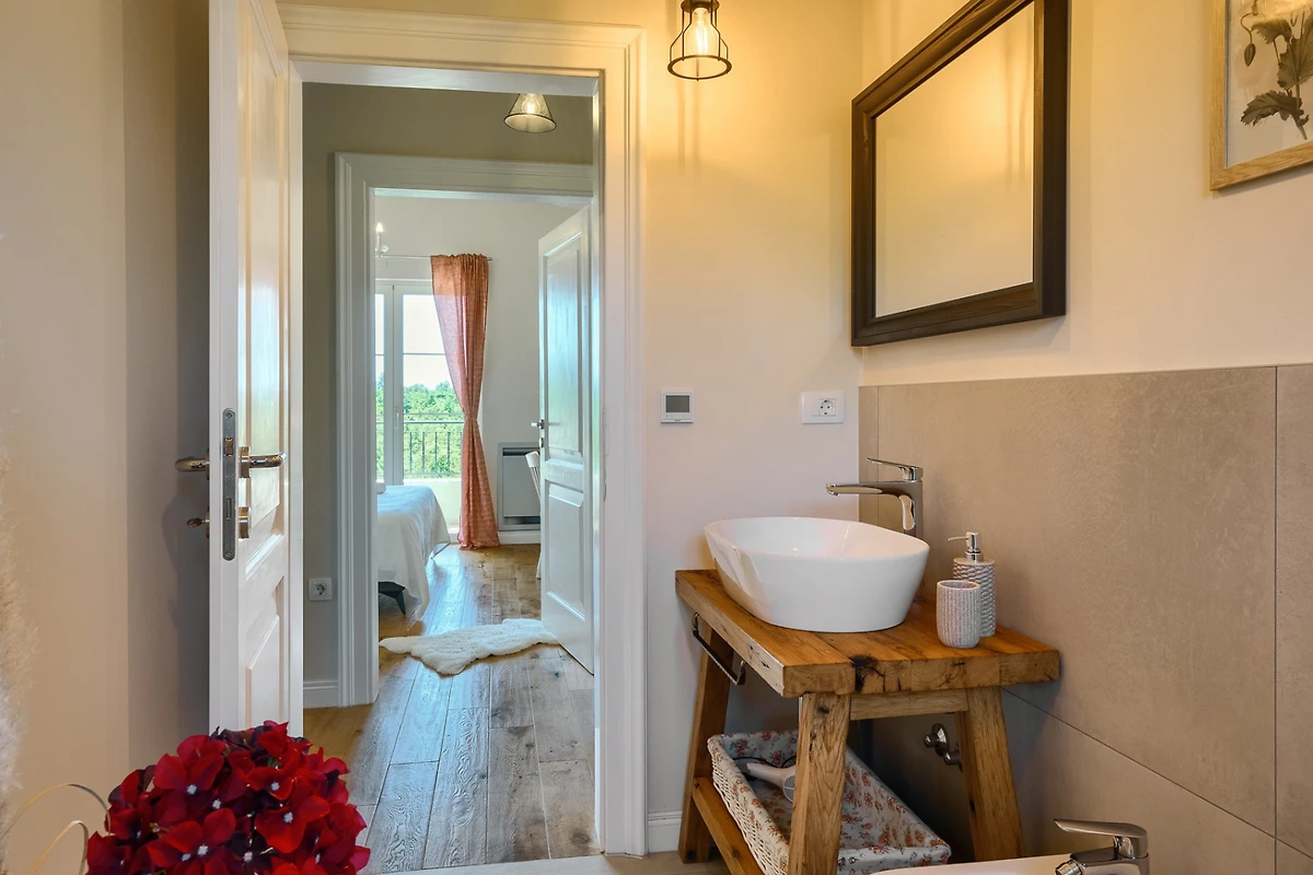 Il piano terra è composto da un soggiorno collegato ad una sala da pranzo e una cucina. Un soggiorno affascinante, decorato in modo da farti sentire a casa. Un comodo divano e la televisione satellitare sono una parte essenziale del relax, mentre il tavolo da pranzo in legno e la cucina attrezzata ti conquisteranno con la qualità della loro lavorazione artigianale. In cucina troverete tutti gli elettrodomestici necessari per preparare diversi pasti ed è disponibile anche una lavastoviglie. La villa al piano terra contiene anche una toilette separata per gli ospiti. Gli interni arredati in stile rustico ed elementi decorativi accuratamente selezionati formano un insieme armonioso e uno stile elegante che prevale in tutti gli ambienti della villa.
