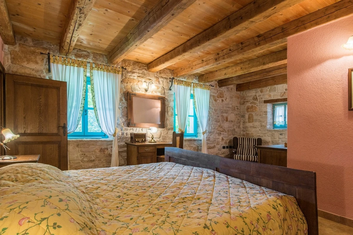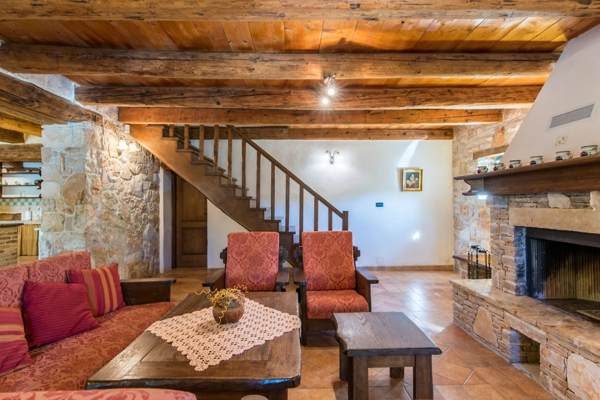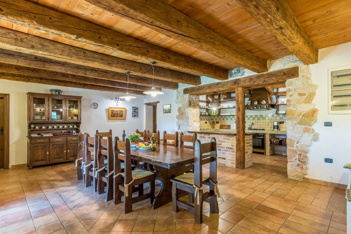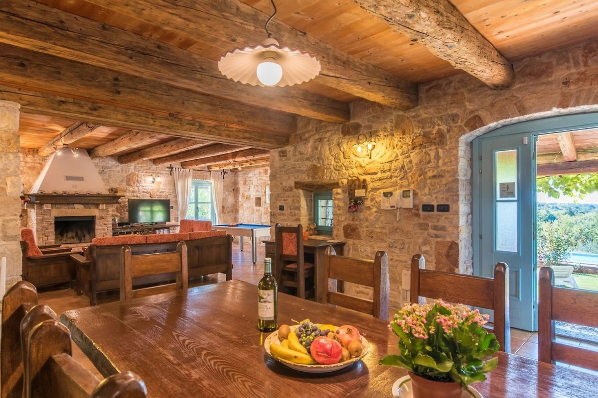 L'interno della villa è di 270 m² e si compone di un piano terra e di un piano superiore. Al piano terra troverete uno spazio rustico per rilassarvi e mangiare, composto da soggiorno, sala da pranzo e cucina. Nel soggiorno, che ha come punto focale un camino, troverete un'area salotto con TV e, per gli amanti dei giochi, un tavolo da biliardo. Nella spaziosa sala da pranzo c'è molto spazio per mangiare e socializzare, mentre nella cucina completamente attrezzata si possono preparare i pasti. Lo spazio è dominato da pareti in pietra, che mantengono l'ambiente fresco in estate, e da travi in legno del soffitto, che aggiungono un tocco di calore.