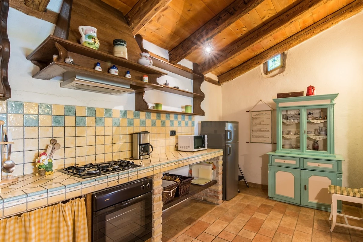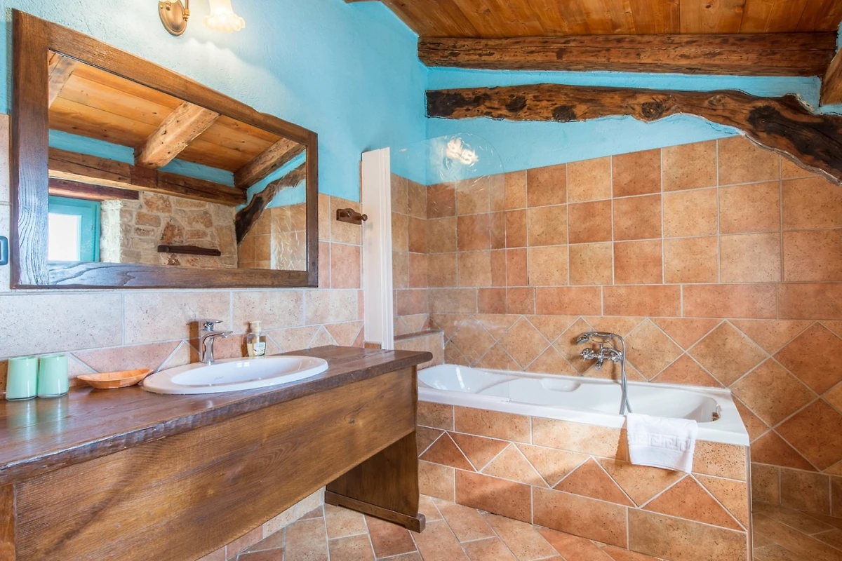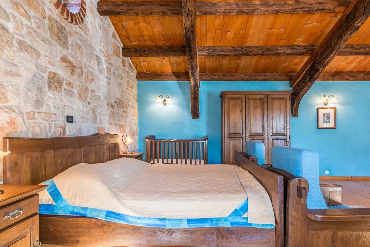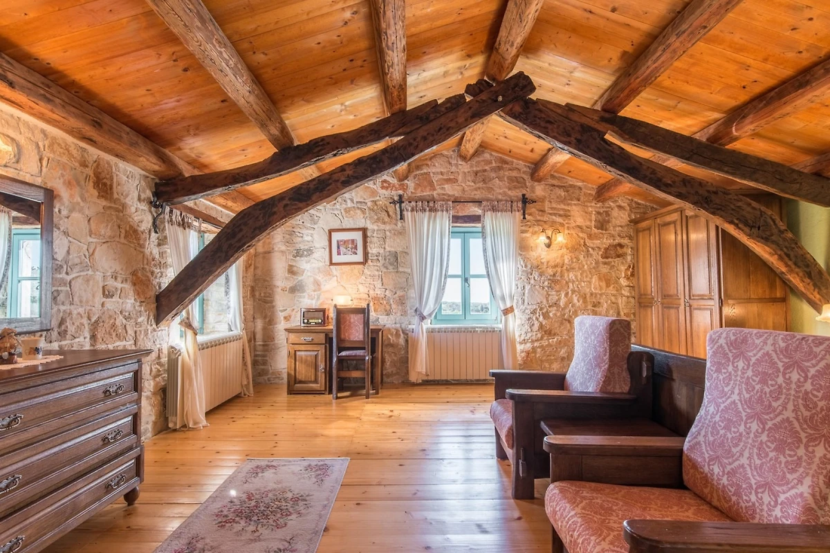 L'interno della villa è di 270 m² e si compone di un piano terra e di un piano superiore. Al piano terra troverete uno spazio rustico per rilassarvi e mangiare, composto da soggiorno, sala da pranzo e cucina. Nel soggiorno, che ha come punto focale un camino, troverete un'area salotto con TV e, per gli amanti dei giochi, un tavolo da biliardo. Nella spaziosa sala da pranzo c'è molto spazio per mangiare e socializzare, mentre nella cucina completamente attrezzata si possono preparare i pasti. Lo spazio è dominato da pareti in pietra, che mantengono l'ambiente fresco in estate, e da travi in legno del soffitto, che aggiungono un tocco di calore.