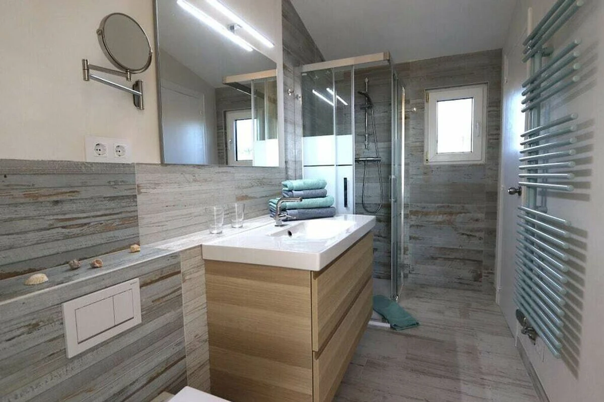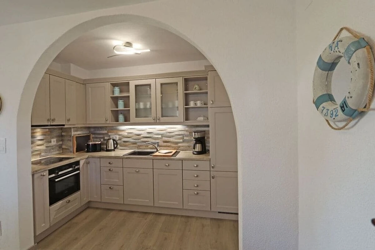 Accogliente appartamento per vacanze con terrazza sul tetto, veranda sud con vista unica sul mare, 2 camere da letto, camino, giardino e riscaldamento a pavimento