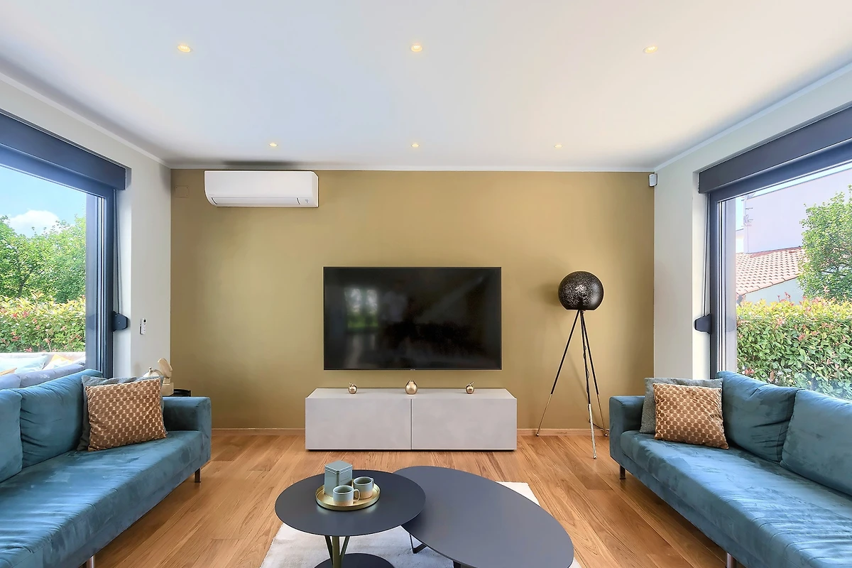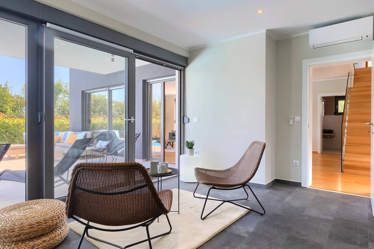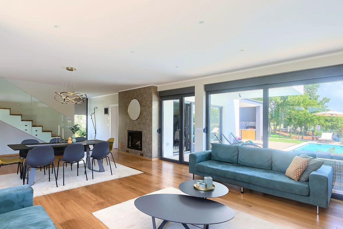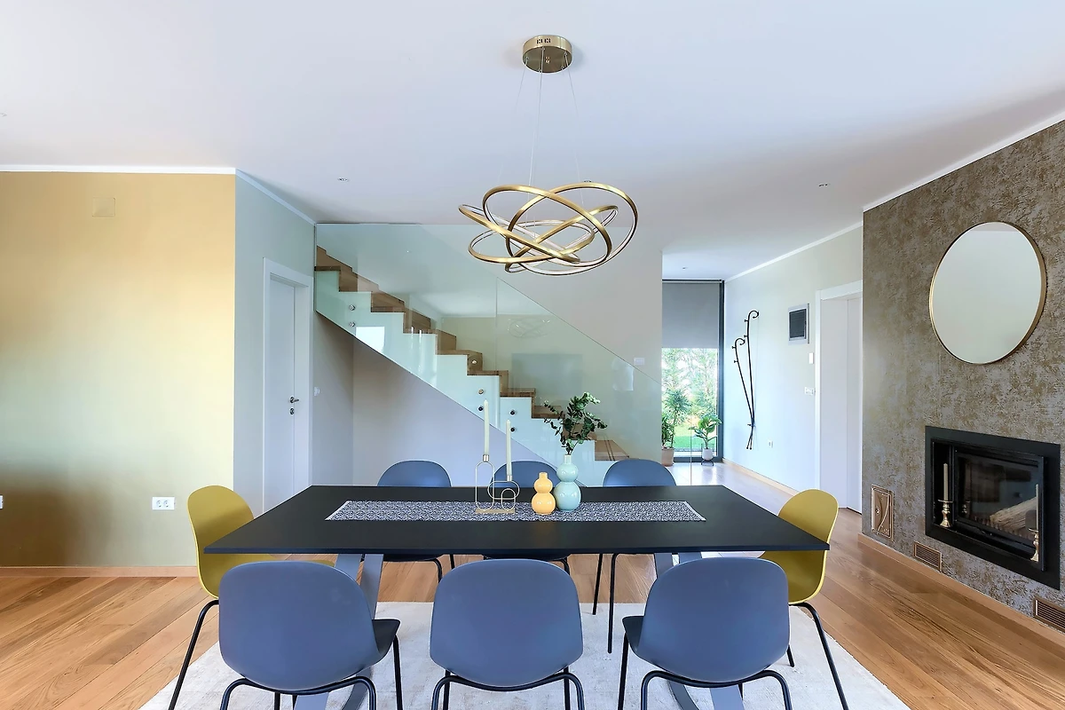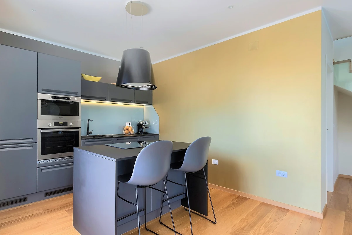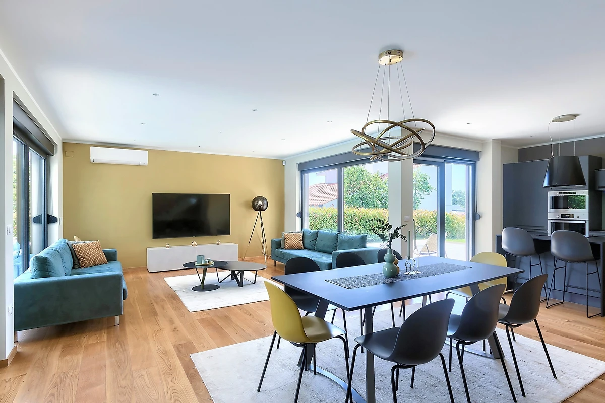Il piano terra della villa è davvero enorme. Le pareti di vetro e le finestre che si estendono attraverso l'intero spazio creano flusso e consentono molta luce. Il soggiorno è composto da mobili moderni: un televisore e due grandi divani. La sala da pranzo con un tavolo per 8 persone e la cucina in un elegante colore grigio contribuiscono all'aspetto costoso dello spazio. Gli elettrodomestici moderni e un'isola cucina contribuiscono alla qualità e al comfort del soggiorno nella villa.