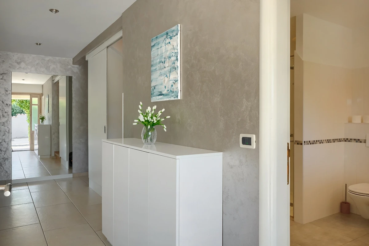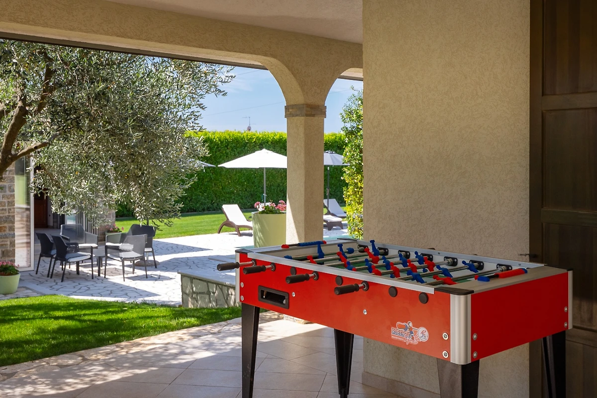 Ciò che rende questa villa davvero speciale è lo spazio esterno, che si estende per 1200 m². È composto innanzitutto dalla terrazza esterna con una piscina di acqua salata e 8 sedie a sdraio per rilassarsi. C'è poi un'area relax con mobili da giardino e, accanto, un edificio separato con cucina estiva completamente attrezzata e un grande tavolo da pranzo. La struttura può essere completamente chiusa per essere utilizzata tutto l'anno. Tuttavia, il fascino più bello si riflette quando tutte le porte sono aperte e lo spazio interno si fonde con quello esterno. Sono disponibili anche diverse attività come freccette, calcio balilla e ping pong. Se state pianificando una vacanza con i bambini, questa villa sarà un successo. L'ampio cortile, la piscina e le numerose strutture di intrattenimento garantiscono giornate piene di attività che non lasceranno spazio alla noia.