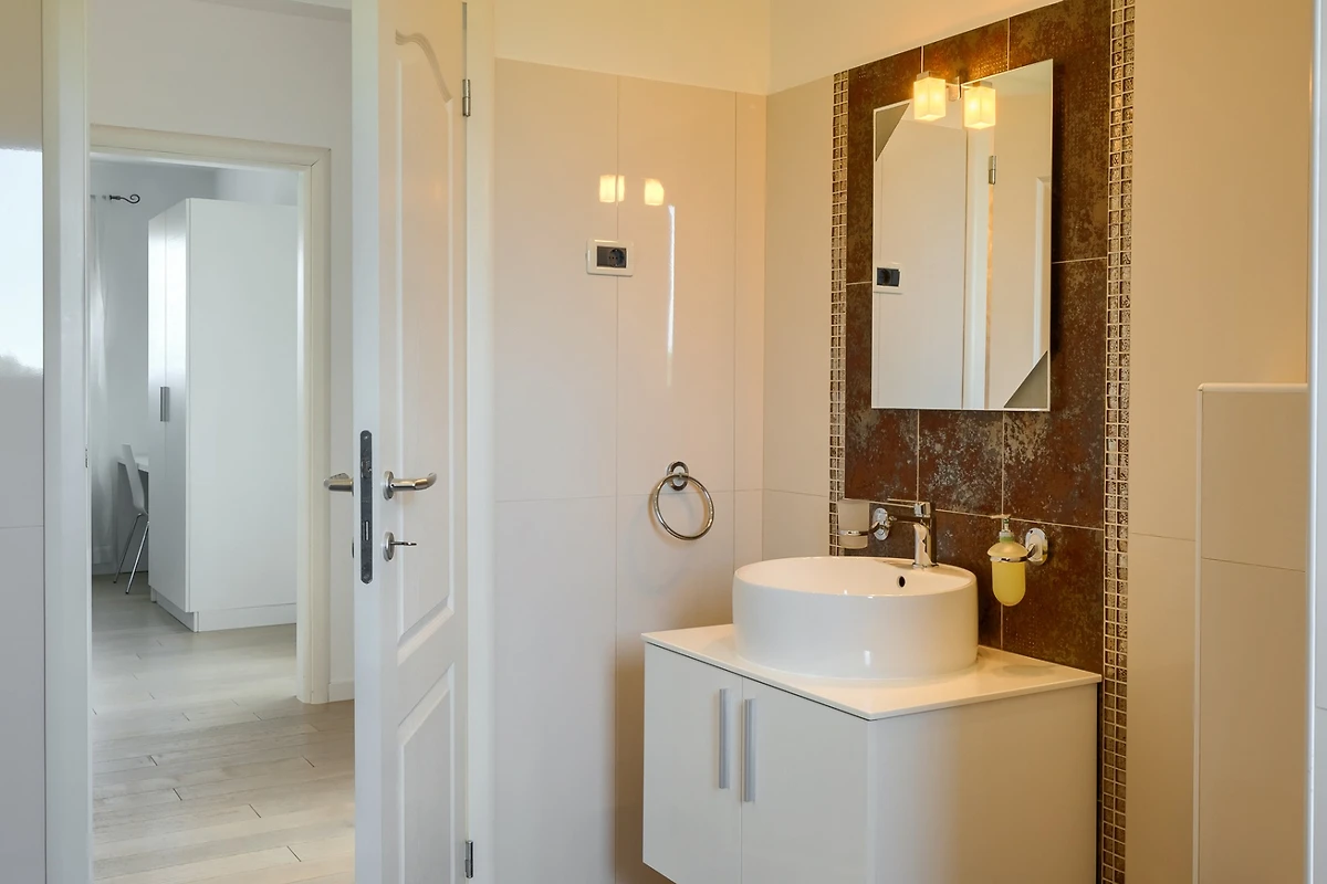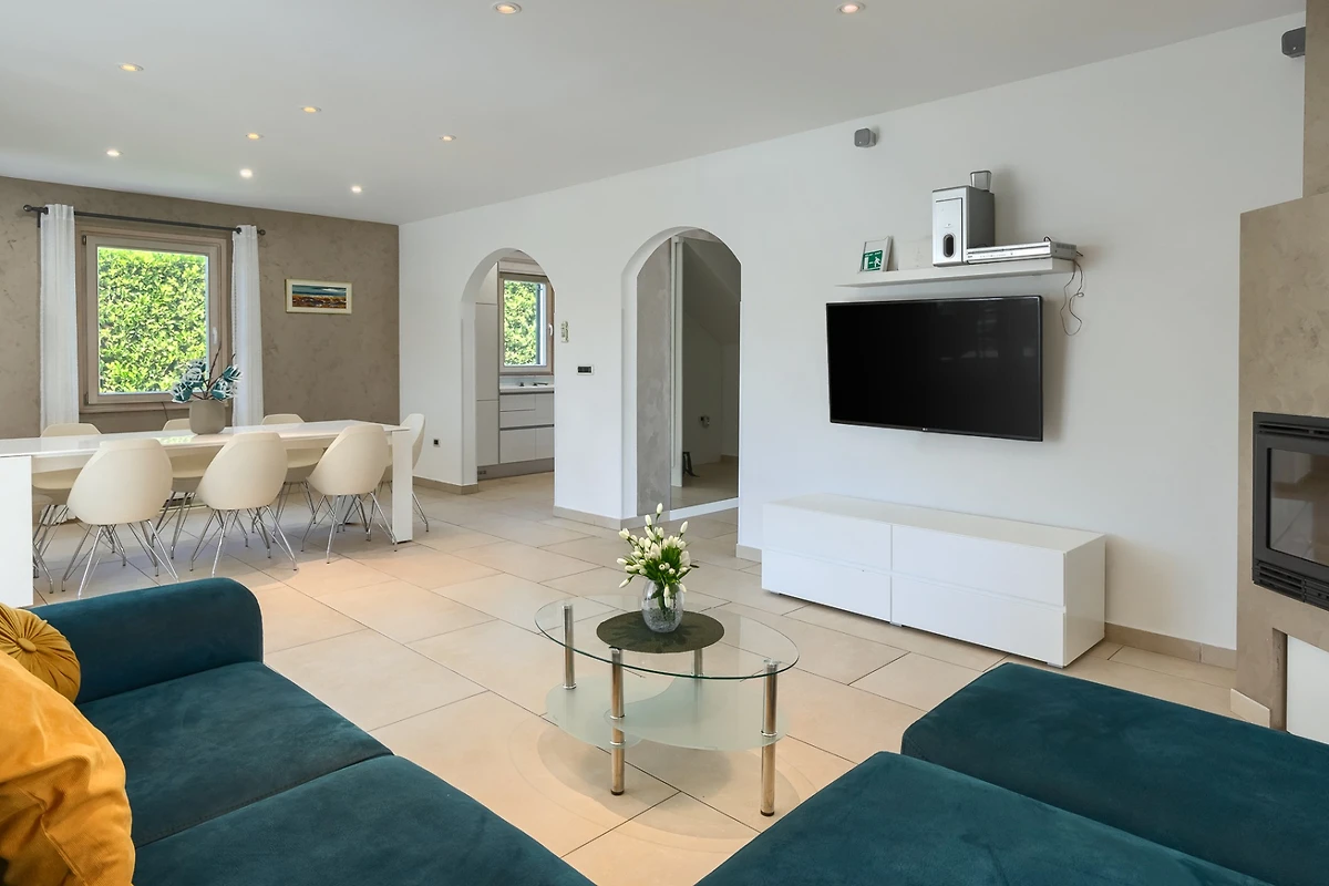 Questa casa vacanze copre una superficie di 150 m² ed è composta da piano terra e piano superiore. Al piano terra si trova un'ampia e luminosa area per pranzare e rilassarsi, composta da un soggiorno e una sala da pranzo con 8 posti a sedere. Nell'estensione si trova una moderna cucina completamente attrezzata, pronta a preparare deliziosi pasti. L'intero spazio al piano terra è arredato in stile minimalista con mobili di linee pulite in colori chiari, con l'aggiunta di colori accenti di turchese e giallo. Tutte le stanze sono dotate di aria condizionata e, per riscaldare l'atmosfera nelle giornate più fredde, è a disposizione un caminetto interno.