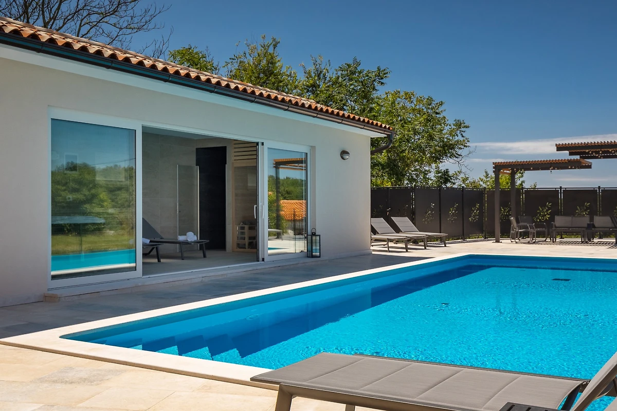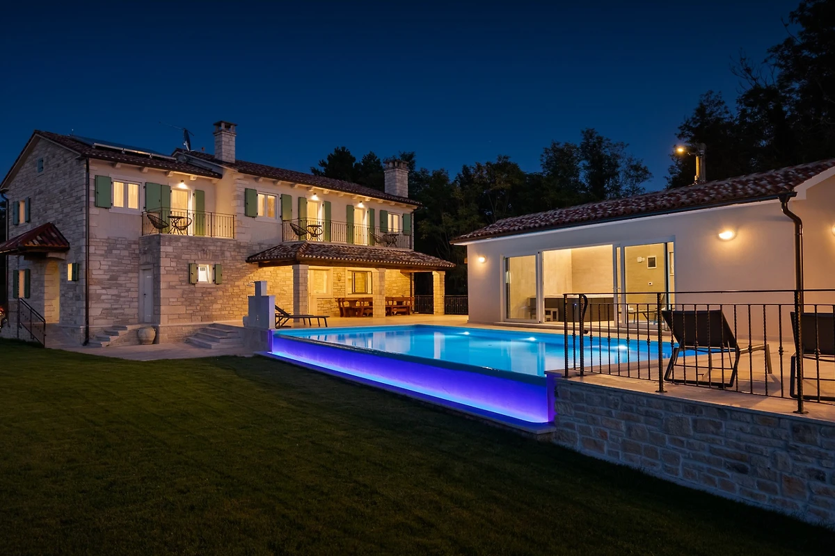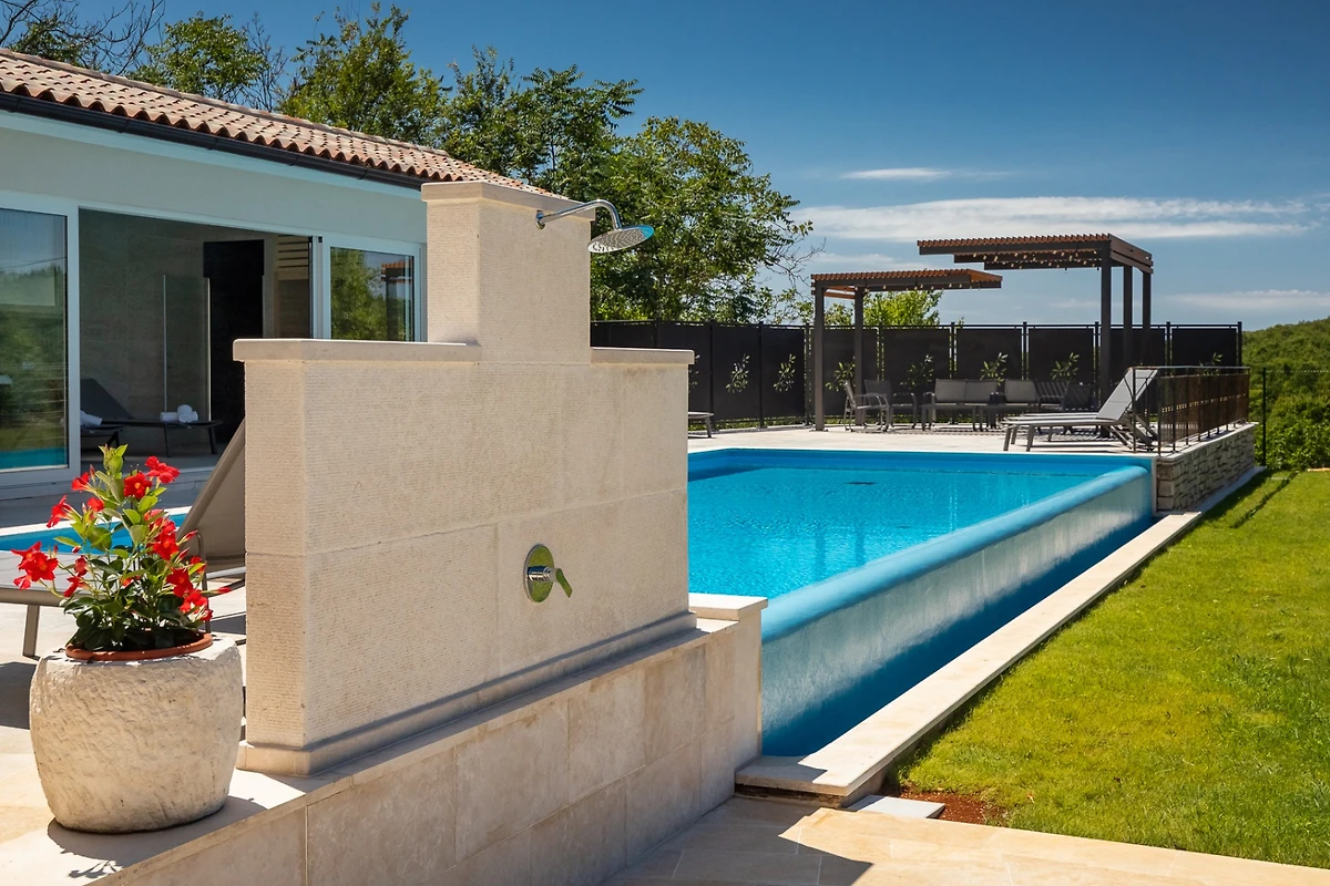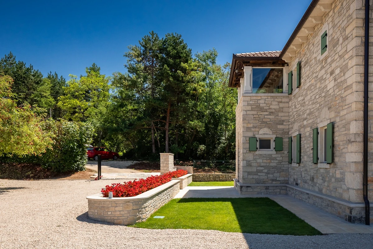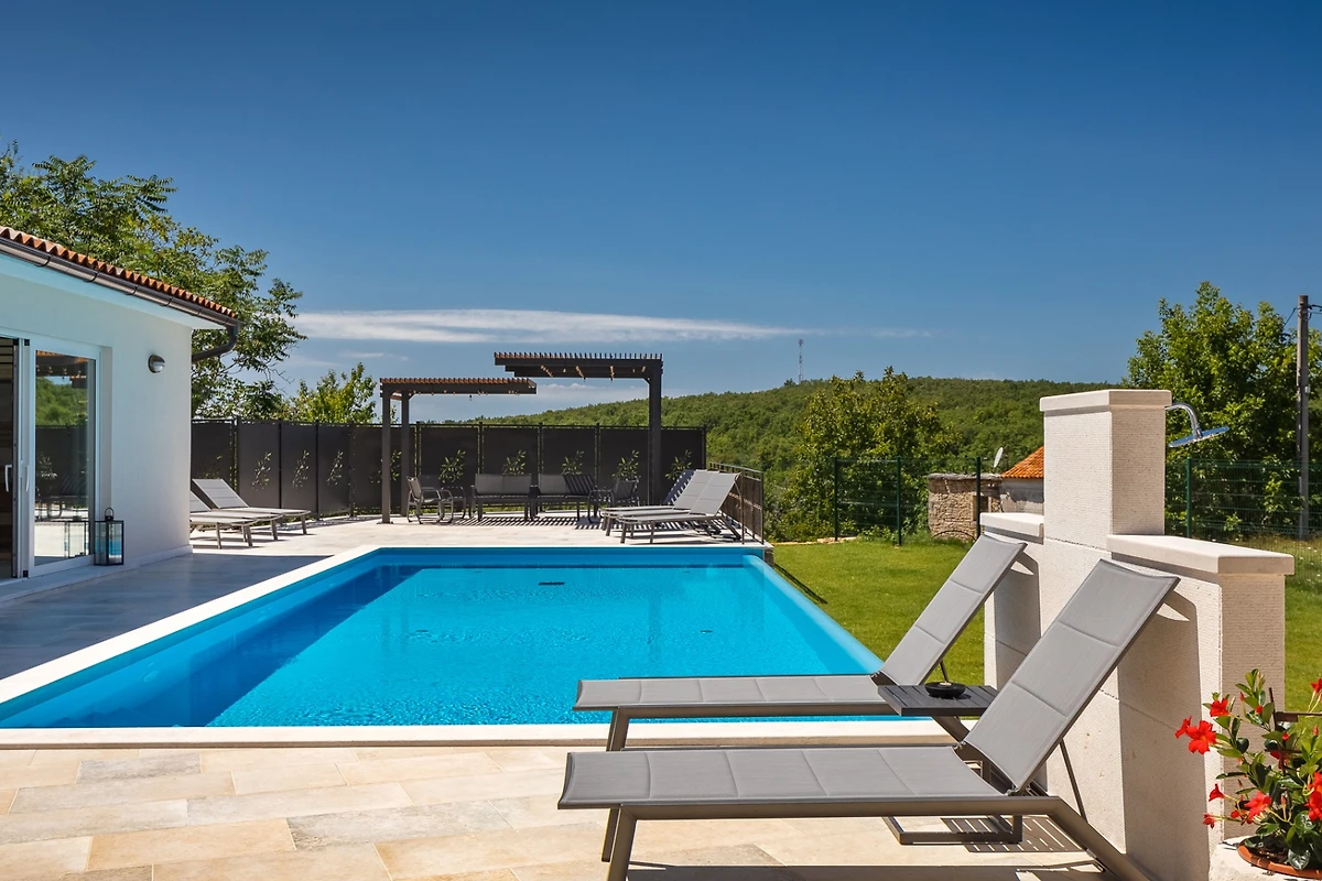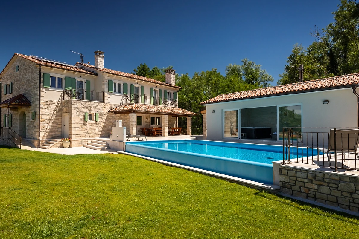 La lussuosa villa Kave si trova nel sereno villaggio di Martinčići vicino a Grožnjan, nel nord-ovest dell'Istria. Con una superficie interna di 299 m², la villa dispone di 6 camere da letto e 7 bagni, in grado di ospitare comodamente 14 persone. È ideale per vacanze in famiglia e con gli amici. L'elegante interno della villa vanta un bar privato e il vasto giardino offre vari punti per rilassarsi con i propri cari. Godetevi la vista mentre vi rilassate in piscina riscaldata o nella vasca idromassaggio e, grazie alla cucina estiva, potrete preparare specialità nell'aria mediterranea profumata. Gli ospiti hanno accesso a un parcheggio privato per un massimo di 6 veicoli.