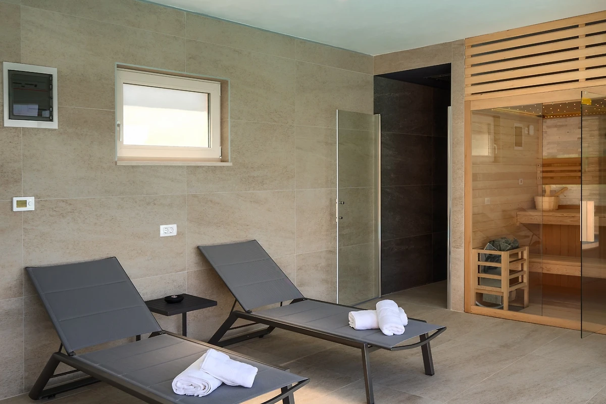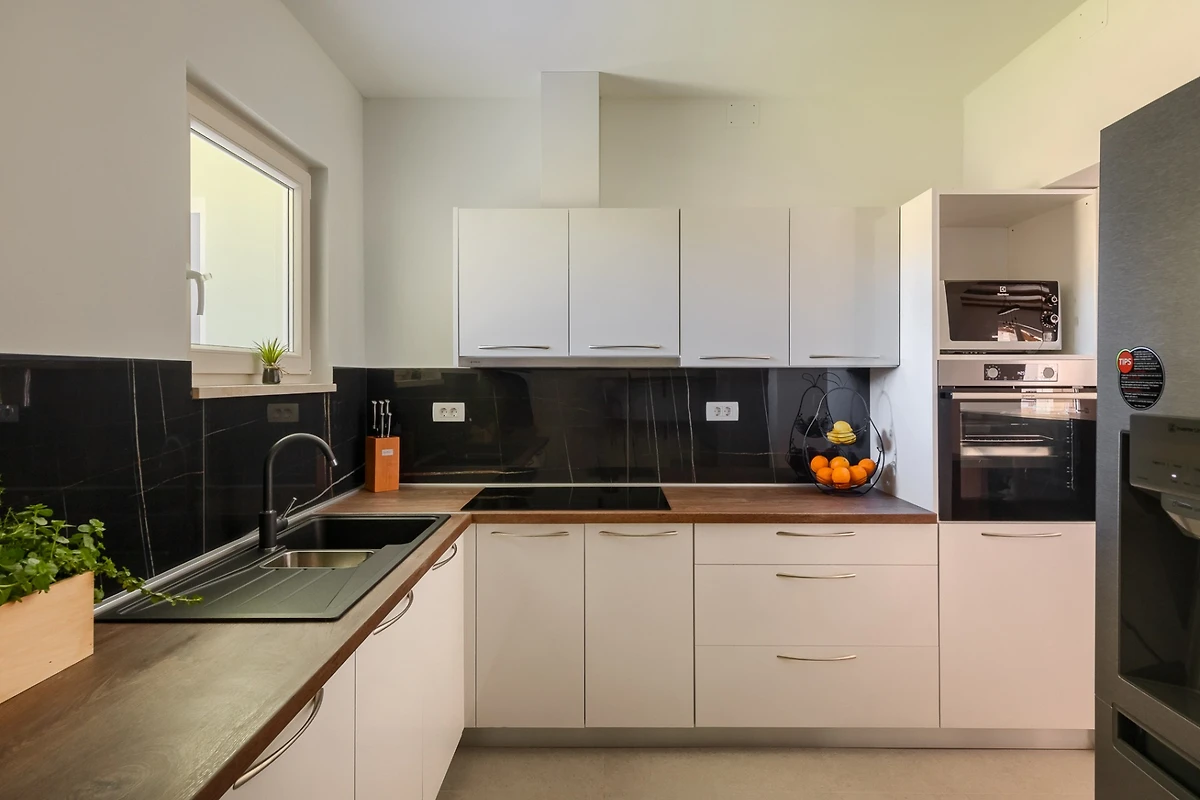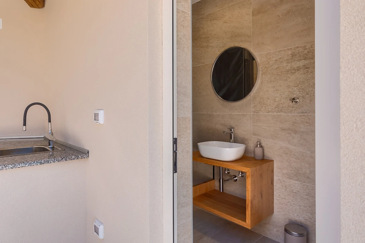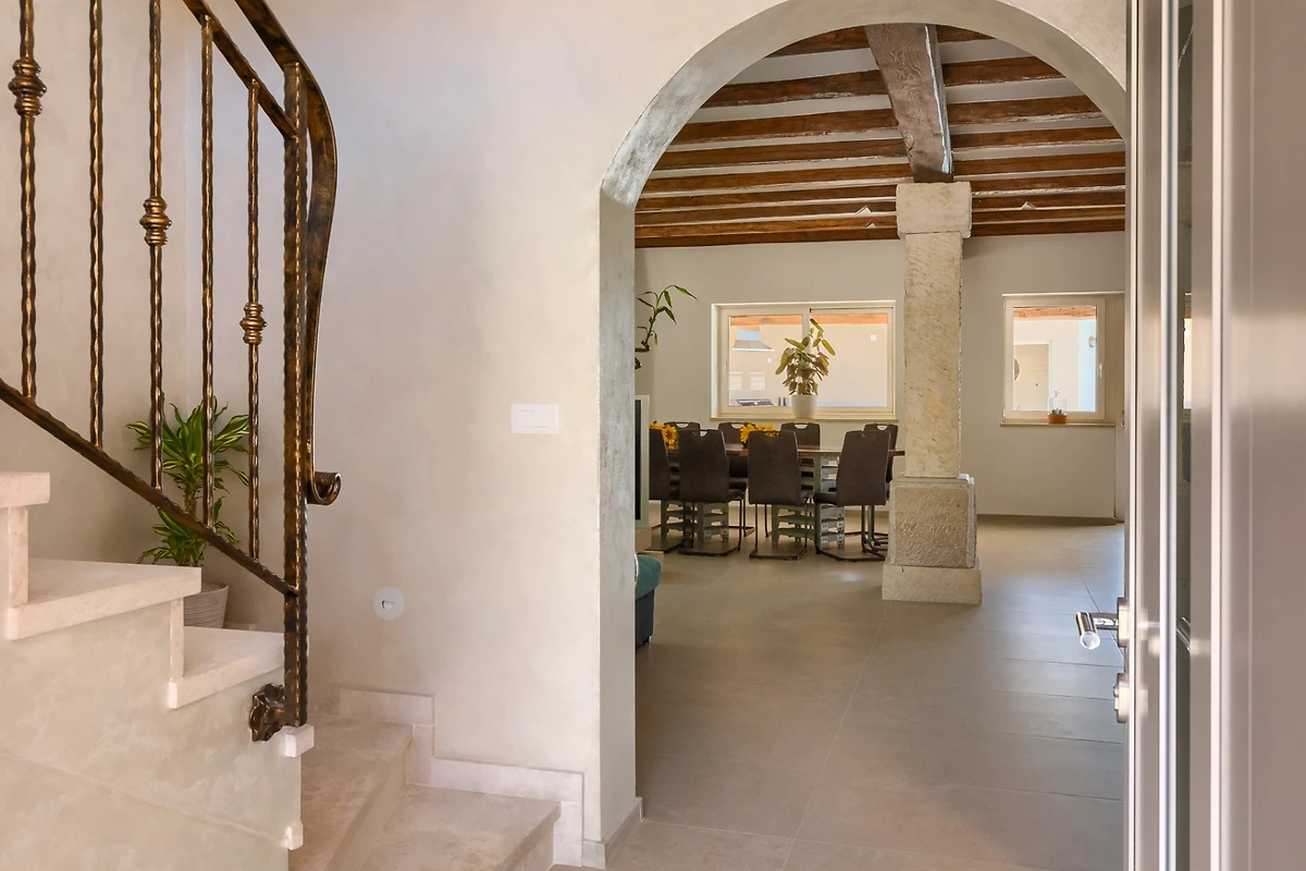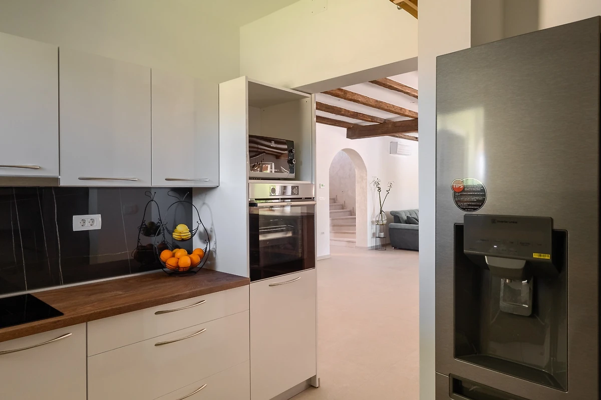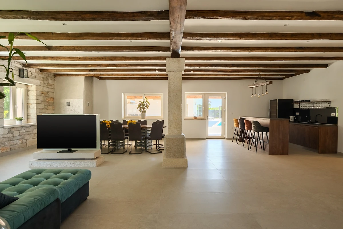 Al piano terra c'è un'area living open space. C'è un soggiorno, una sala da pranzo e un bar, mentre la cucina si trova nella stanza adiacente. La deliziosa unione di minimalismo moderno e stile mediterraneo tradizionale crea un'atmosfera incantevole. Grazie ai colori chiari, l'area sembra spaziosa. I mobili sono di altissima qualità. Vedrete elementi in pietra e legno, come travi in legno nel soffitto. Un ampio divano domina il soggiorno, perfetto per una serata cinematografica di gruppo con la smart TV. Il riscaldamento a pavimento è disponibile in ogni stanza della villa, amplificando il vostro piacere. L'unica tavola da pranzo per 14 persone delizierà tutti gli ospiti e il camino aggiunge un'atmosfera speciale. Nell'angolo adiacente del piano terra c'è un bar con un frigorifero per le bevande, un lavandino e un bancone con sgabelli alti - dove avrà inizio ogni festa nella villa e dove potrete mettere alla prova le vostre capacità di barista. La cucina contemporanea con piano a induzione è completamente arredata con stoviglie e elettrodomestici.