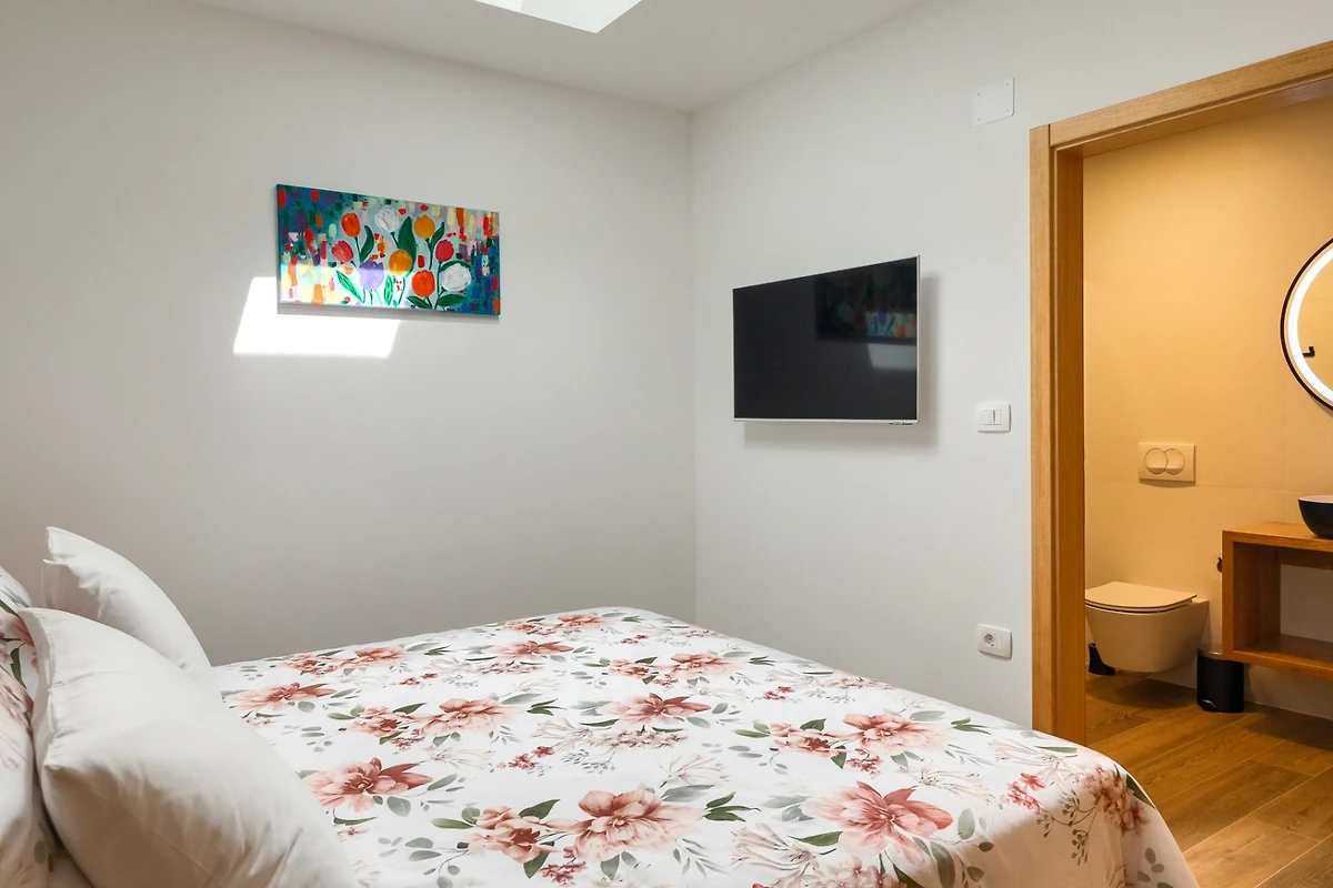 C'è 1 camera da letto al piano terra e 5 al primo piano. Hanno tutti un arredo leggero e minimale per creare un ambiente perfetto per il relax. Ogni camera climatizzata ha un bagno privato, riscaldamento a pavimento e una TV. Tre di esse hanno un balcone, con tavoli e sedie per godere della vista in privato. La camera al piano terra è arredata con letti singoli, mentre tutte le altre hanno letti matrimoniali. Una camera al primo piano include 2 posti letto aggiuntivi - un letto singolo e un divano letto. Vi sentirete ugualmente a vostro agio nei semplici bagni con accenti in legno. Hanno docce a filo pavimento e articoli per l'igiene personale, e potrete utilizzare accappatoi e asciugacapelli.