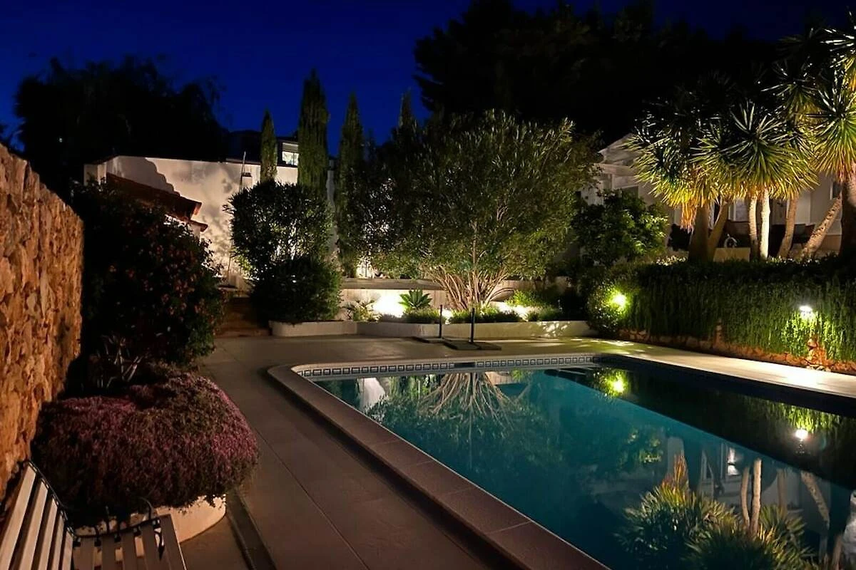 Grande piscina (12m x 5,5m) con lettini e lounge; doccia riscaldata in piscina