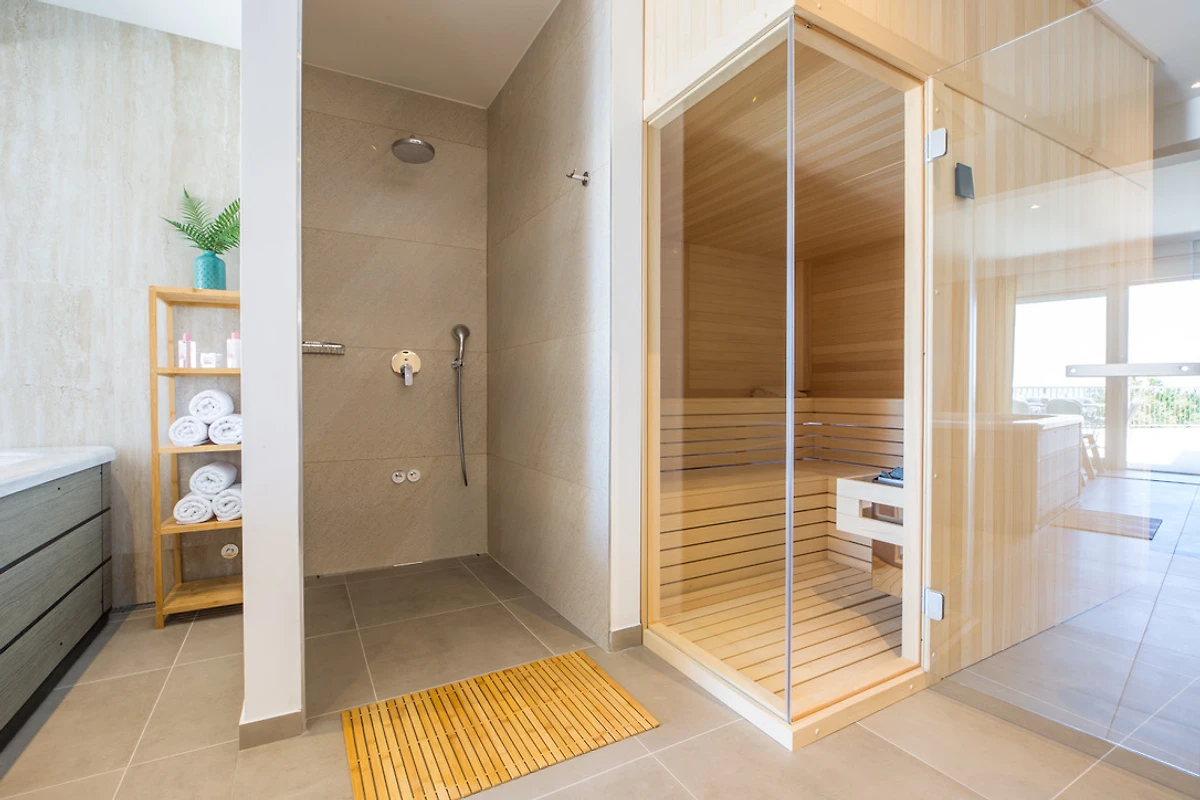 La nostra villa è climatizzata e offre un angolo cottura completamente attrezzato con lavastoviglie, microonde, bollitore e macchina da caffè. Per il vostro comfort sono disponibili anche una lavatrice, un ferro da stiro e un asciugacapelli. La villa è arredata con mobili di alta qualità e convince per il suo interno elegante. Nelle camere da letto troverete letti comodi con biancheria di alta qualità e nei bagni vi aspetta un'attrezzatura moderna con rubinetterie di pregio e lavandini in ceramica.