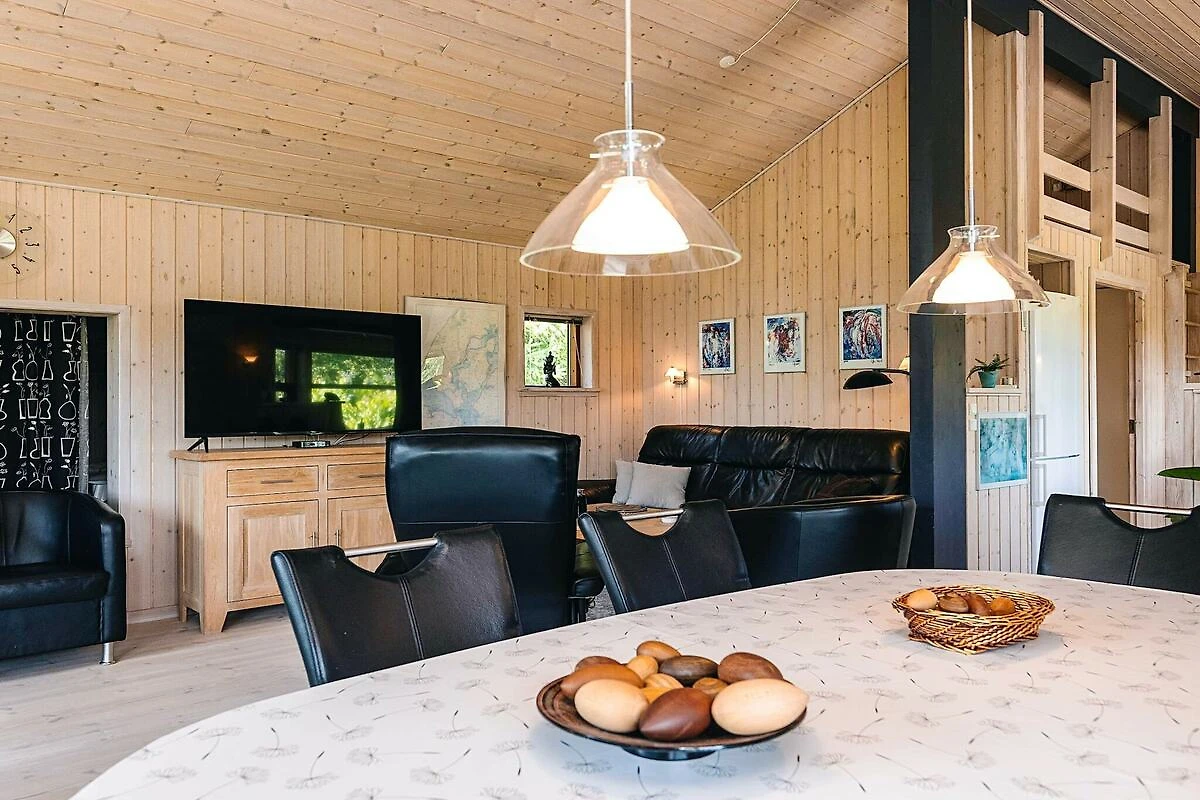 Cucina separata(mobile cucina(elettrico), caffettiera, forno a microonde, lavastoviglie, frigo con congelatore), Soggiorno/camera da letto(TV(canali televisivi tedeschi, canali TV danesi), lettore CD, impianto stereo), Camera da letto(2x letto singolo, seggiolone), Camera da letto(2x letto singolo), Camera da letto(2x letto singolo), Bagno(lavabo, WC), Bagno(impianto stereo, lavabo, doccia, WC, lavatrice), Soppalco aperto(2x letto pieghevole (1 pers.)), vasca(all'esterno, riscaldata, 5 persone), vasca idromassaggio(all’interno, riscaldata, 2 persone), sauna(all’interno, 4 persone), riscaldamento(elettrico), terrazza, mobili da giardino, lettini prendisole, termopompa aria-aria