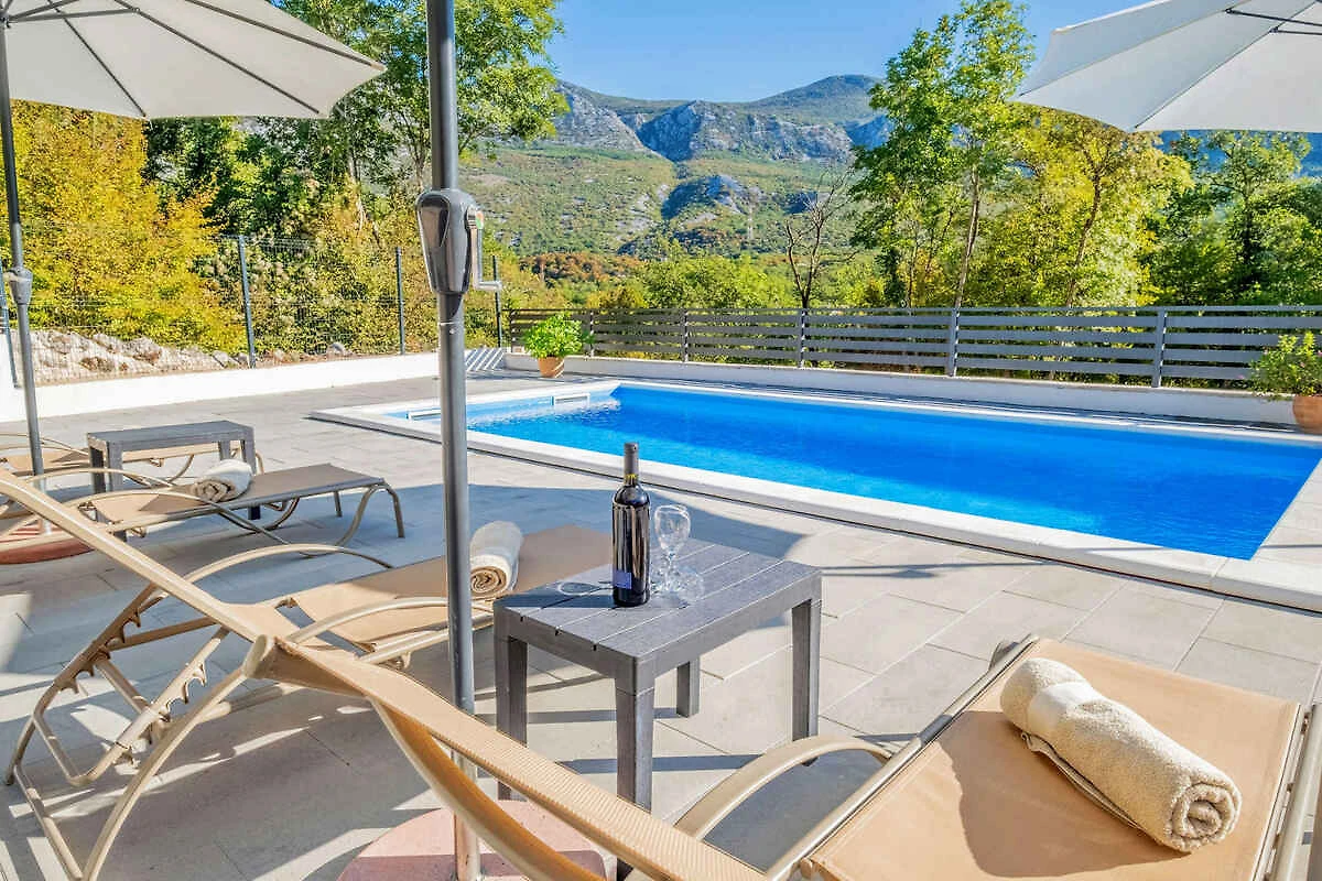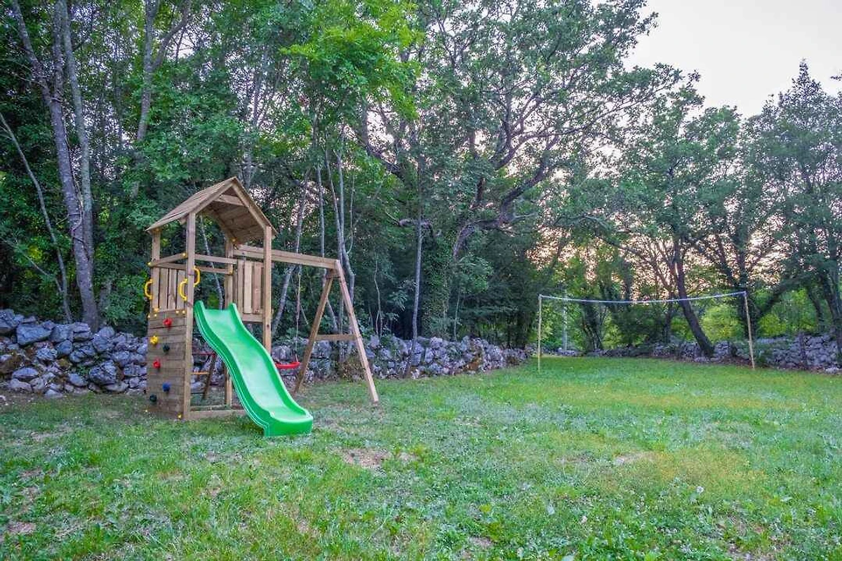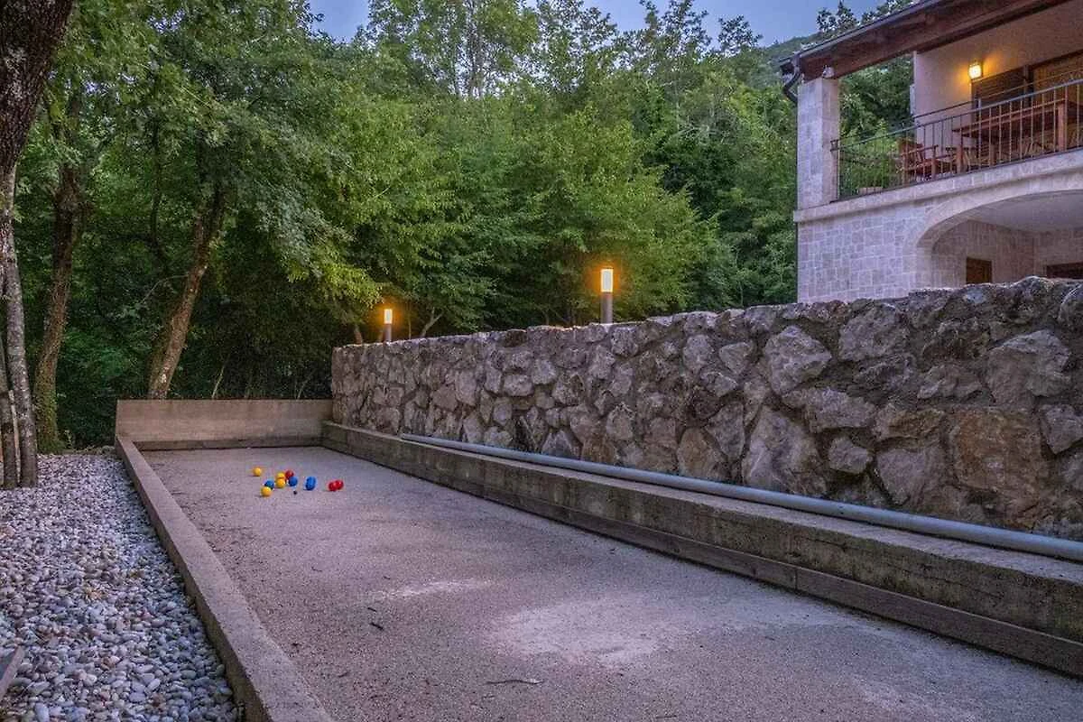 Tribalj. La casa vacanza si trova in una trama del giardino chiuso, grande 3000 mq, delimitata da un muro. L'accesso avviene vicino a una strada secondaria. Parcheggio sulla proprietà.