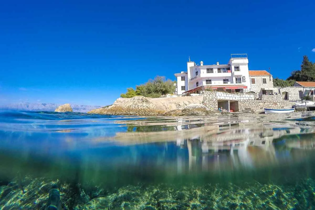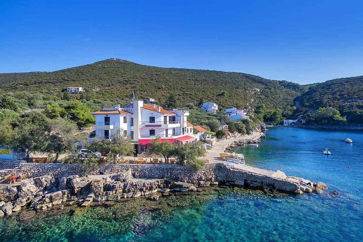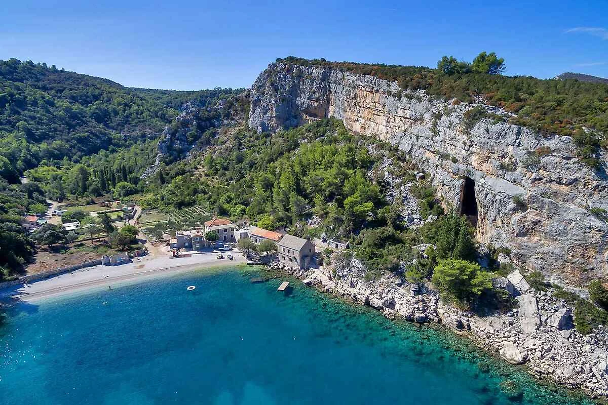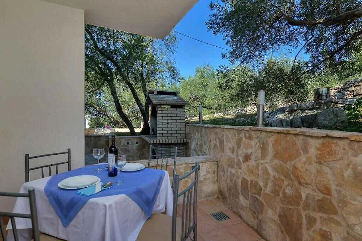 Gdinj. L'appartamento per vacanze si trova su un terreno recintato con giardino, delimitato da un muro. Il proprietario abita nella casa. L'accesso avviene tramite una strada laterale. Parcheggio sulla proprietà.