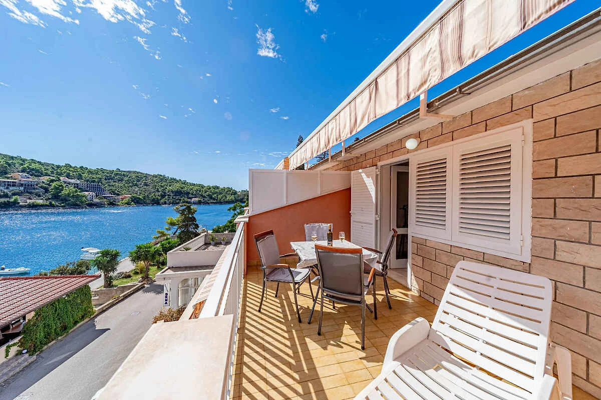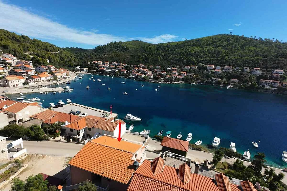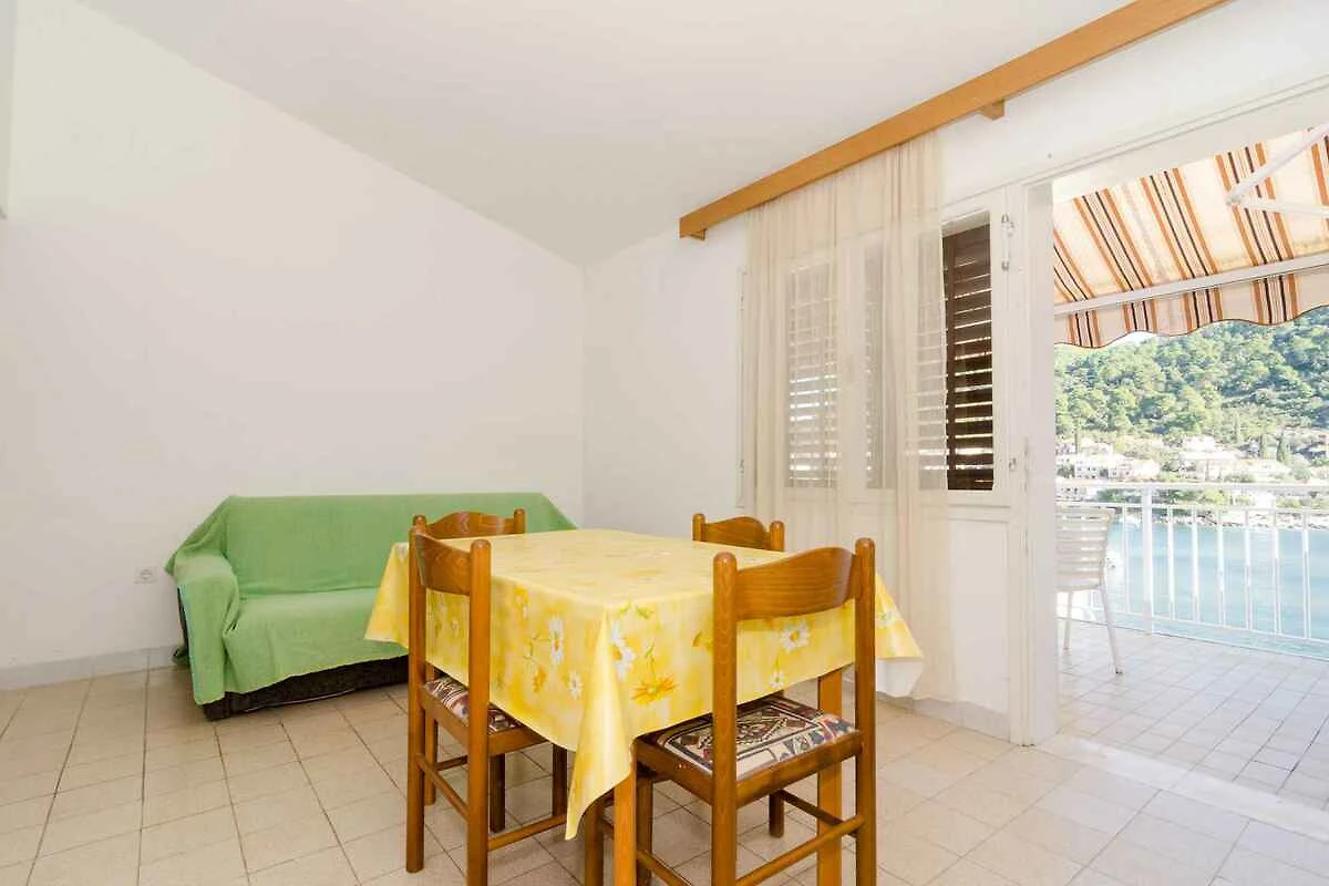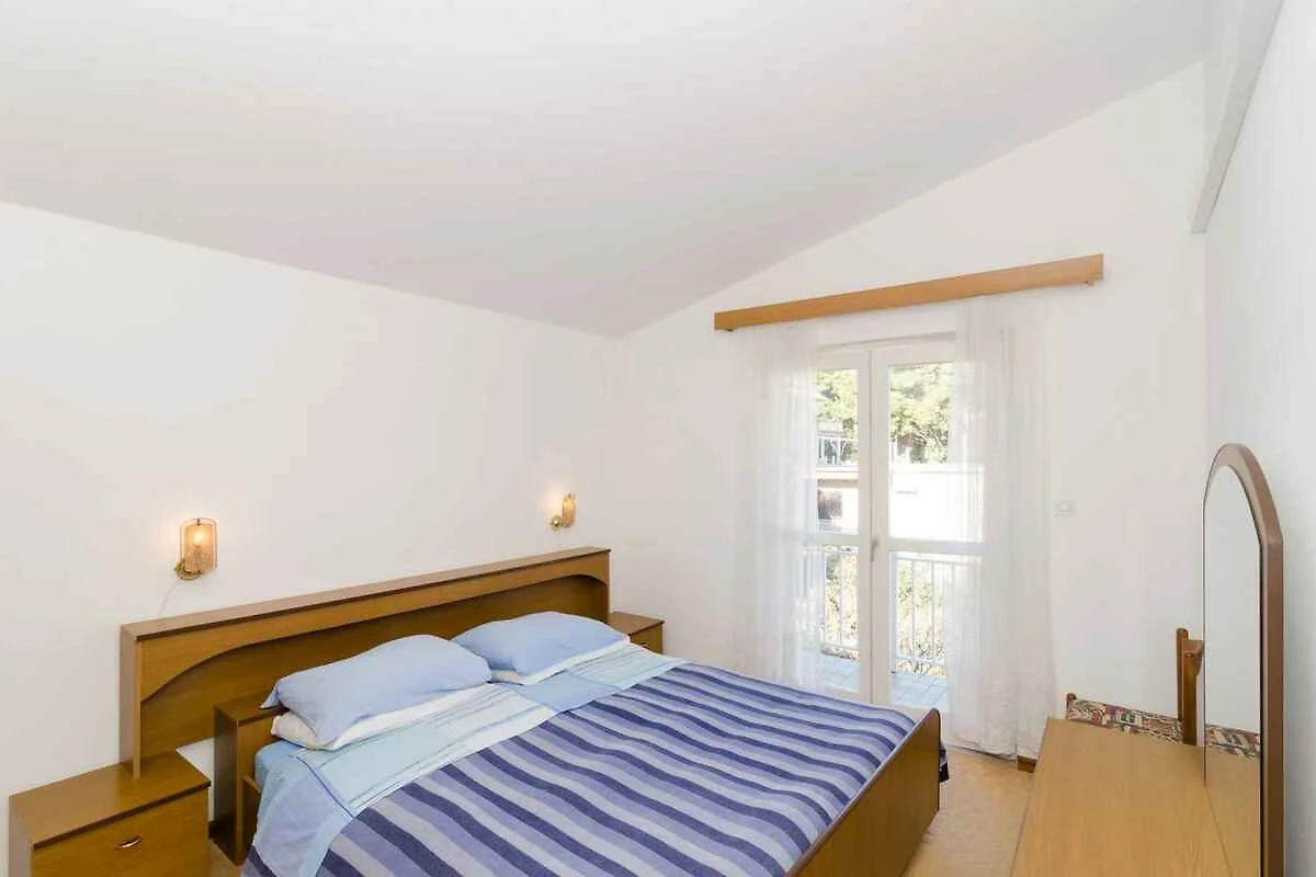 Brna. L' appartamento vacanze si trova in una trama del giardino chiuso con fiori e alberi, delimitata da una recinzione. Vista: Mare e spazio verde L'accesso avviene vicino a una strada secondaria (asfaltata).