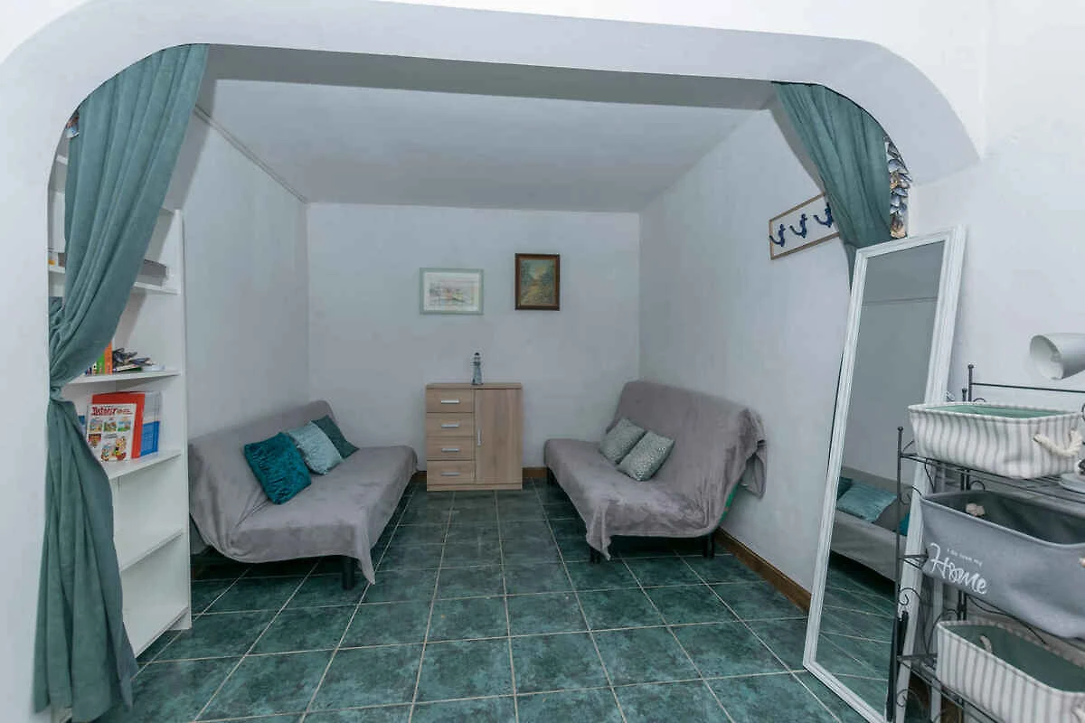 Soggiorno (camera di passaggio) con angolo di seduta, TV e zona pranzo. 2 camere da letto tutto a con 1 letto matrimoniale. Camera da letto con 1 letto matrimoniale e accesso al balcone. Angolo cucina nel soggiorno con stufa a gas, frigorifero e caffettiera. Bagno con doccia, 1 lavandino e WC. 2 WC separato tutto a con 1 lavandino e WC.