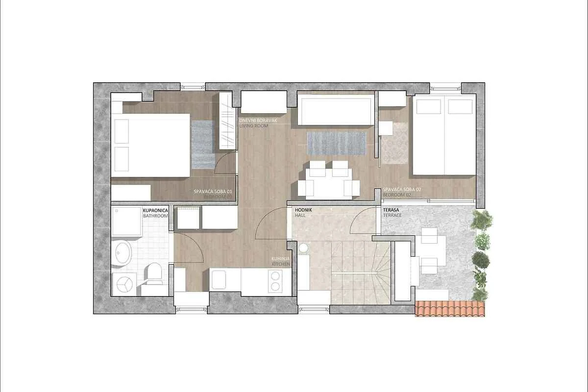 L'ingresso del vostro appartamento é a livello del suolo e conduce direttamente nel vestibolo. Soggiorno con angolo di seduta, TV e zona pranzo. Camera da letto (6 mq) con 1 letto matrimoniale. Camera da letto (9 mq) con 1 letto matrimoniale. Angolo cucina nel soggiorno con stufa a gas, forno, lavastoviglie, frigorifero e bollitore elettrico. Bagno con doccia e WC.