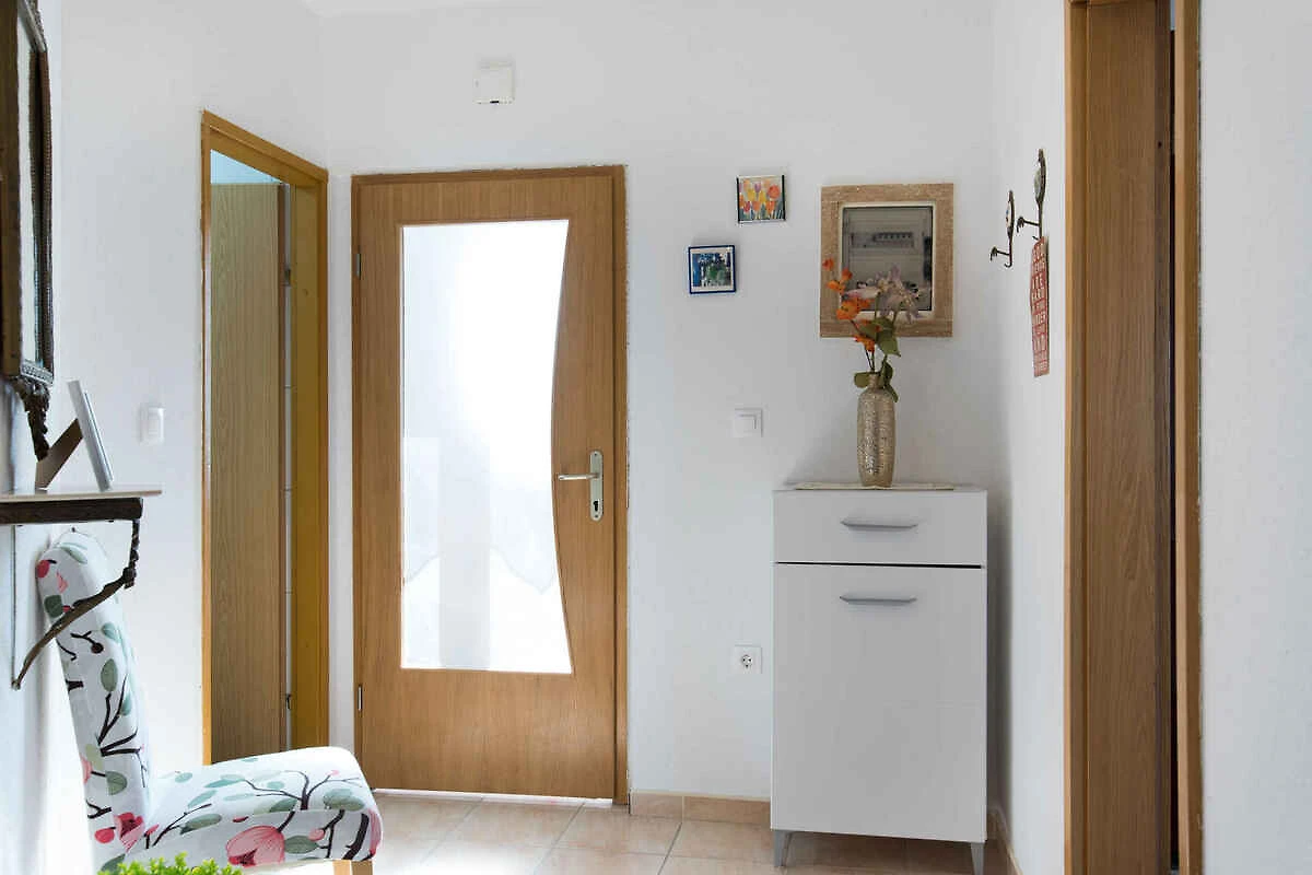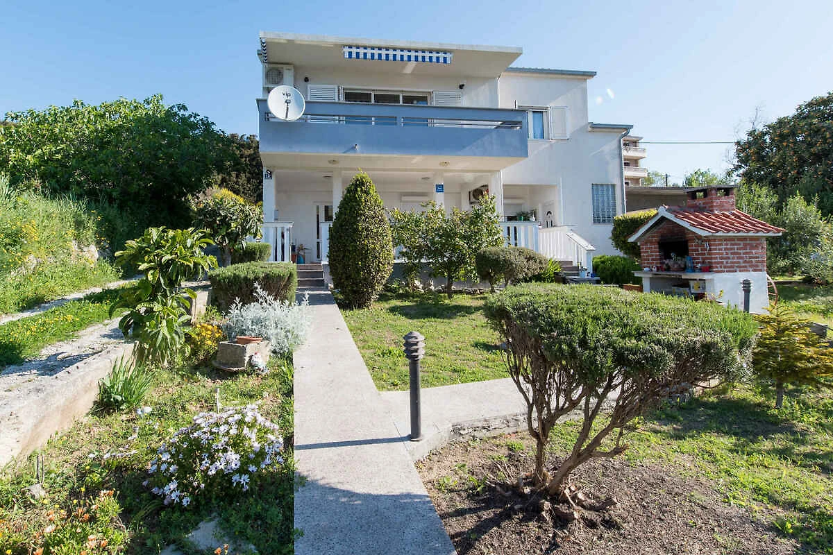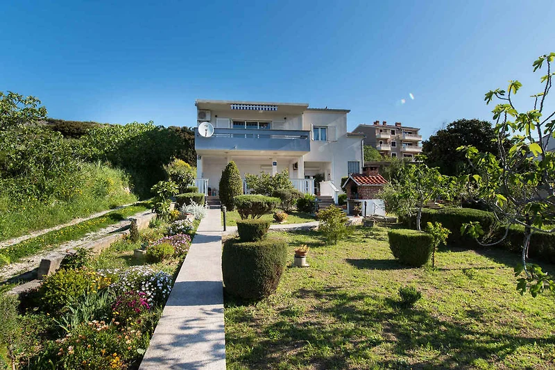 Dividere. L' appartamento vacanze si trova in una trama del giardino aperta con prato, fiori, arbusti e alberi. Il padrone di casa vive nella casa, ma usa un ingresso separato. Parcheggio sulla strada davanti alla casa.