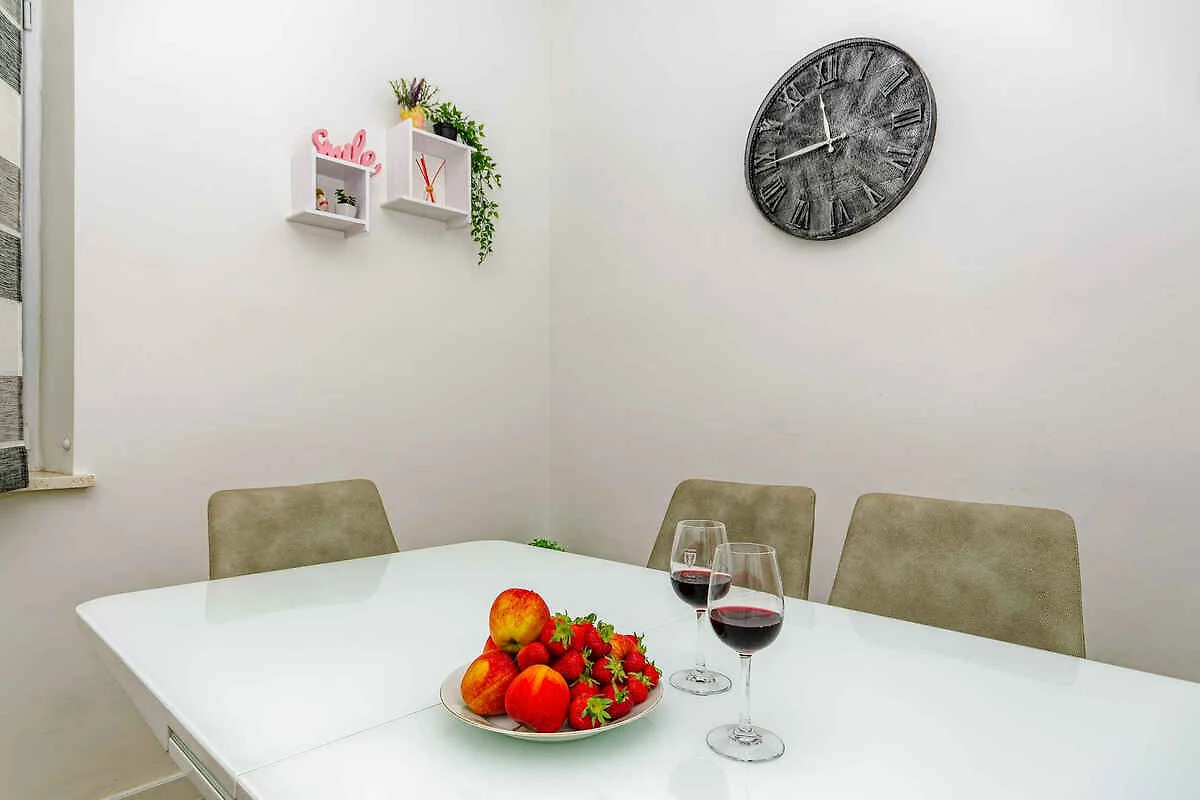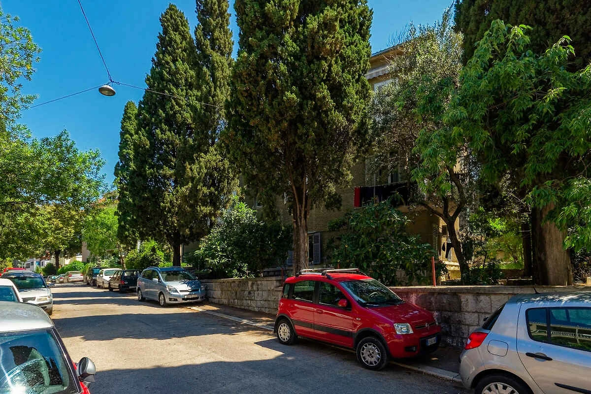 Dividere. L' appartamento vacanze si trova in una trama del giardino chiuso con prato, fiori e alberi, delimitata da una recinzione. Il proprietario non abita nella casa o nella proprietá. L'accesso avviene vicino a una strada secondaria (asfaltata). Parcheggio (per 1 auto) sulla strada davanti alla casa.
