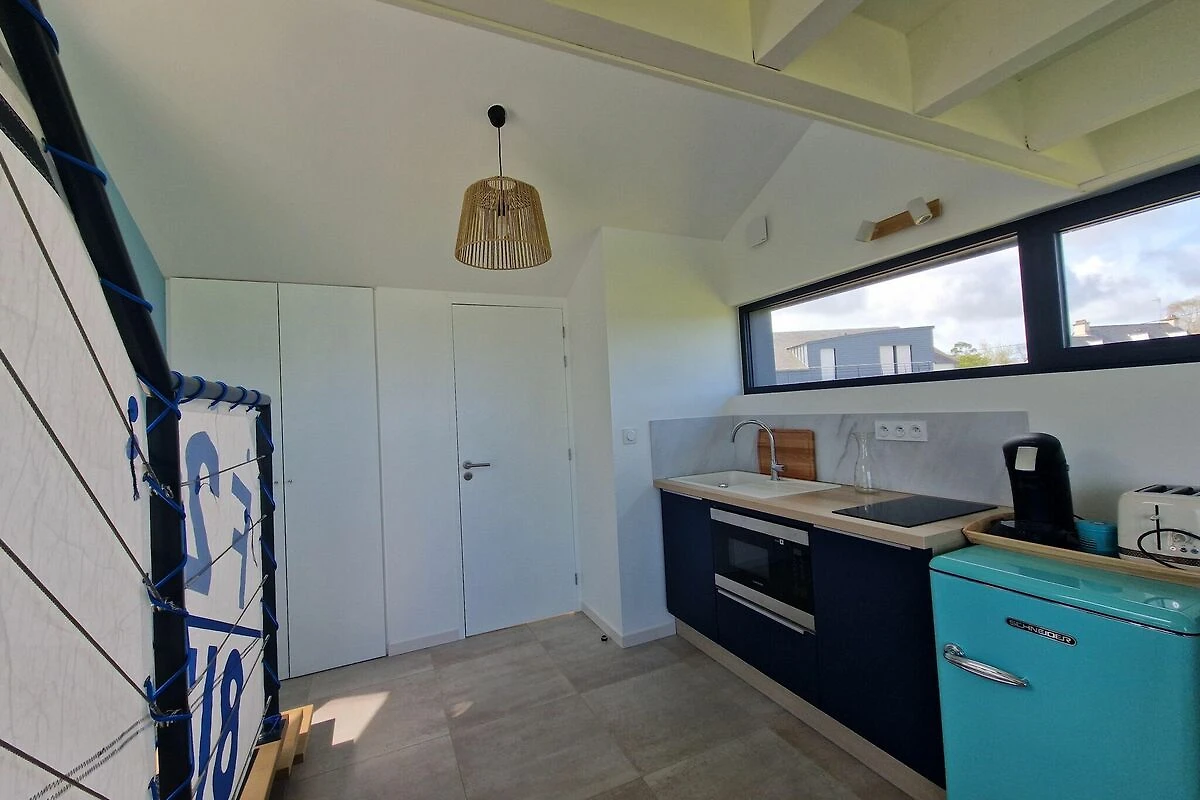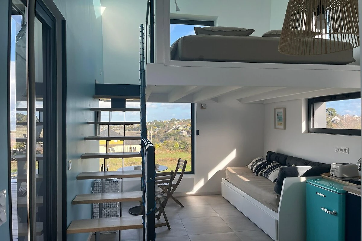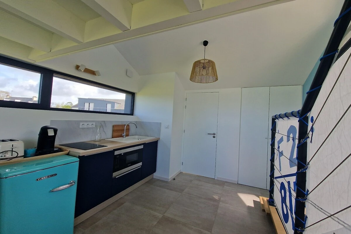 Armadio cucina(bollitore, tostapane, mobile cucina, caffettiera, forno a microonde combinato, frigorifero), Soggiorno / Pranzo, Camera da letto su soppalco aperto(letto matrimoniale), Bagno(doccia, WC), terrazza, giardino, mobili da giardino, parcheggio