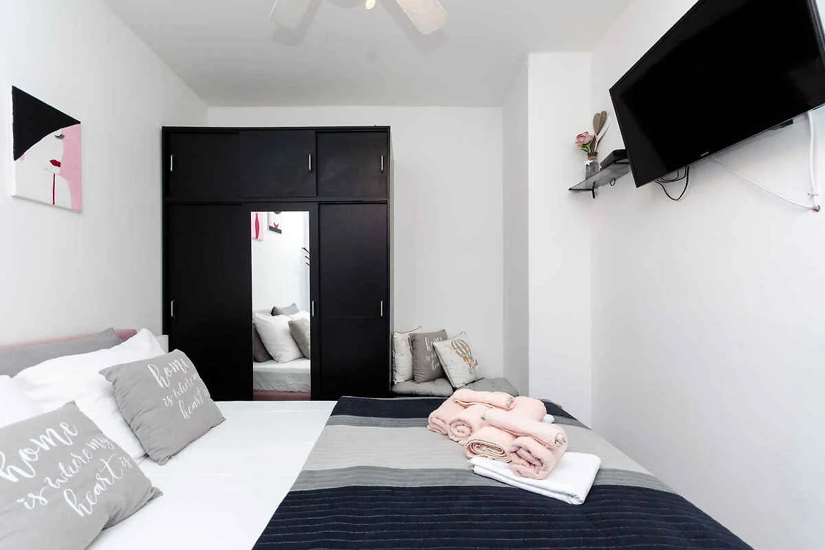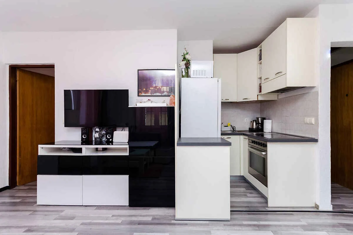 Soggiorno con 2 letti aggiuntivi su divano/sofa, angolo di seduta, TV e zona pranzo. Camera da letto (10 mq) con 1 letto singolo. Camera da letto (12 mq) con 1 letto matrimoniale e TV. La cucinetta nel soggiorno con zona pranzo, fornello elettrico, forno, cappa aspirante, frigorifero (scomparto del ghiaccio), microonde, caffettiera, tostapane e bollitore elettrico. Bagno con lavatrice, doccia, WC e asciugacapelli.