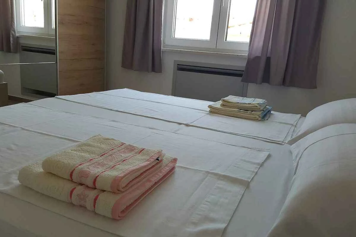 Krk. La distanza dagli alloggi alla spiaggia è 750 me il tipo di spiaggia è di ghiaia con zone prendisole in cemento. In spiaggia potrete poi godervi il mare cristallino e l'aria fresca.