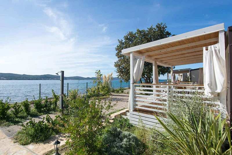 Biograd na Moru. La casa vacanza si trova in un campeggio, in una trama del giardino chiuso, grande 1500 mq con prato e alberi, delimitata da una recinzione e una siepe. L'accesso avviene vicino a una strada secondaria (asfaltata). Parcheggio sulla strada davanti alla casa.