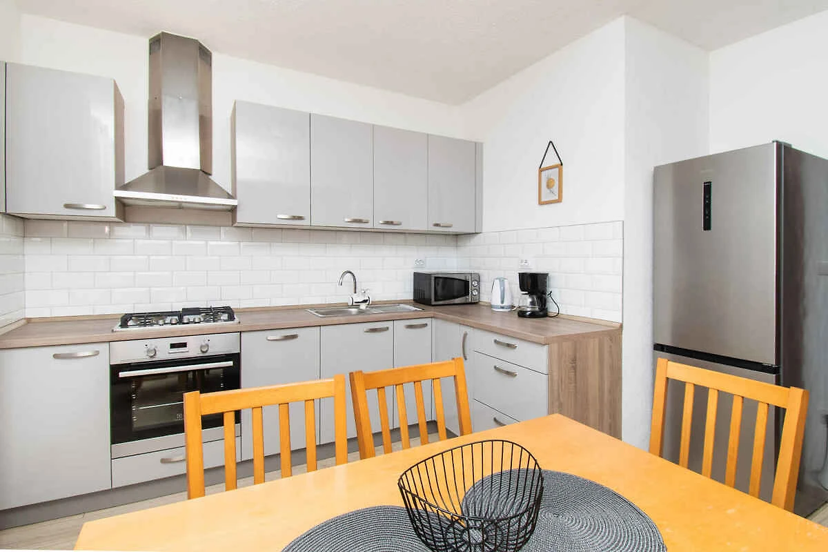 Soggiorno con angolo di seduta e TV. 2 camere da letto tutto a con 1 letto matrimoniale. La cucinetta nel soggiorno con forno, lavastoviglie, frigorifero, microonde, bollitore elettrico e piano cottura. Bagno con doccia e WC.