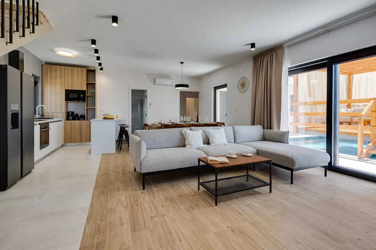 Piano terra: Soggiorno con angolo di seduta, TV e accesso alla terrazza. Camera da letto con 1 letto matrimoniale, TV e accesso al balcone. La cucinetta nel soggiorno con stufa a gas, forno, lavastoviglie, frigorifero (scomparto del ghiaccio), microonde, caffettiera, tostapane e bollitore elettrico.