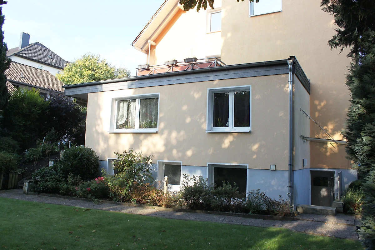 Die FeWo liegt zentral. Der Bahnhof ist ca. 10-15 Gehminuten entfernt, eine zentrale Bushaltestelle (Rathausplatz, wird von vielen Linien angefahren) liegt quasi um die Ecke ebenso ein Einkaufszentrum (Rewe, DM, Aldi...) und in die Fußgängerzone ist es auch nur wenig weiter. Die FeWo liegt im Souterrain, was uns aber nicht gestört hat. Im Garten gibt es einen überdachten Freisitz. Ein kleiner Raum ist abgeteilt und geschlossen, so daß man auch bei kühler Witterung sich raus setzen kann. Wir haben davon aber kaum Gebrauch gemacht, weil wir viel unterwegs waren um die Gegend zu erkunden. Einziges Manko aus unserer Sicht: im Bad ist es ziemlich eng.