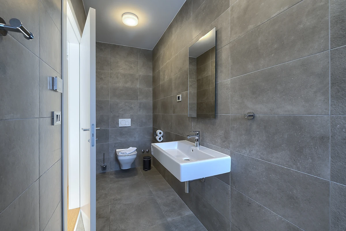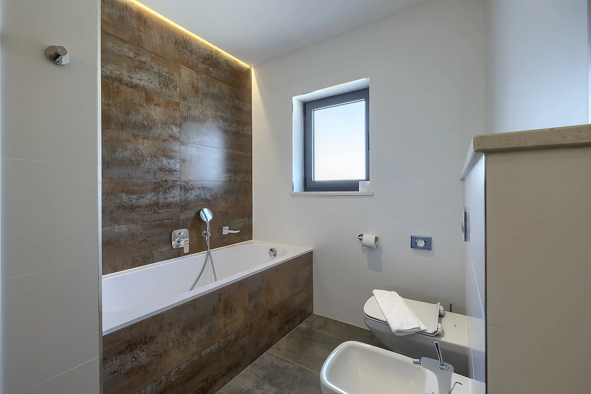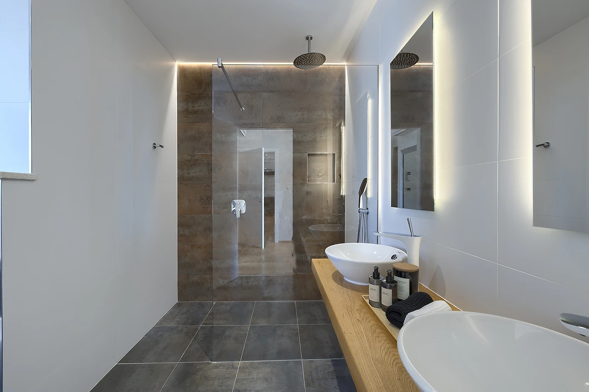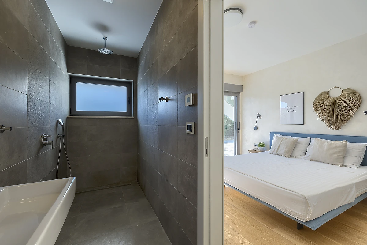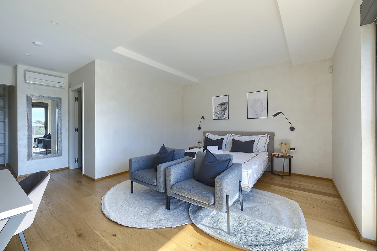 Al primo piano ci sono 3 camere da letto moderne e confortevoli, ognuna con il proprio bagno. Le camere da letto hanno balconi con vista sul tranquillo ambiente circostante.