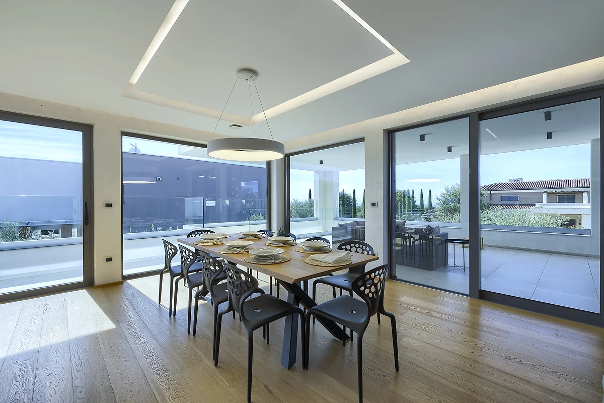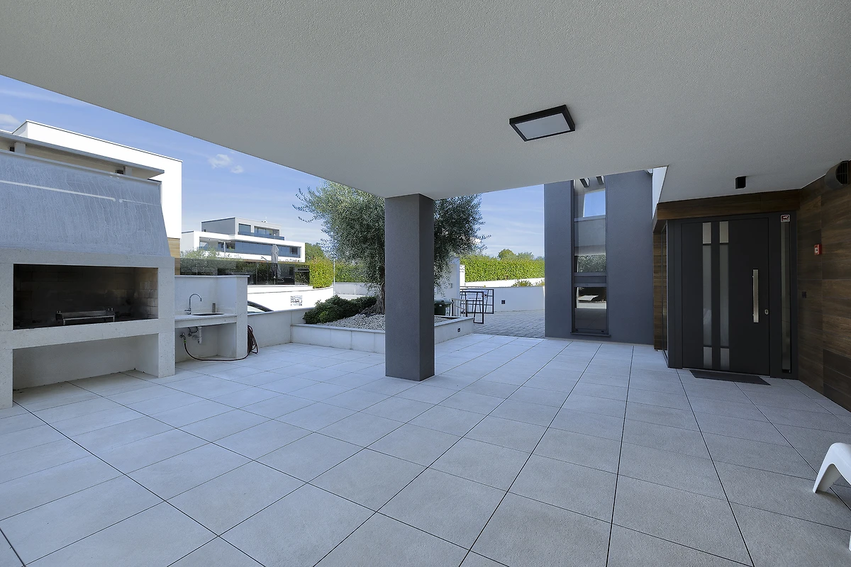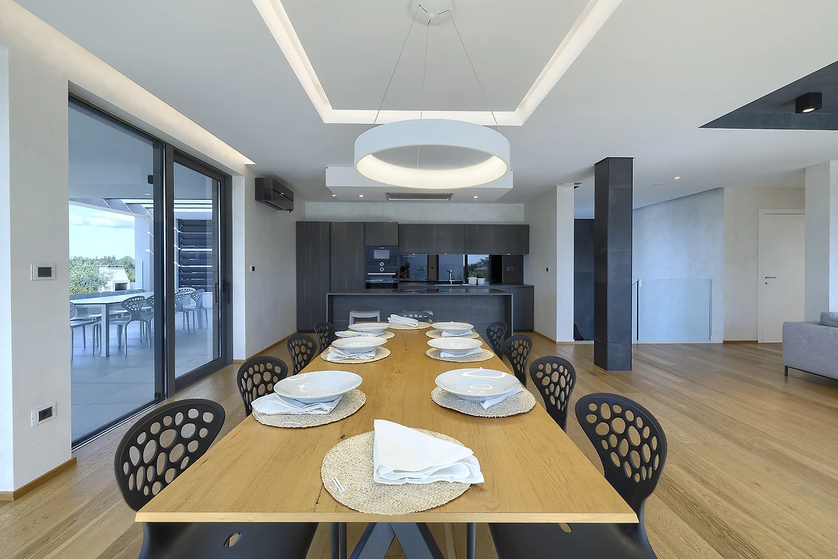 Al primo piano si trova un grande soggiorno aperto con alte pareti di vetro dal pavimento al soffitto e una cucina completamente attrezzata con una bellissima vista sulla piscina e sulla terrazza. La cucina aperta con isola integrata è arredata in modo moderno e stiloso. Ha un'uscita su un'ampia terrazza con un grande tavolo da pranzo e una bellissima vista su un bellissimo ambiente attrezzato. La camera da letto principale si trova anche su questo piano.
