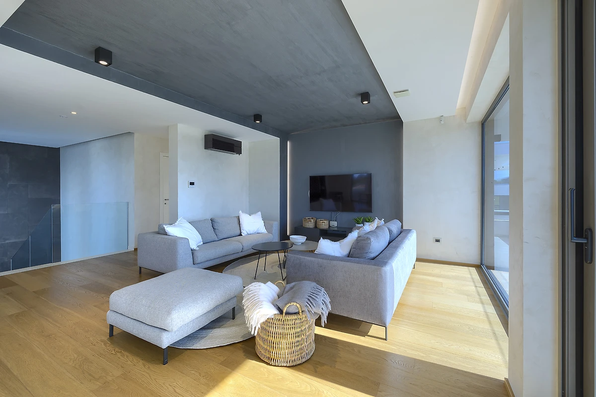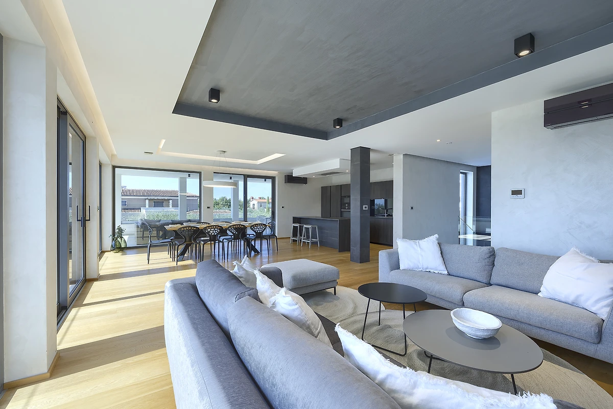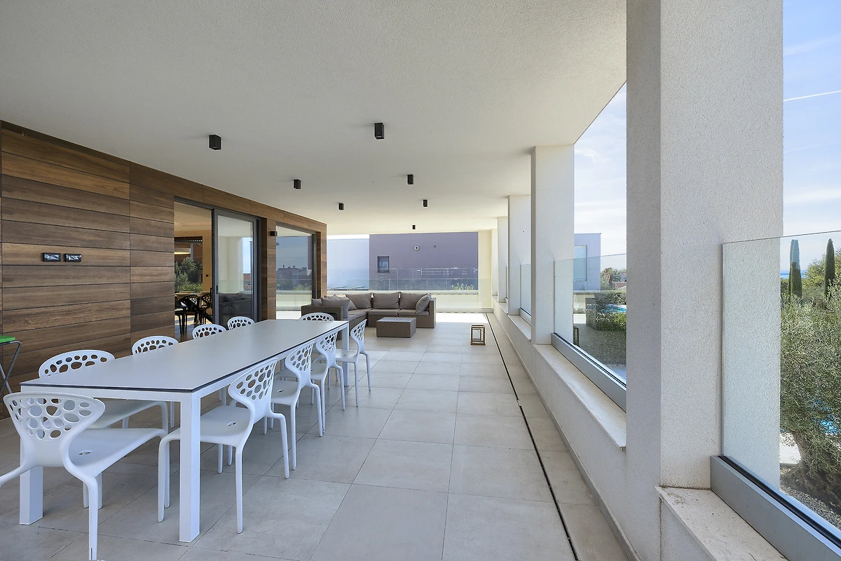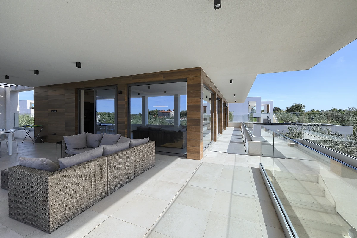 Al primo piano si trova un grande soggiorno aperto con alte pareti di vetro dal pavimento al soffitto e una cucina completamente attrezzata con una bellissima vista sulla piscina e sulla terrazza. La cucina aperta con isola integrata è arredata in modo moderno e stiloso. Ha un'uscita su un'ampia terrazza con un grande tavolo da pranzo e una bellissima vista su un bellissimo ambiente attrezzato. La camera da letto principale si trova anche su questo piano.
