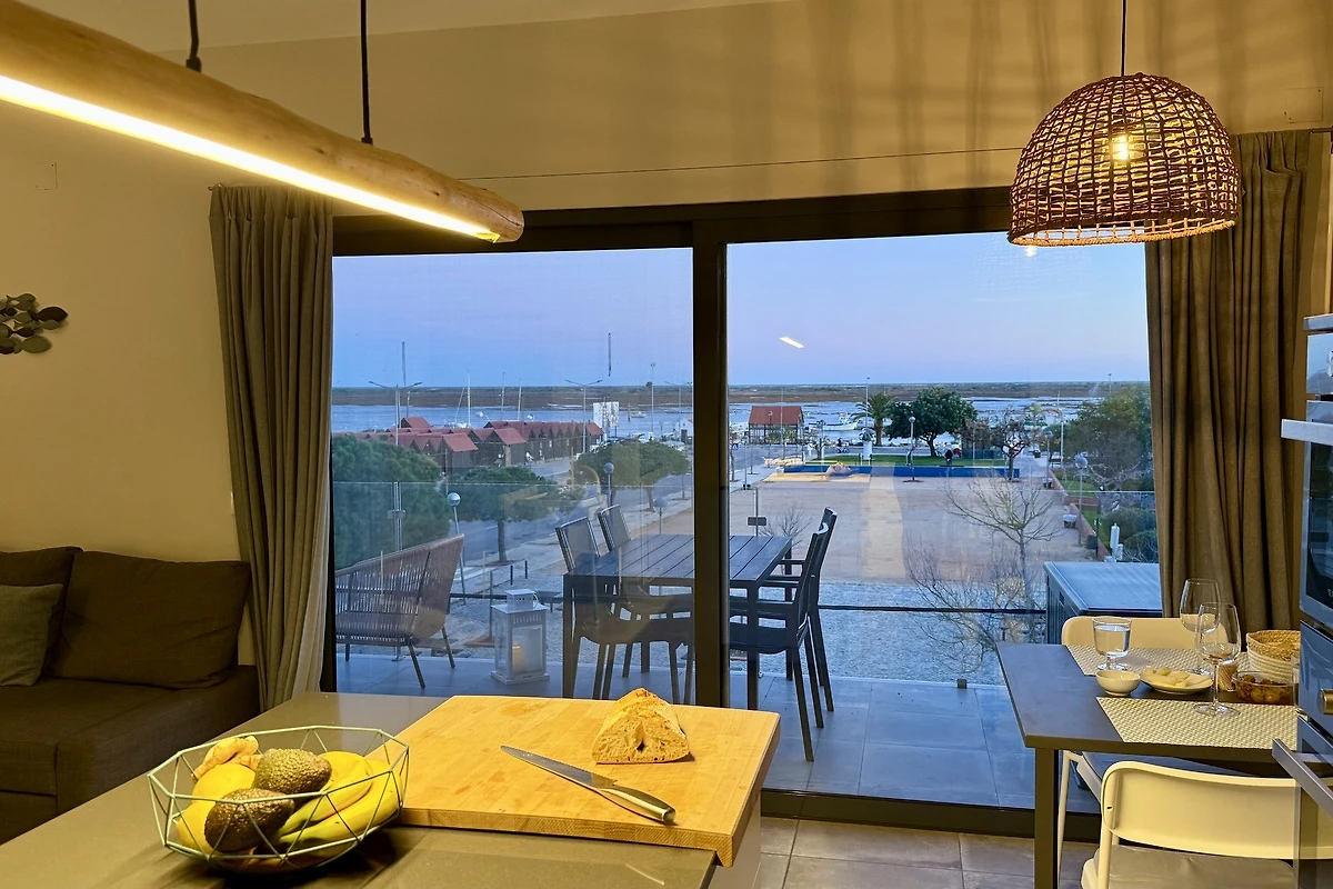 La nostra casa offre una meravigliosa vista sulla Ria Formosa e sul mare. L'appartamento può ospitare fino a 4 persone ed è dotato di due camere da letto, due bagni, una cucina aperta sul soggiorno e un'ampia terrazza. Il design moderno e semplice, con grandi finestre a tutta altezza, offre molta luce e una vista indimenticabile sull'acqua.