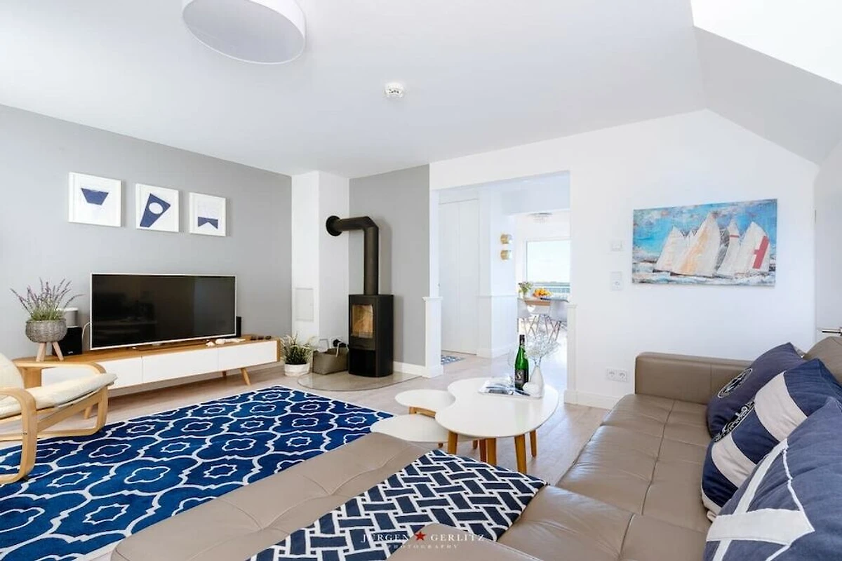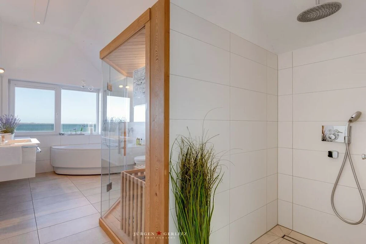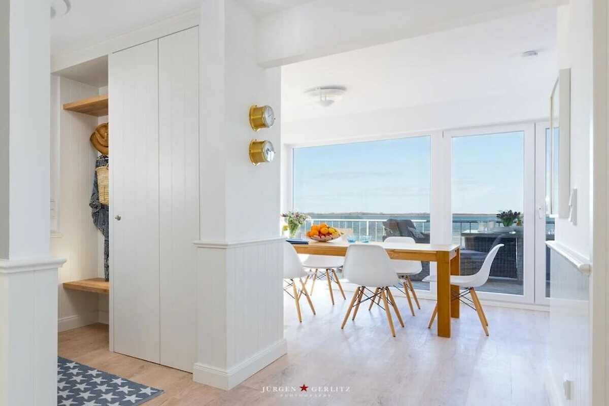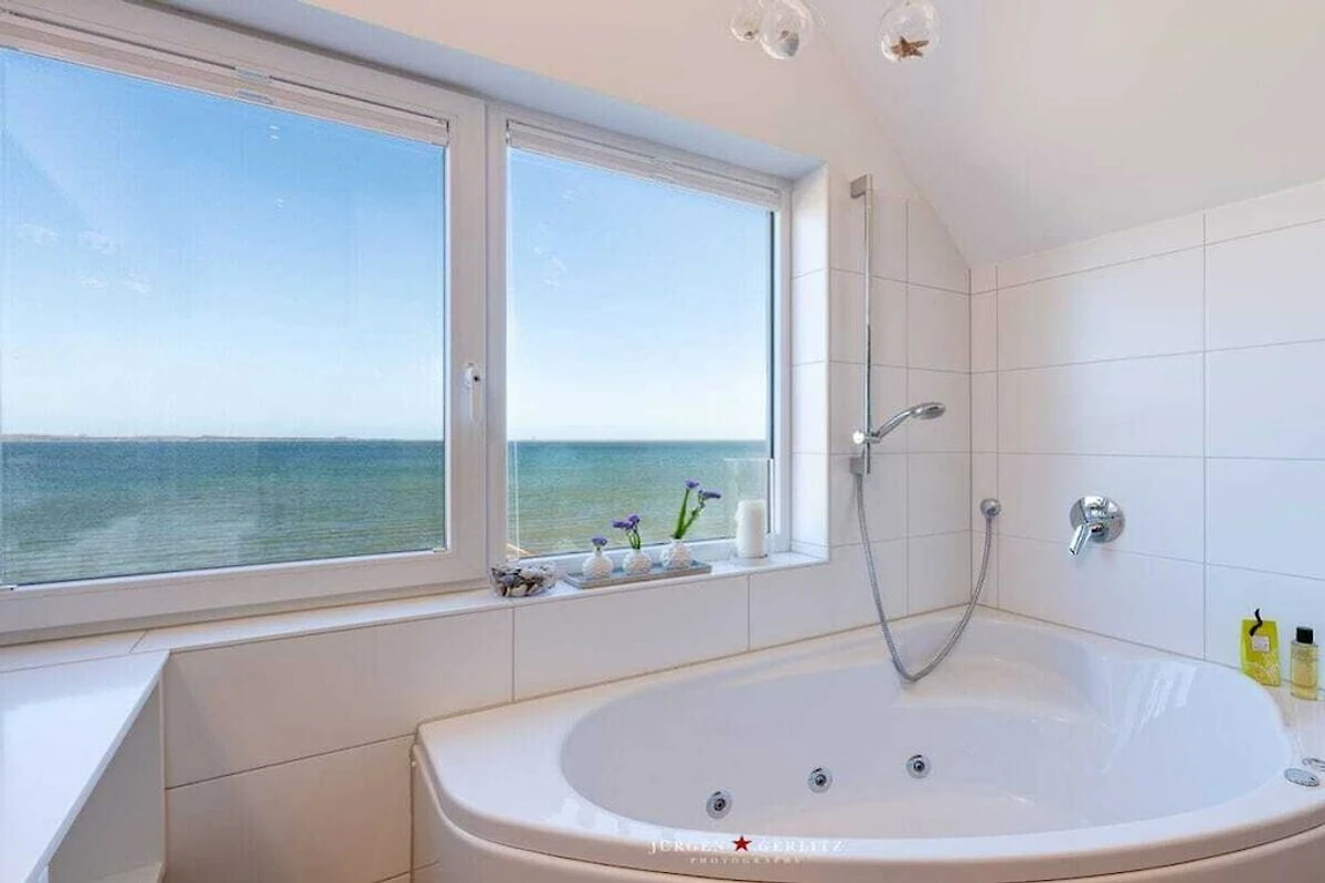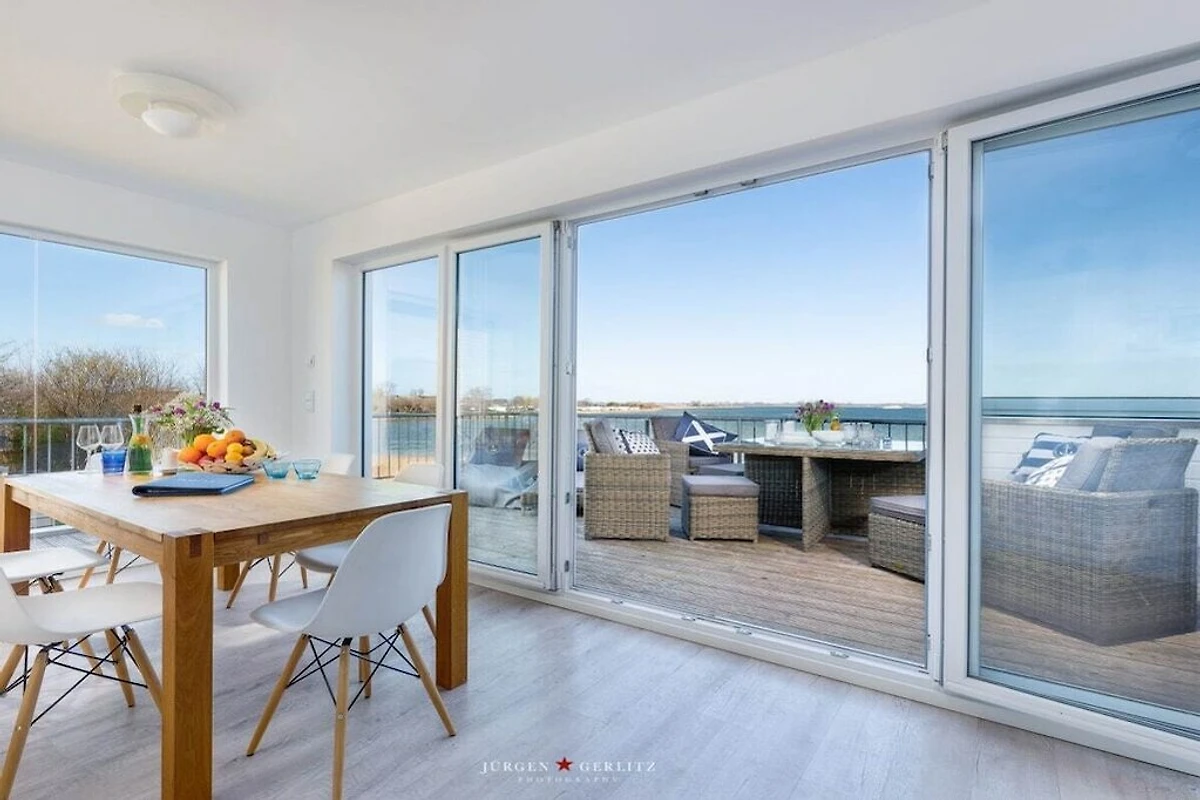 Benvenuti in questo esclusivo appartamento per vacanze nella località baltica di Olpenitz, a soli 20 metri dall'acqua, direttamente sulle rive del braccio Schlei del Mar Baltico. L'appartamento si estende su due piani (1° e 2° piano) ed è stato arredato con mobili di lusso selezionati in stile scandinavo. Appena entrerete sarete accolti da un'atmosfera accogliente. Le finestre panoramiche nella sala da pranzo, nella camera da letto e nell'ampio bagno offrono una vista panoramica mozzafiato sulle barche a vela che passano e sul pittoresco estuario. Il grande ponte offre il luogo perfetto per rilassarsi e godersi la vista sull'acqua. Puoi anche sperimentare la bellezza dei dintorni dalle finestre panoramiche del soggiorno. Un camino non solo aggiunge intimità alla zona giorno, ma crea anche un'atmosfera calda e invitante. C'è anche un secondo balcone a vostra disposizione, dal quale si gode una vista sul verde. Il clou assoluto di questo appartamento vi aspetta all'ultimo piano: un bagno benessere che colpisce con vasca idromassaggio, doccia a pioggia e sauna finlandese privata in vetro con vista sull'acqua. Qui potrete rilassarvi perfettamente e lasciarvi alle spalle la vita di tutti i giorni. Sullo stesso piano si trovano le due camere da letto, che colpiscono per i comodi letti matrimoniali, l'ampio spazio di stivaggio e la fantastica vista sull'acqua o sulla campagna. Questo elegante appartamento offre spazio per un massimo di 4 persone grazie a un letto supplementare.