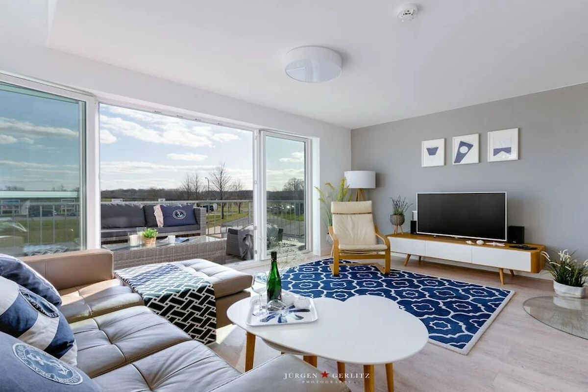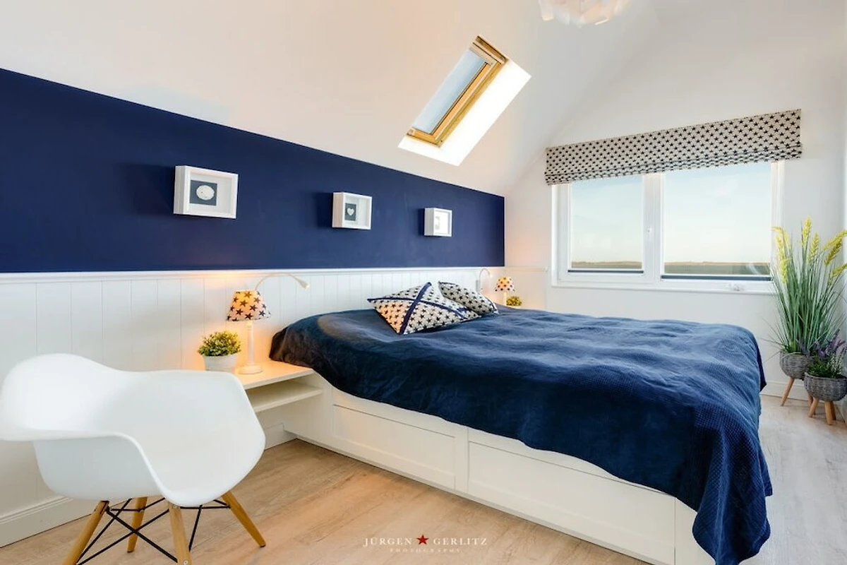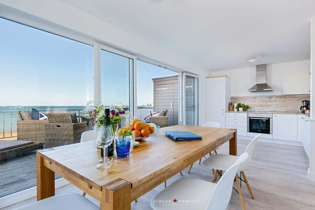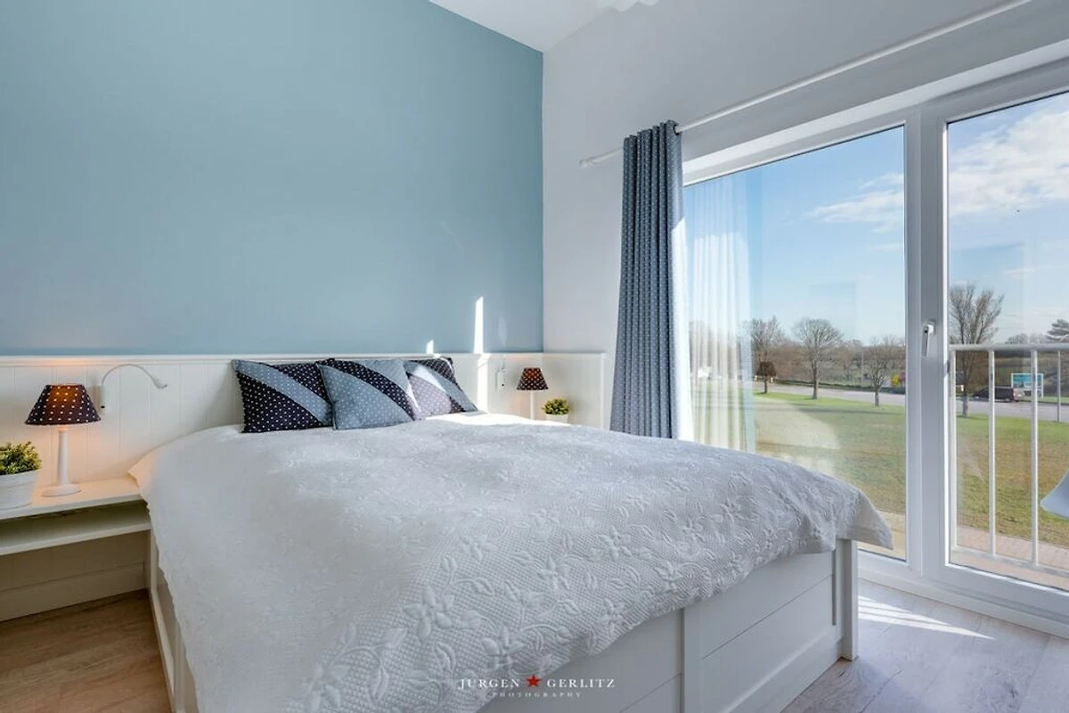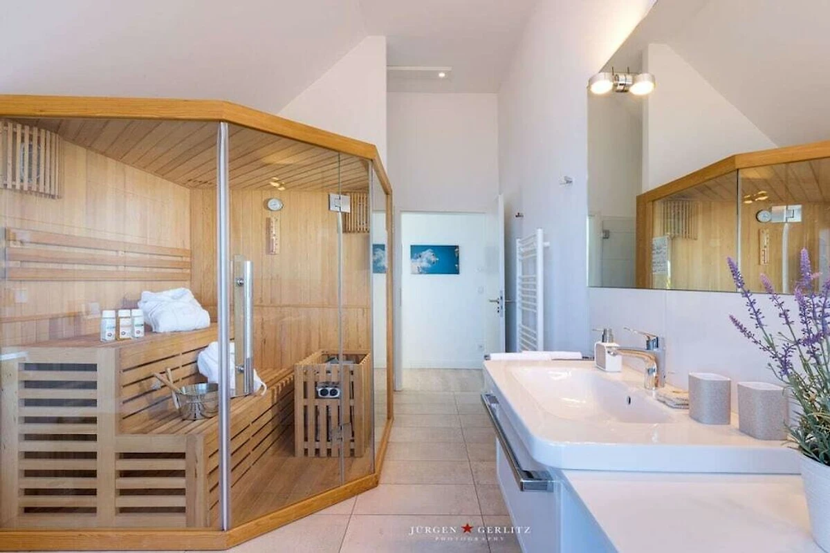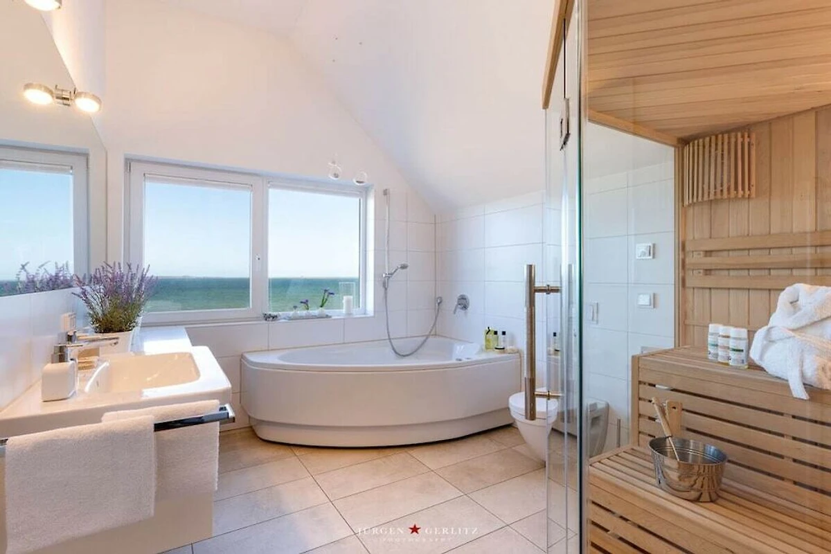 Benvenuti in questo esclusivo appartamento per vacanze nella località baltica di Olpenitz, a soli 20 metri dall'acqua, direttamente sulle rive del braccio Schlei del Mar Baltico. L'appartamento si estende su due piani (1° e 2° piano) ed è stato arredato con mobili di lusso selezionati in stile scandinavo. Appena entrerete sarete accolti da un'atmosfera accogliente. Le finestre panoramiche nella sala da pranzo, nella camera da letto e nell'ampio bagno offrono una vista panoramica mozzafiato sulle barche a vela che passano e sul pittoresco estuario. Il grande ponte offre il luogo perfetto per rilassarsi e godersi la vista sull'acqua. Puoi anche sperimentare la bellezza dei dintorni dalle finestre panoramiche del soggiorno. Un camino non solo aggiunge intimità alla zona giorno, ma crea anche un'atmosfera calda e invitante. C'è anche un secondo balcone a vostra disposizione, dal quale si gode una vista sul verde. Il clou assoluto di questo appartamento vi aspetta all'ultimo piano: un bagno benessere che colpisce con vasca idromassaggio, doccia a pioggia e sauna finlandese privata in vetro con vista sull'acqua. Qui potrete rilassarvi perfettamente e lasciarvi alle spalle la vita di tutti i giorni. Sullo stesso piano si trovano le due camere da letto, che colpiscono per i comodi letti matrimoniali, l'ampio spazio di stivaggio e la fantastica vista sull'acqua o sulla campagna. Questo elegante appartamento offre spazio per un massimo di 4 persone grazie a un letto supplementare.