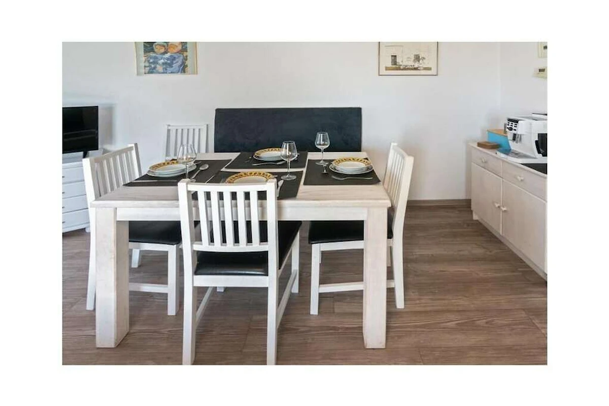 All'interno ci si può aspettare un piacevole ambiente abitativo con una zona giorno e pranzo combinata, tre camere da letto, un bagno e una toilette per gli ospiti. La proprietà è ideale per una famiglia numerosa con un massimo di quattro adulti e due bambini. La zona giorno è stata progettata per essere accogliente. Con una comoda area salotto composta da due divani e una zona TV, è l'ideale per guardare la TV o giocare insieme. Dalla zona giorno si accede direttamente anche al terrazzo. È esposta a ovest ed è quindi perfetta per godersi gli ultimi raggi di sole e concludere la giornata in un'atmosfera accogliente. I posti a sedere all'aperto sono progettati per quattro persone.