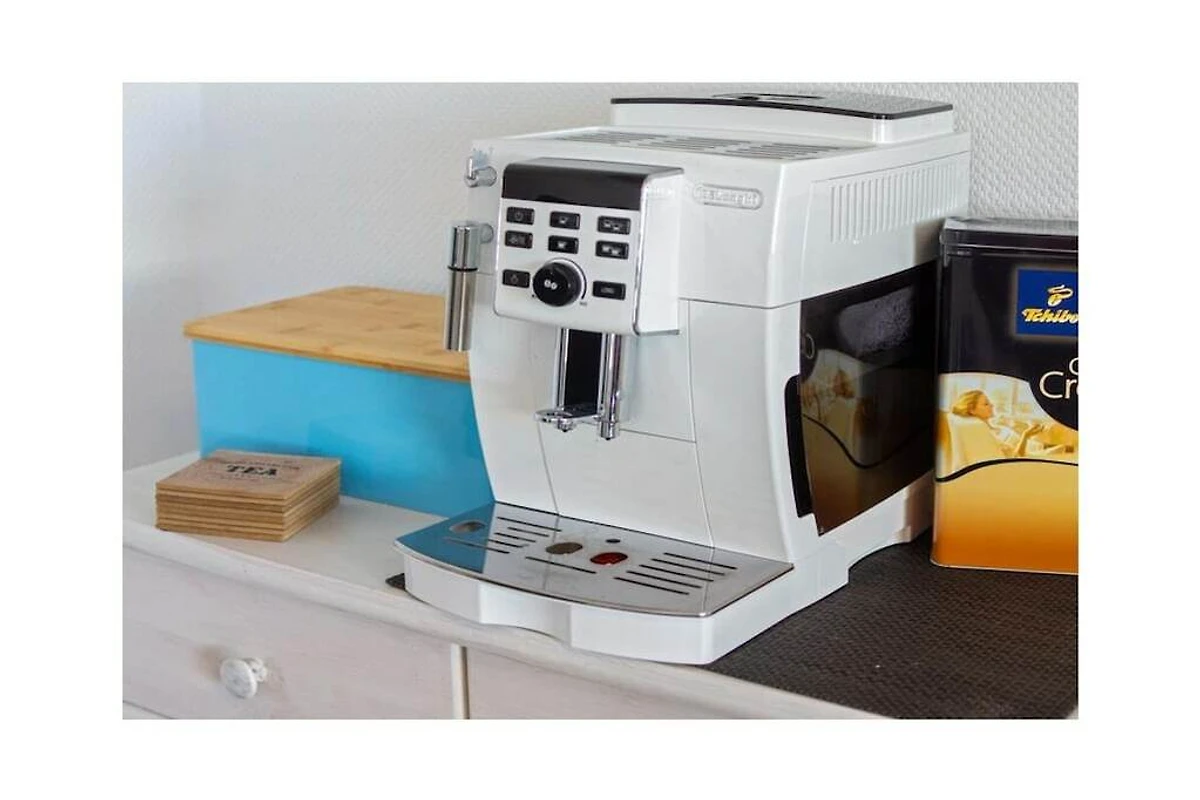 La cucina e la zona pranzo sono adiacenti alla zona giorno in un'architettura aperta. La cucina è dotata di tutto il necessario per cucinare insieme. Questi includono il fornello con quattro punti cottura, il forno, una macchina per il caffè con filtro, una macchina per il caffè in cialde, un frigorifero, un forno a microonde, un tostapane, un cuociuova, nonché sufficienti utensili per cucinare e mangiare e posate. I pasti, no
