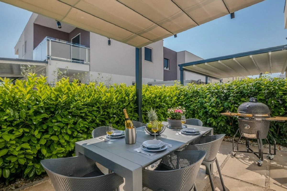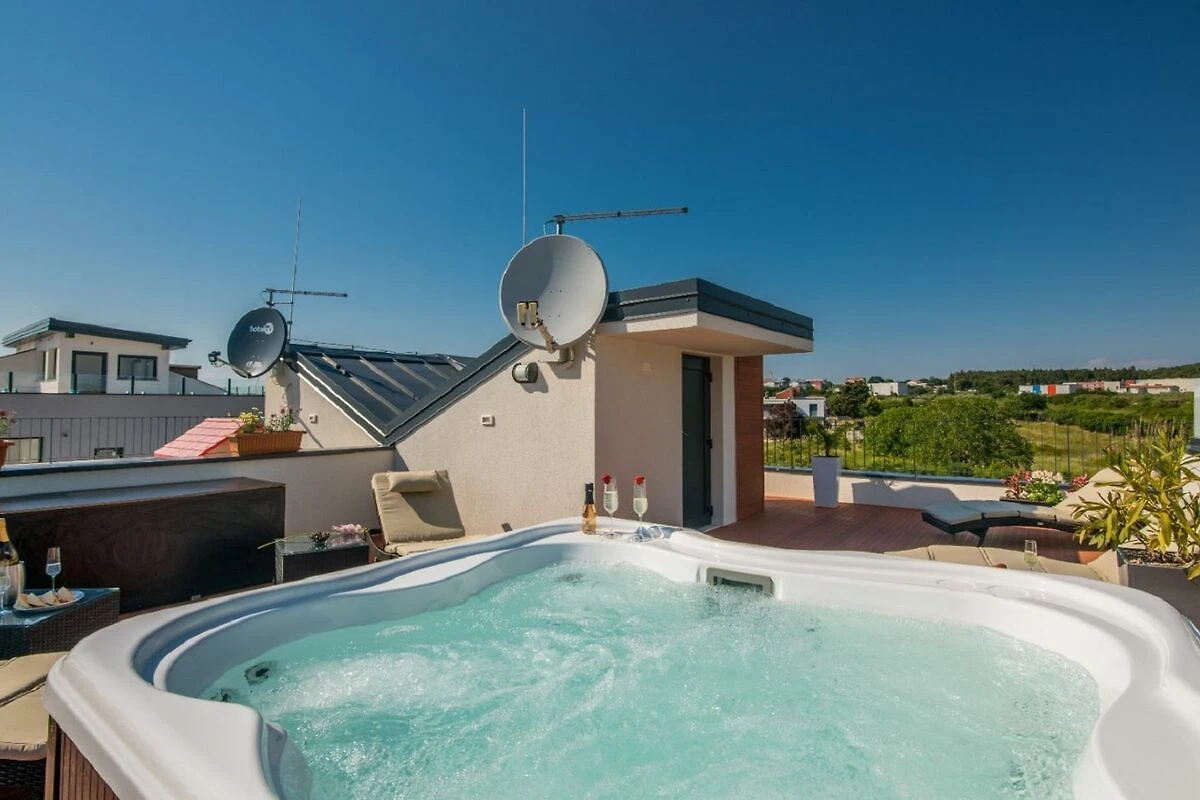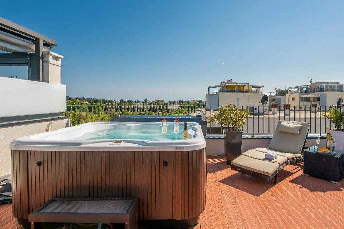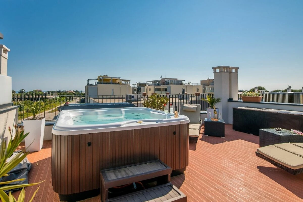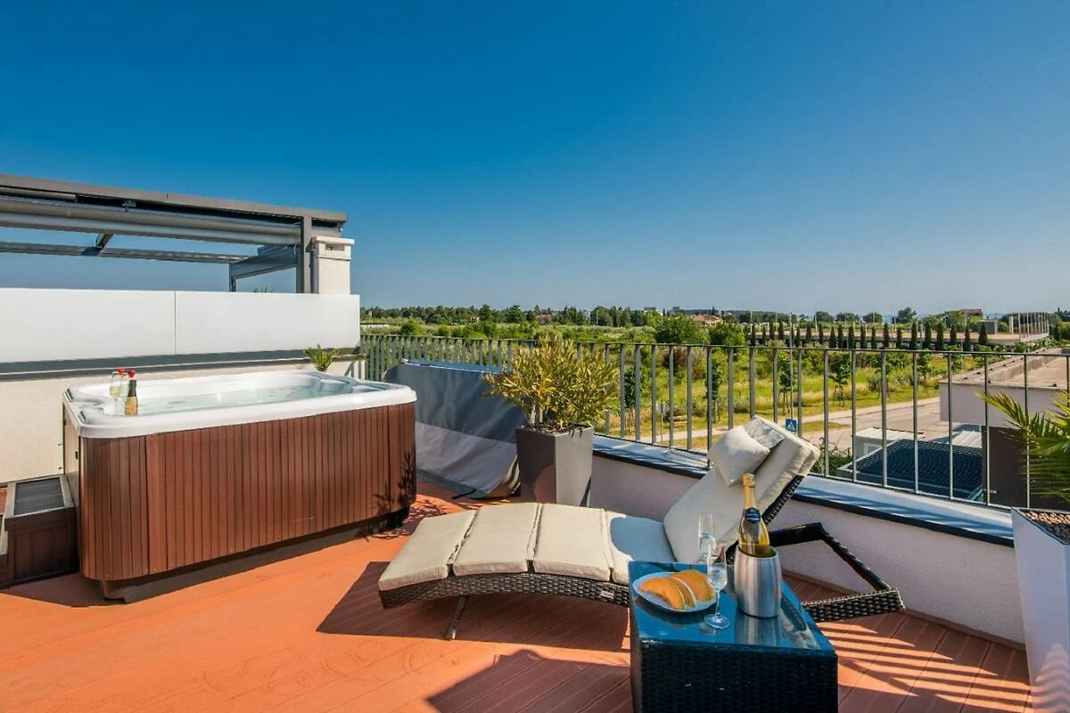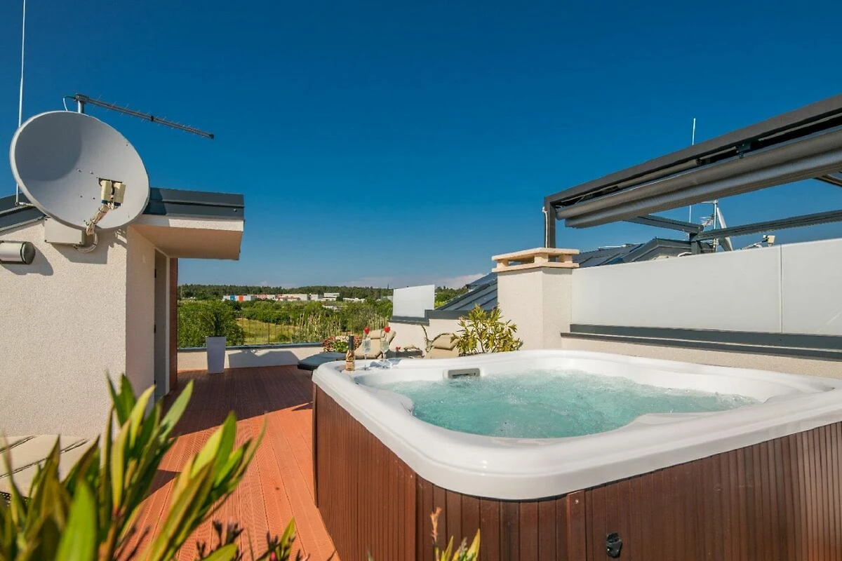 Benvenuti in questa oasi di pace e lusso nel cuore di Cittanova! La nostra incantevole casa offre tutto il necessario per una vacanza perfetta in Istria. Distribuita su tre piani, questa elegante casa può ospitare fino a sei persone e vi permette di trascorrere insieme momenti indimenticabili. Al piano terra, siete accolti da un ampio soggiorno che conduce a una piacevole terrazza, ideale per serate rilassanti o per un caffè mattutino con vista sulla campagna circostante. La cucina con sala da pranzo è dotata di tutto il necessario per preparare pasti deliziosi. C'è anche una camera matrimoniale con bagno privato, che offre intimità e comfort. Al primo piano si trovano altre due eleganti camere da letto, ognuna con il proprio carattere: una con un comodo letto matrimoniale e bagno privato, l'altra con un comodo letto a castello, perfetto per bambini o amici. Inoltre, al primo piano si trovano una seconda cucina e un bagno con vasca, che offrono ulteriore funzionalità e comfort. Ma la vera magia avviene sulla terrazza sul tetto, dove troverete una vasca idromassaggio e comode sedie a sdraio. Lasciatevi coccolare dalle acque rinfrescanti della vasca idromassaggio mentre vi godete la vista panoramica sui tetti circostanti e sul tramonto.