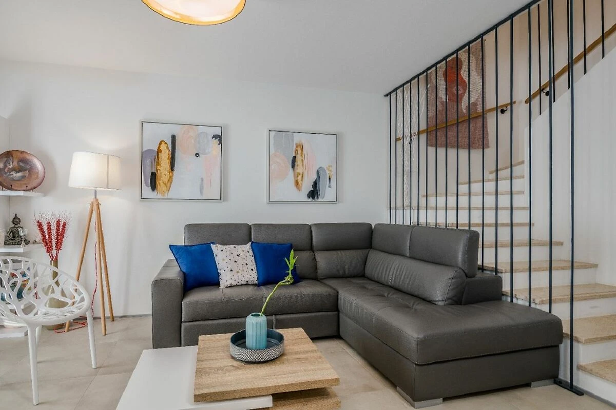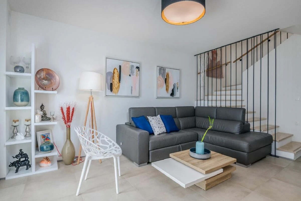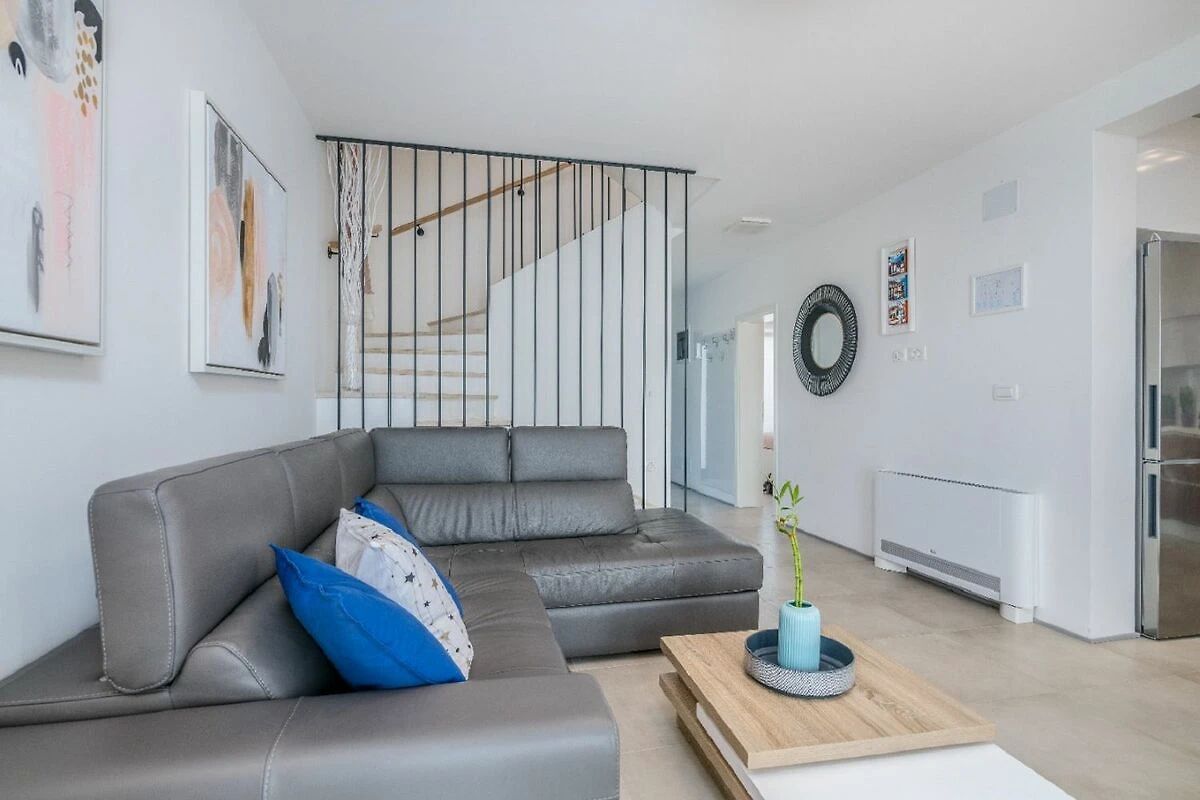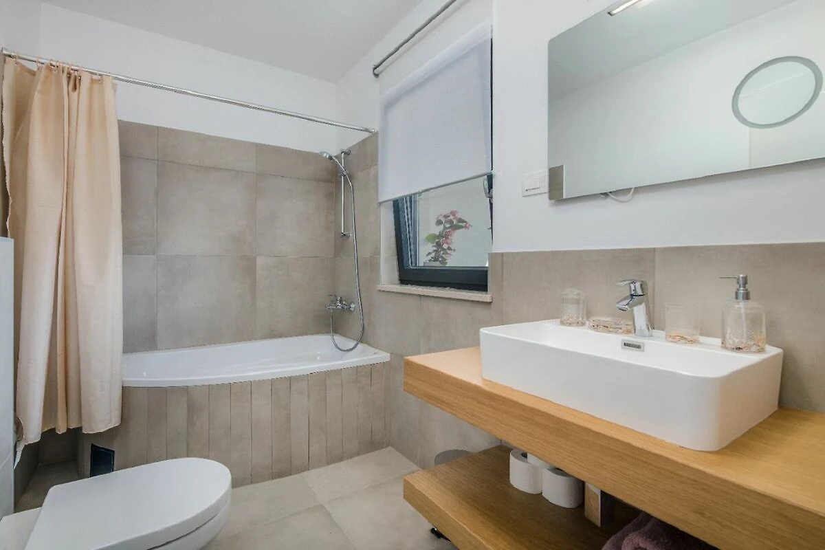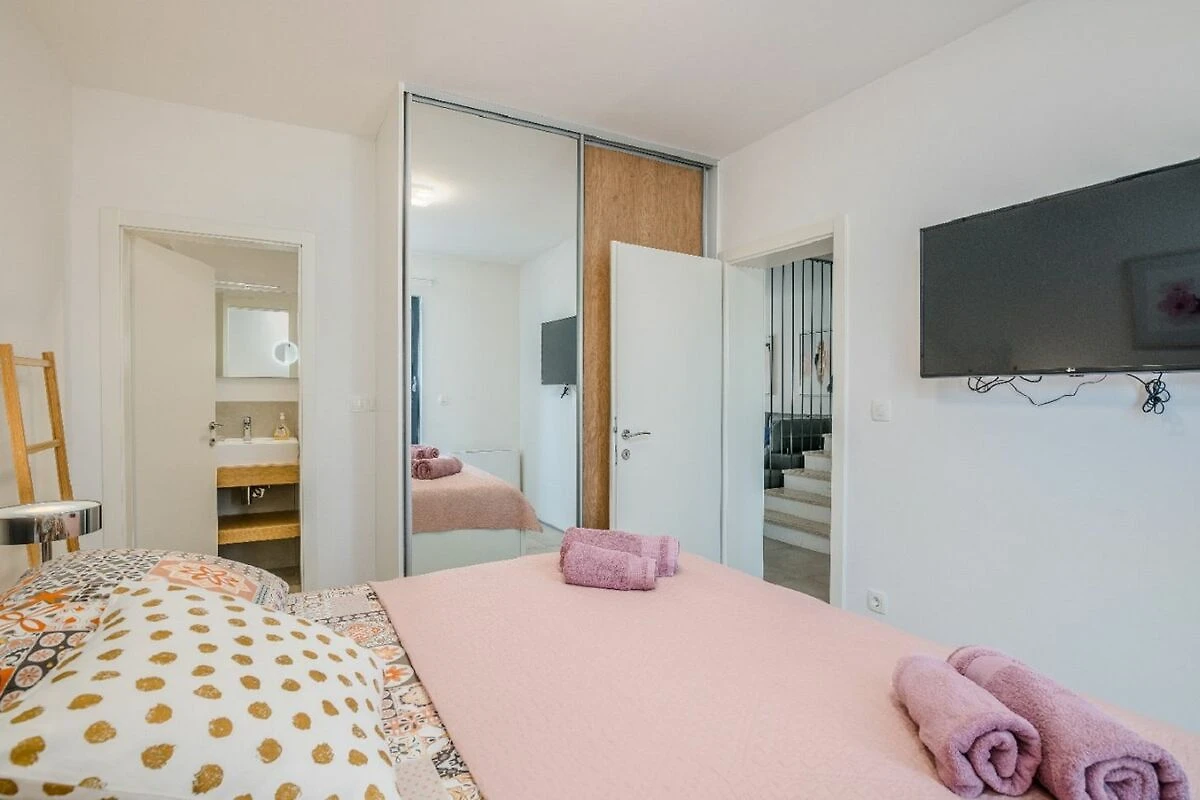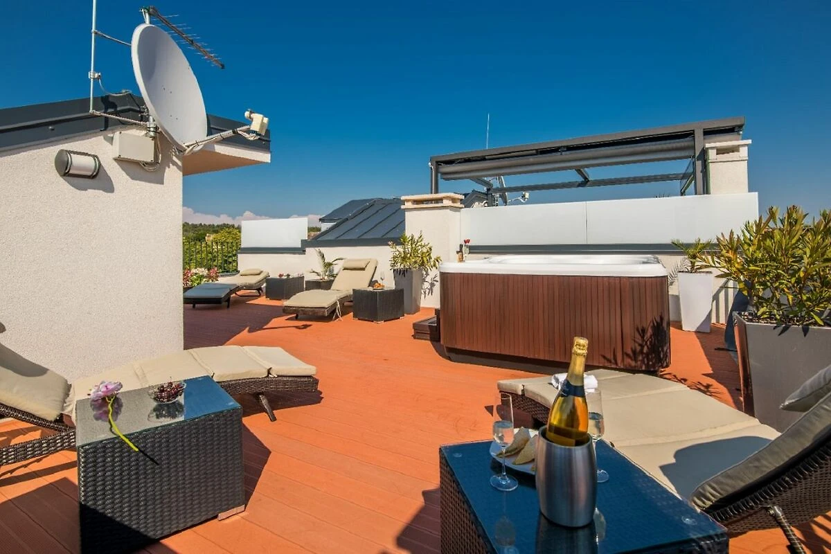 Benvenuti in questa oasi di pace e lusso nel cuore di Cittanova! La nostra incantevole casa offre tutto il necessario per una vacanza perfetta in Istria. Distribuita su tre piani, questa elegante casa può ospitare fino a sei persone e vi permette di trascorrere insieme momenti indimenticabili. Al piano terra, siete accolti da un ampio soggiorno che conduce a una piacevole terrazza, ideale per serate rilassanti o per un caffè mattutino con vista sulla campagna circostante. La cucina con sala da pranzo è dotata di tutto il necessario per preparare pasti deliziosi. C'è anche una camera matrimoniale con bagno privato, che offre intimità e comfort. Al primo piano si trovano altre due eleganti camere da letto, ognuna con il proprio carattere: una con un comodo letto matrimoniale e bagno privato, l'altra con un comodo letto a castello, perfetto per bambini o amici. Inoltre, al primo piano si trovano una seconda cucina e un bagno con vasca, che offrono ulteriore funzionalità e comfort. Ma la vera magia avviene sulla terrazza sul tetto, dove troverete una vasca idromassaggio e comode sedie a sdraio. Lasciatevi coccolare dalle acque rinfrescanti della vasca idromassaggio mentre vi godete la vista panoramica sui tetti circostanti e sul tramonto.