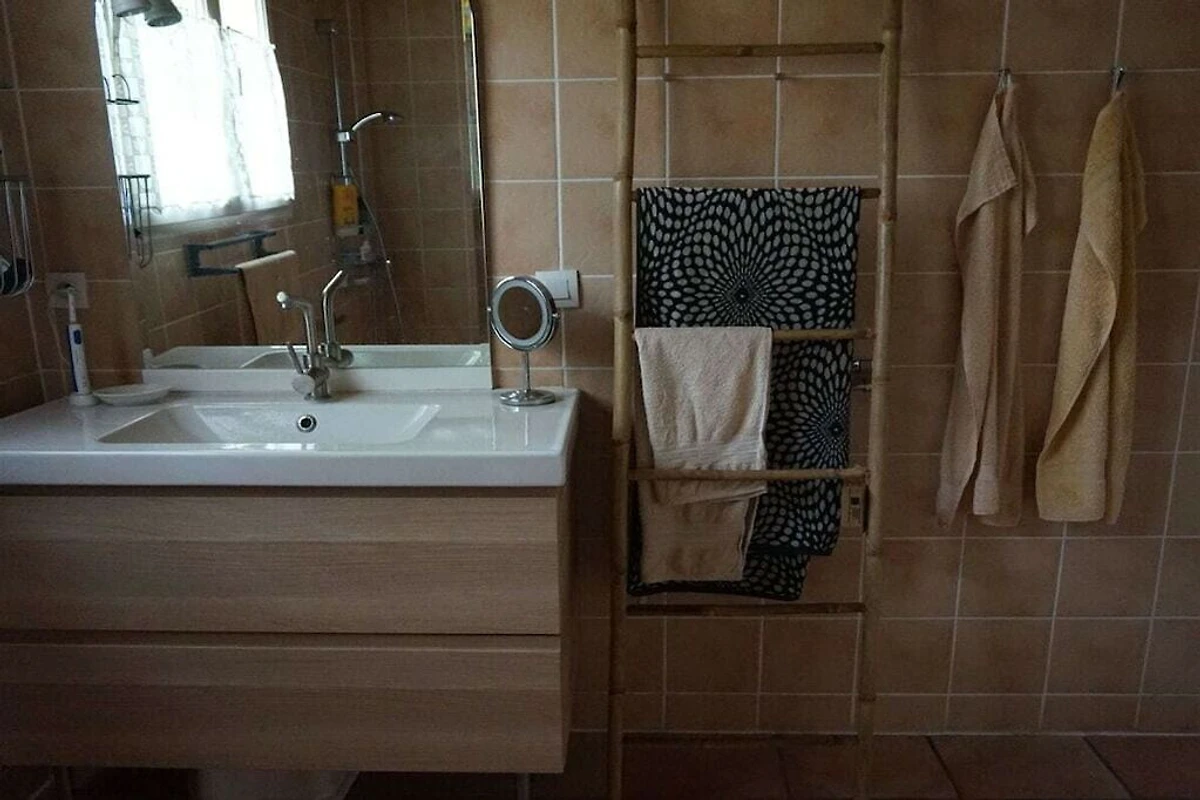 La casa vacanze dispone di un ampio bagno con doccia e di una grande vasca da bagno.