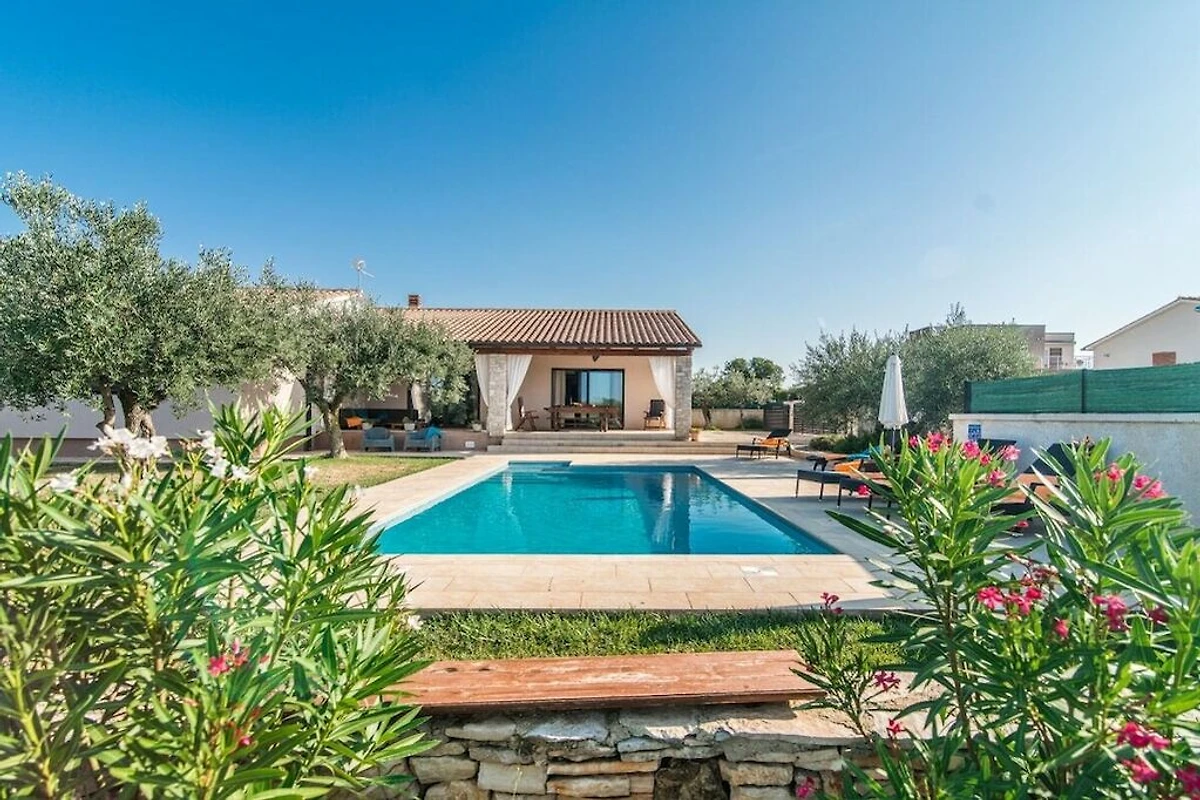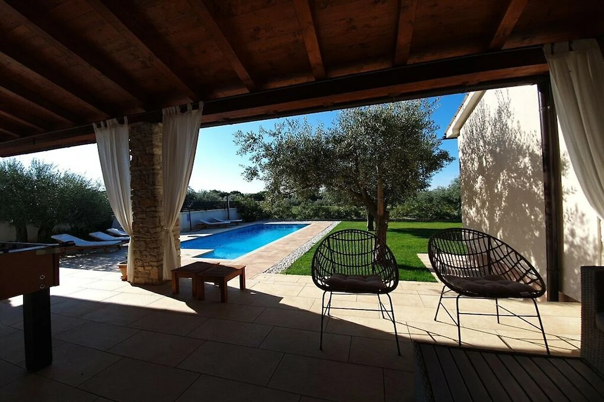 Ideale per famiglie con bambini o un gruppo di amici che cercano una fantastica casa vacanze in Istria. Villa spaziosa e moderna con piscina privata e ampio giardino, tre camere da letto con bagno privato, soggiorno, cucina, un ulteriore bagno, una grande terrazza ombreggiata con vista sulla piscina e parcheggio per due auto in una posizione tranquilla vicino a Pola e Fasana. L'interno della villa con una superficie di 145 m2 comprende 3 camere da letto, un ampio soggiorno a pianta aperta con cucina completamente attrezzata e una zona pranzo.