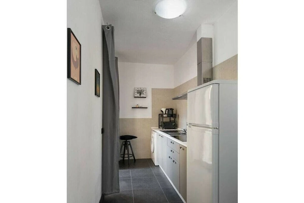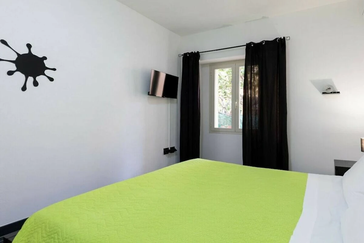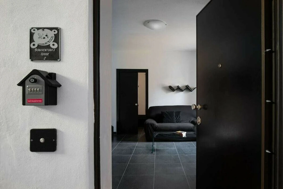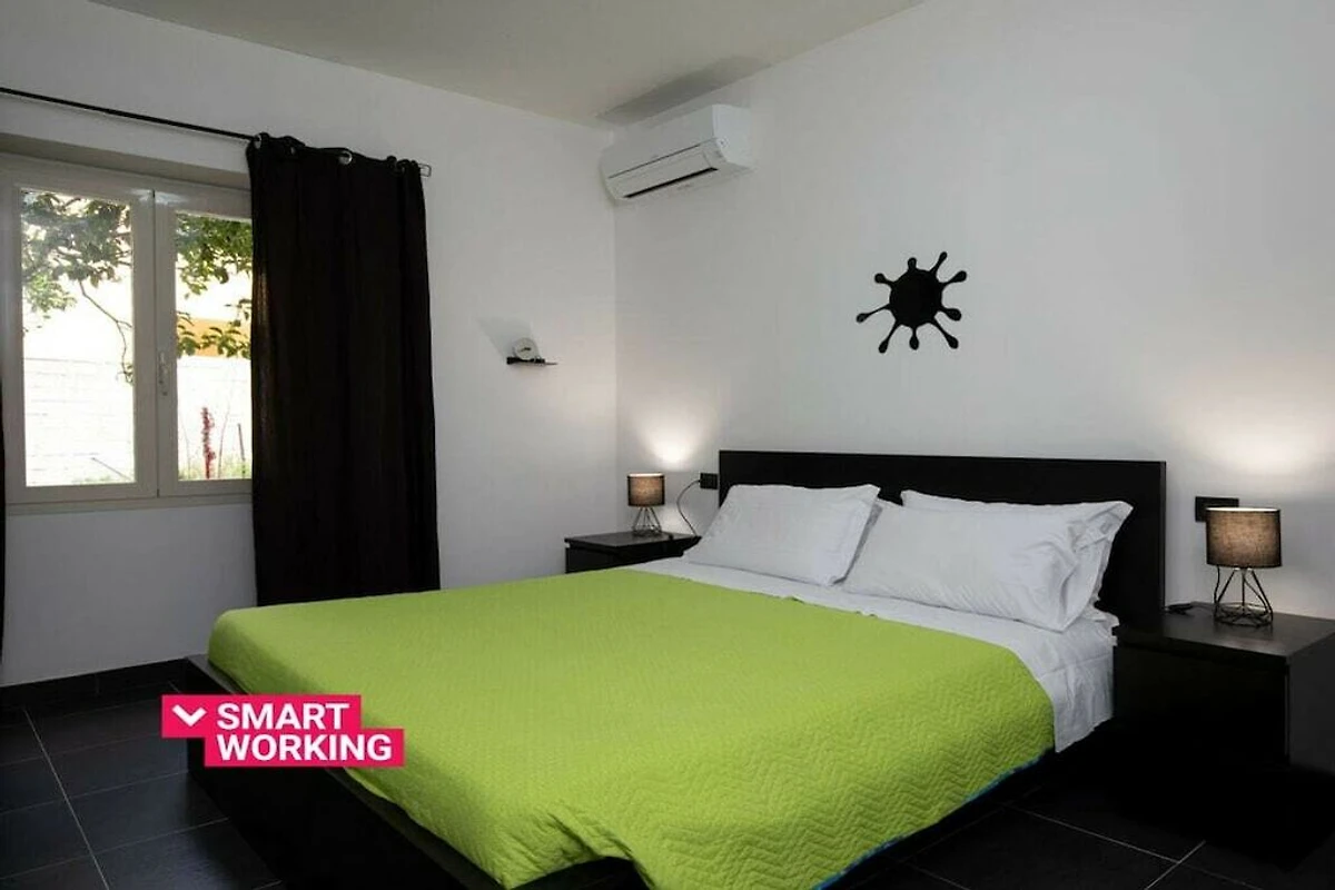 L'appartamento si trova al piano terra e si apre sulla zona giorno, arredata con un divano doppio, una televisione e un tavolo da pranzo. Da qui gli ospiti hanno accesso alla cucina completamente attrezzata con fornelli elettrici, macchina per caffè espresso e bollitore. La zona notte è composta da due camere da letto, entrambe dotate di comodini e armadio: la prima con letto matrimoniale e televisione, la seconda con due letti singoli. Un bagno con doccia completa la struttura.