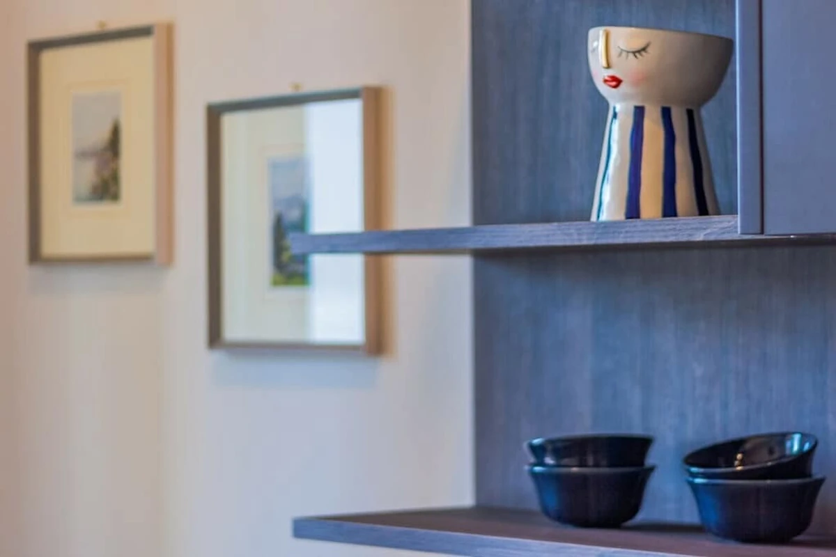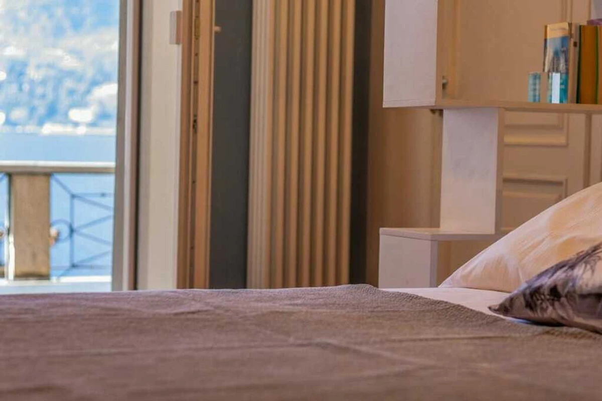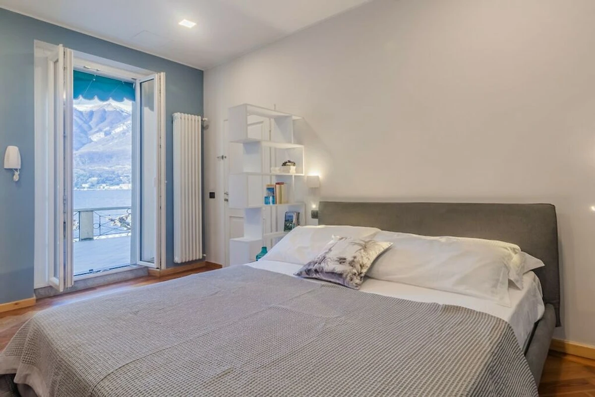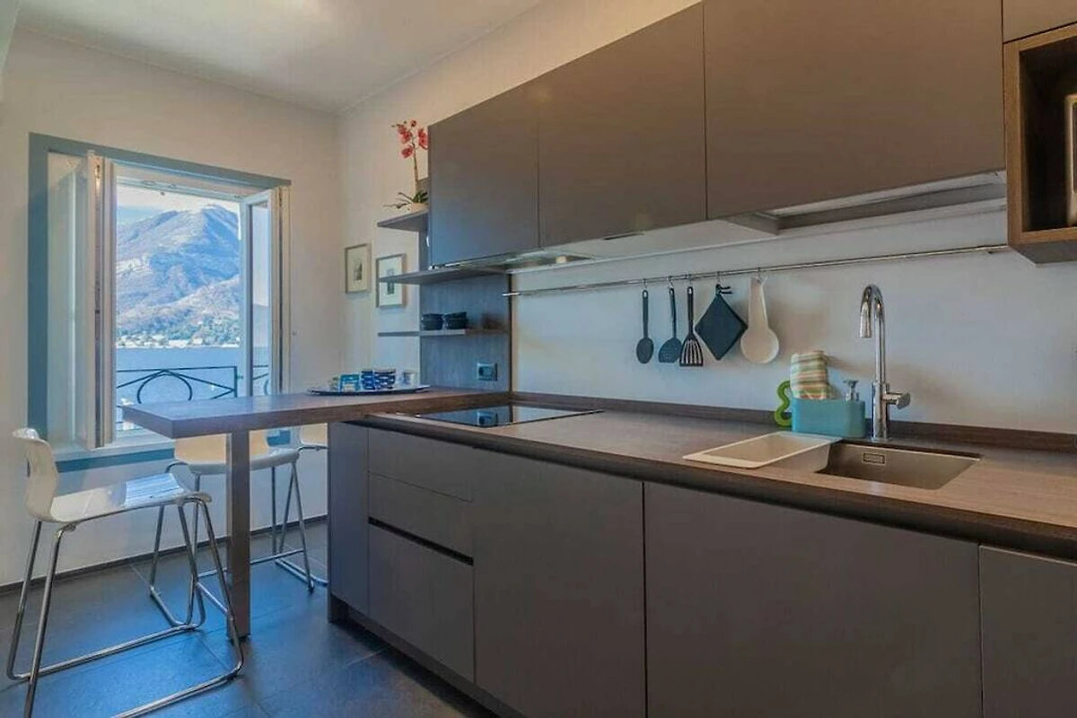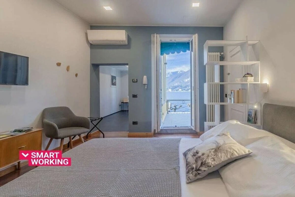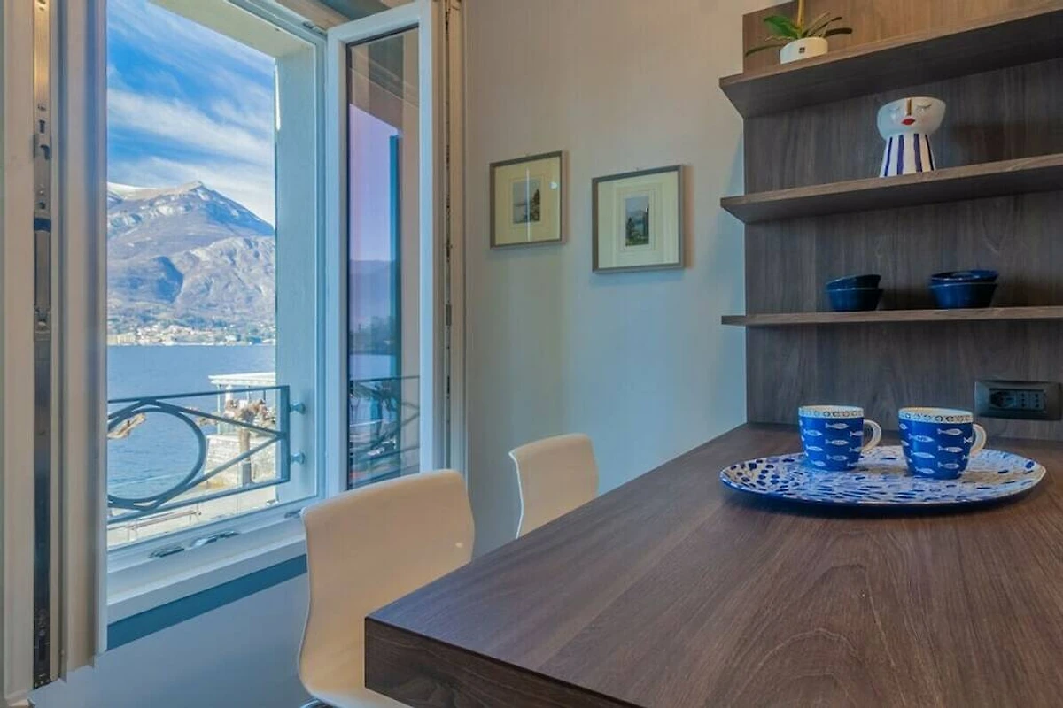 L'appartamento si trova al primo piano di un palazzo storico senza ascensore ed è composto da soggiorno/camera da letto con vista lago. La cucina dispone di un bancone all'americana con sgabelli ed è dotata di lavastoviglie, forno a microonde, bollitore, spremiagrumi, tostapane e macchina per caffè espresso. La zona notte è arredata con un letto matrimoniale, due poltrone e un televisore. Da qui gli ospiti hanno accesso al bagno con doccia e alla bellissima terrazza con tavolo da pranzo e lettini prendisole con vista sul porticciolo e sul lago, dove possono rilassarsi e gustare i pasti all'aperto.