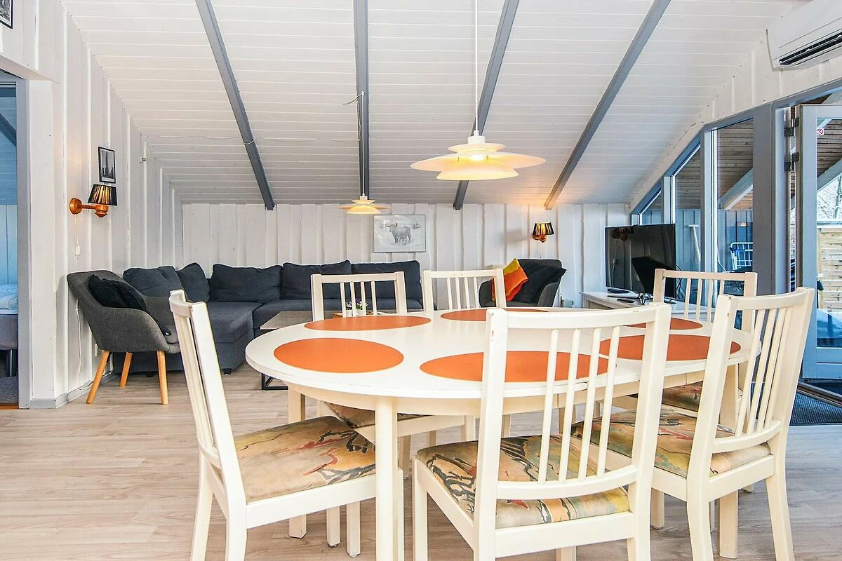 , Cucina separata(mobile cucina(2 fuochi), caffettiera, forno, forno a microonde, lavastoviglie, congelatore(1-59L), frigo con congelatore), Soggiorno/camera da letto(brandina doppia, TV(canali televisivi tedeschi, canali TV danesi, canali TV norvegesi, canali TV svedesi), seggiolone), Camera da letto(letto matrimoniale, lettino con sponde), Camera da letto(letto matrimoniale), Bagno(lavabo, doccia, WC, lavatrice), riscaldamento(elettrico), giardino, mobili da giardino, lettini prendisole, termopompa aria-aria