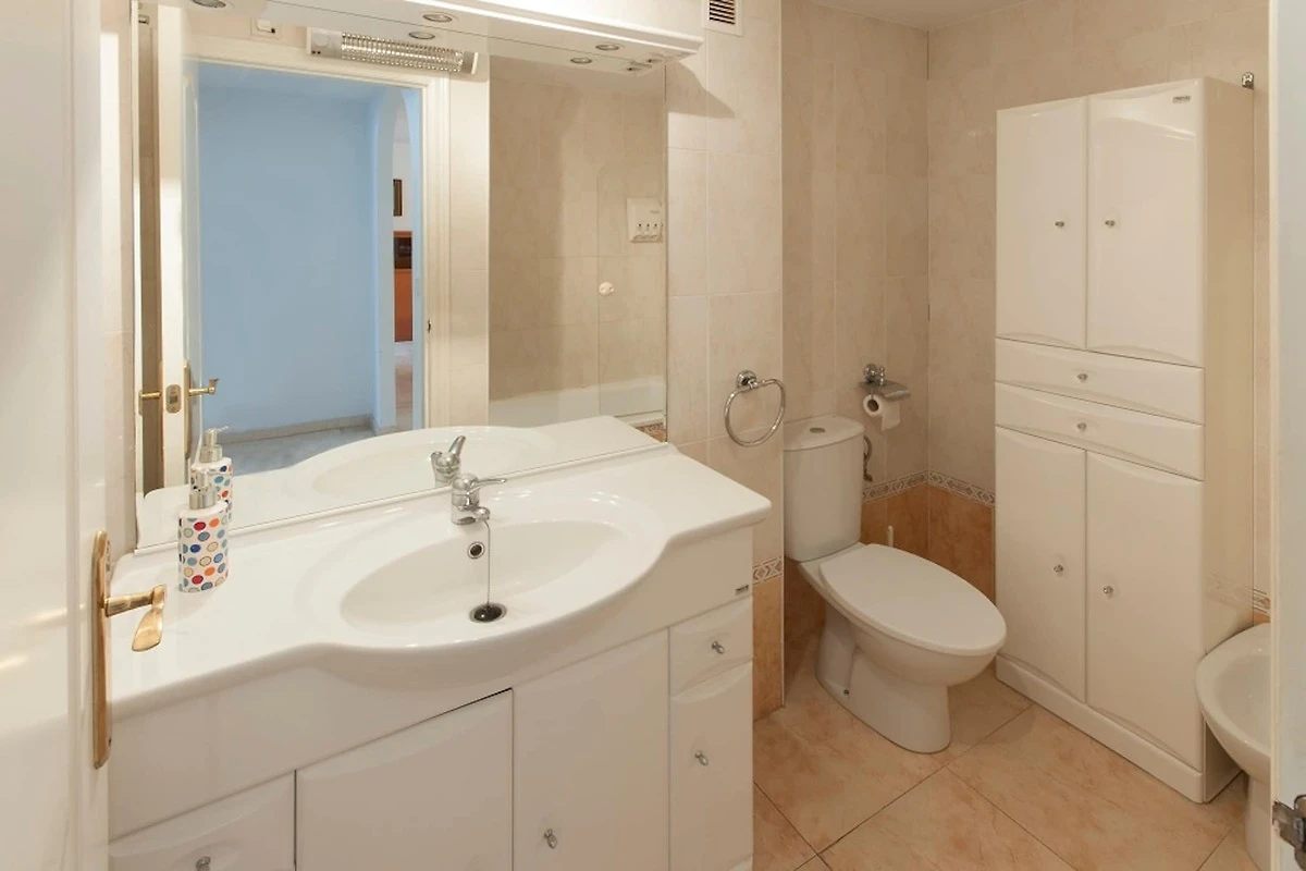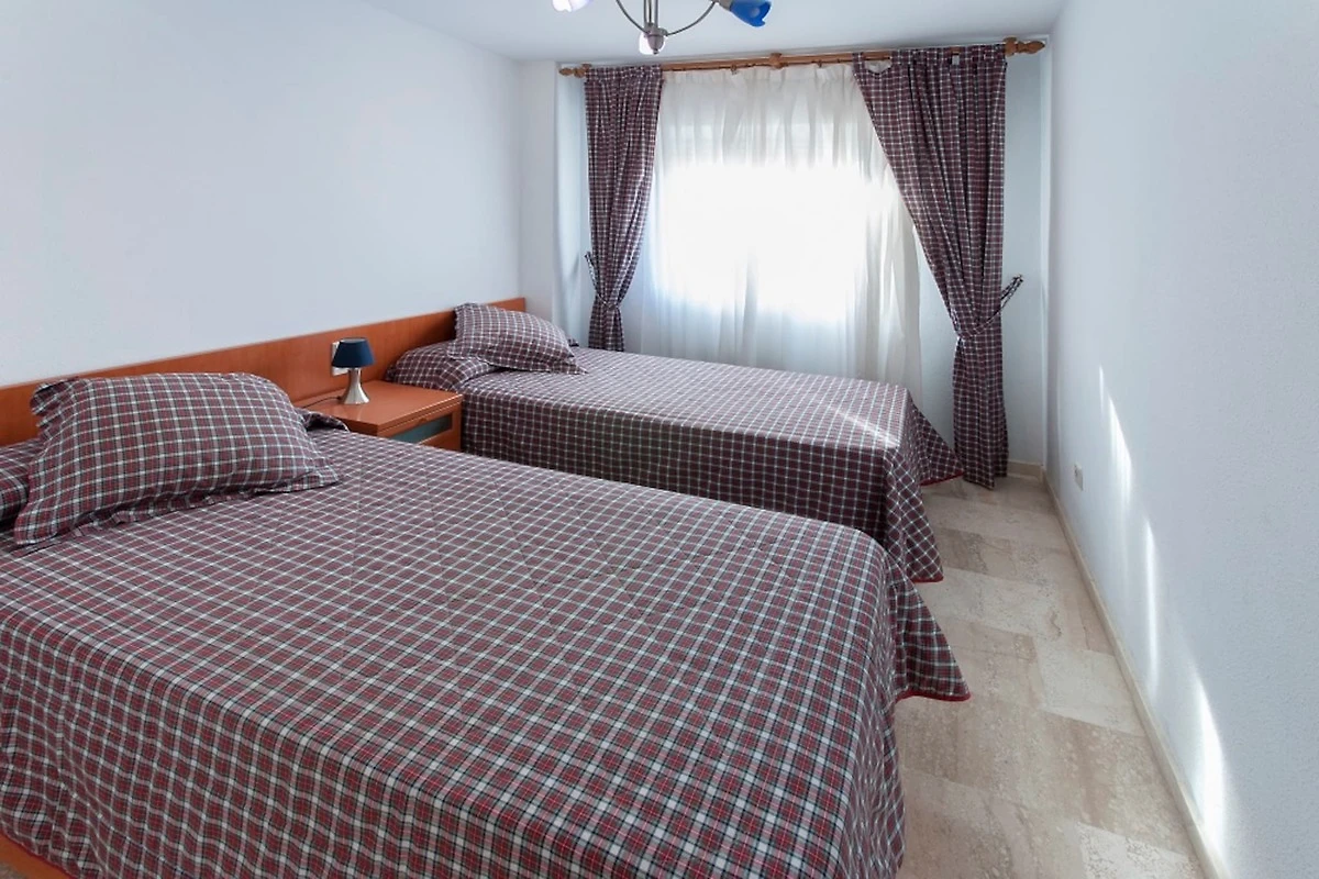 W tym przytulnym apartamencie usiądź i zrelaksuj się w jasnym salonie, w którym znajdują się dwie wygodne sofy, aby cieszyć się dobrą lekturą, oglądać telewizję lub dobrze się zdrzemnąć. W jadalni, w tej samej przestrzeni, znajduje się stół, na którym można zjeść śniadanie lub posiłek dla całej rodziny. W otwartej kuchni znajduje się wszystko, czego potrzebujesz, aby bez problemów gotować: blender, elektryczny ekspres do kawy, toster, sokowirówka, kuchenka mikrofalowa, zmywarka, kuchenka in vitro, piekarnik elektryczny, lodówka z zamrażarką, sztućce i przybory kuchenne. Jest też pralka, żelazko i deska do prasowania. Istnieją dwie sypialnie, idealne dla rodzin z dziećmi. W jednym znajduje się łóżko podwójne, a w drugim dwa łóżka pojedyncze. Dwa dodatkowe siedzenia znajdują się na rozkładanej sofie. Jest łazienka z wanną. Mieszkanie ma podział na ciepło/zimno w jadalni, który może klimatyzować wszystkie pokoje.