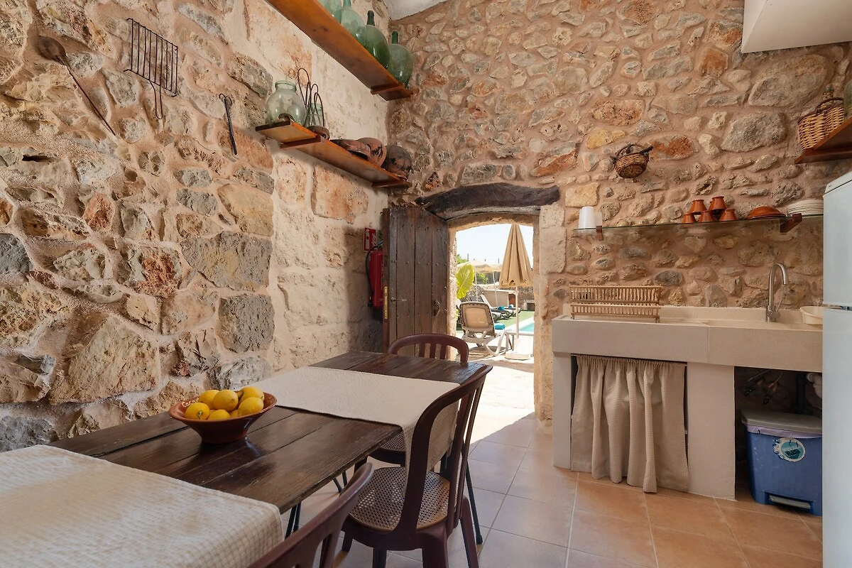 Interni, il piano principale ospita un ampio soggiorno con TV satellitare, che si apre, attraverso un tradizionale arco in pietra, su una cucina-sala da pranzo completamente attrezzata con piano cottura in vetroceramica ed elettrodomestici in stile industriale. Tutte e tre le camere da letto climatizzate (due matrimoniali e una doppia) si trovano al primo piano, insieme a un bagno moderno. Un secondo bagno si trova al piano principale. Al piano inferiore, a livello della piscina, si trovano una fresca sala giochi in stile grotta e una seconda zona pranzo con frigorifero e lavandino, perfetta per le riunioni a bordo piscina.