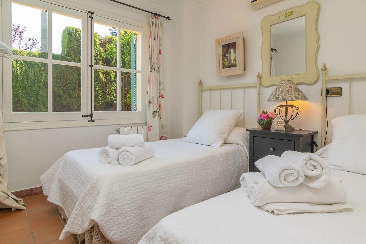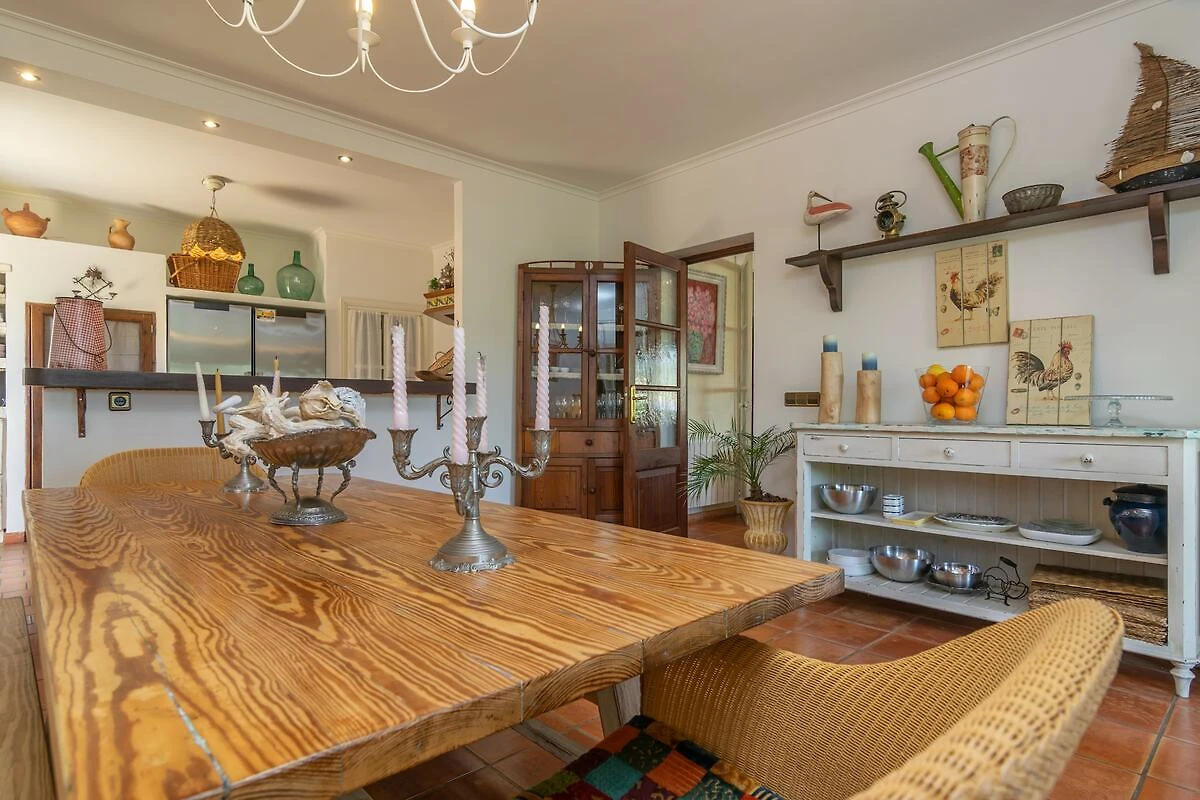 Dwupiętrowy dom oferuje uroczy, klasyczny styl. Duża jadalnia otwiera się na werandę poprzez duże okna. Kuchnia posiada również bardziej nieformalną część jadalną i jest wyposażona w płytę indukcyjną. Jest też pralka, żelazko i deska do prasowania. Parter uzupełnia łazienka z wanną oraz dwie sypialnie, jedna z łóżkiem małżeńskim, druga z dwoma łóżkami pojedynczymi. Na pierwszym piętrze mamy kolejny ładny pokój z TV-sat, łazienkę z wanną oraz 2 kolejne sypialnie, obie z łóżkiem małżeńskim i jedna z łazienką z prysznicem. 4 sypialnie wyposażone są w klimatyzację, a dom ma centralne ogrzewanie olejowe. Wreszcie możemy zapewnić Ci łóżeczko i krzesełko do karmienia, jeśli podróżujesz z dzieckiem.
