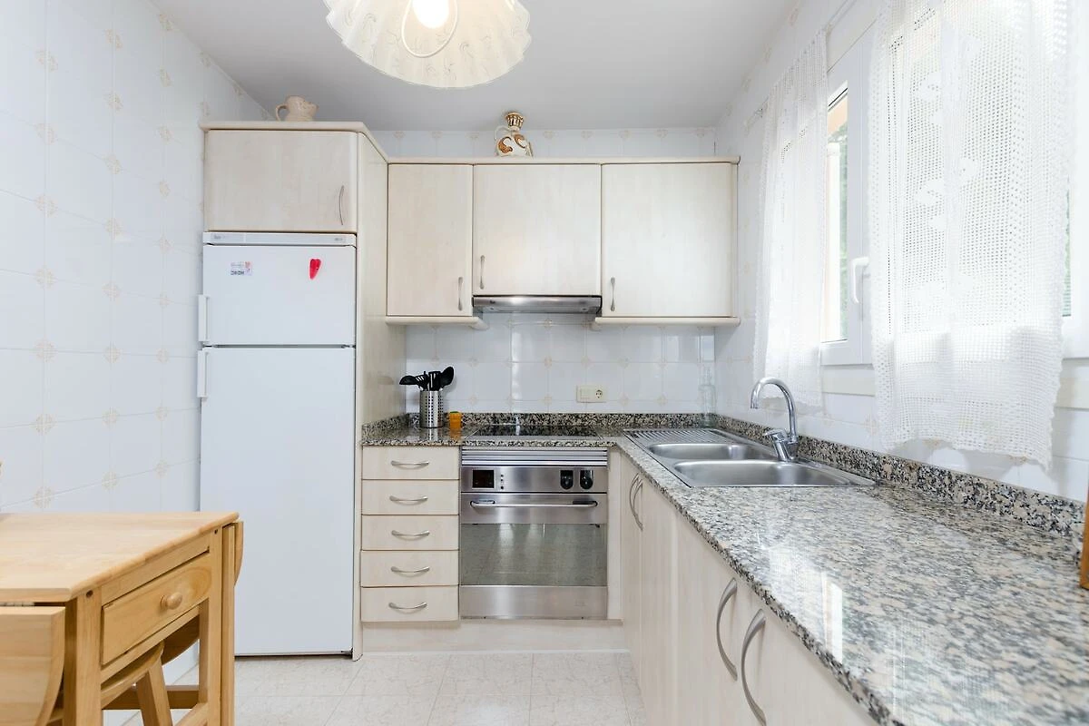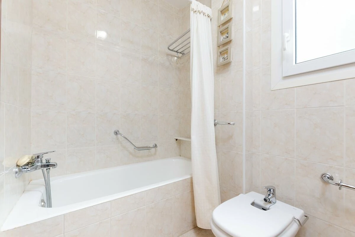 Questo appartamento al primo piano, senza ascensore, ha un piacevole soggiorno-sala da pranzo dove potete guardare la TV, leggere un libro o anche mangiare tutti insieme. Subito dopo, c'è una cucina attrezzata con piano cottura in vetroceramica. La lavanderia è dotata di lavatrice, ferro e asse da stiro. Per il vostro riposo, ci sono tre dormitori, due dei quali con letti matrimoniali e armadio e il terzo con un letto a rotelle. Una delle prime due camere ha un bagno privato con vasca. Un altro bagno con doccia serve l'intera casa. C'è l'aria condizionata nel soggiorno e in tutte e 3 le camere da letto. C'è disponibilità per una culla e un seggiolone.