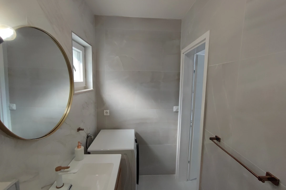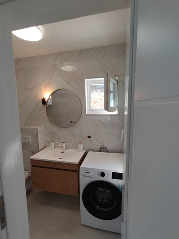 Il bagno è un'oasi di relax, con un lavandino moderno, un grande specchio e una lavatrice. L'elegante design degli interni, combinato con le calde tonalità di grigio e gli accenti di legno, crea un'atmosfera rilassante per il vostro massimo relax.