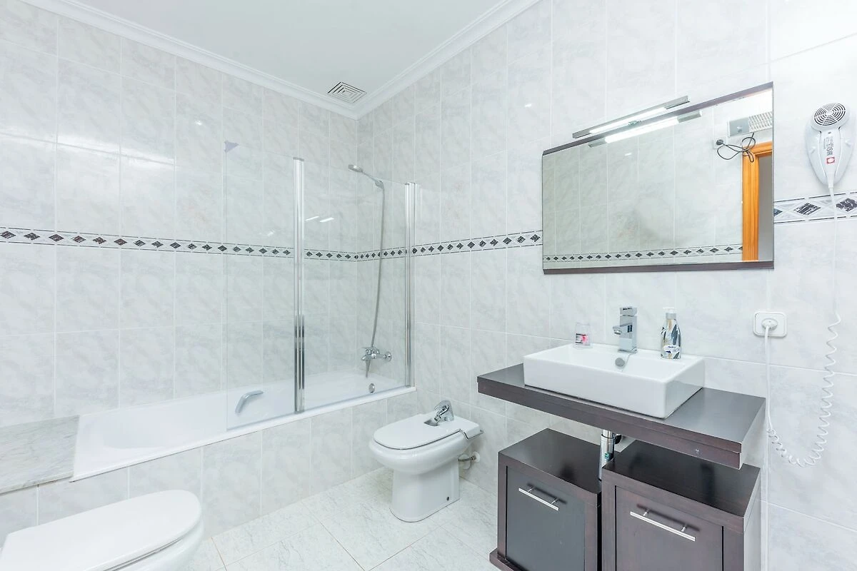 Z tarasu można przejść do kuchni wyposażonej w płytę ceramiczną. Salon-jadalnia z TV-SAT (kanały niemieckie) jest nowoczesny i wygodny. W pralni znajduje się pralka, żelazko i deska do prasowania. Na tym piętrze znajduje się pokój z łóżkiem podwójnym, jeden z dwoma łóżkami pojedynczymi i drugi z łóżkiem piętrowym, wszystkie z szafą. Na piętrze znajduje się czwarta sypialnia z dwoma pojedynczymi łóżkami, łazienka z prysznicem i nieumeblowany taras. Domowi służy łazienka z wanną i toaletą. Jest łóżeczko, krzesełko do karmienia, wentylator i 5 grzejników. Dodatkowo salon-jadalnia i wszystkie sypialnie, z wyjątkiem tej z łóżkiem piętrowym, wyposażone są w klimatyzację.