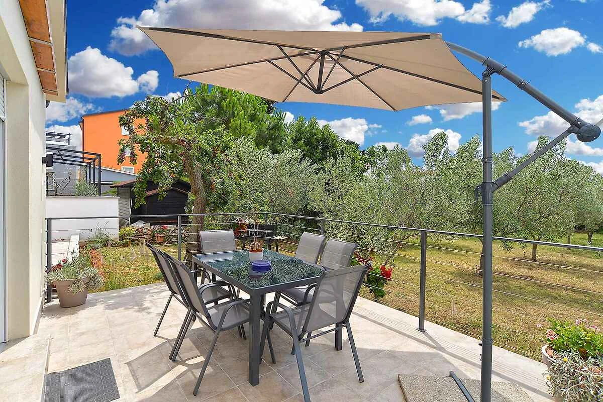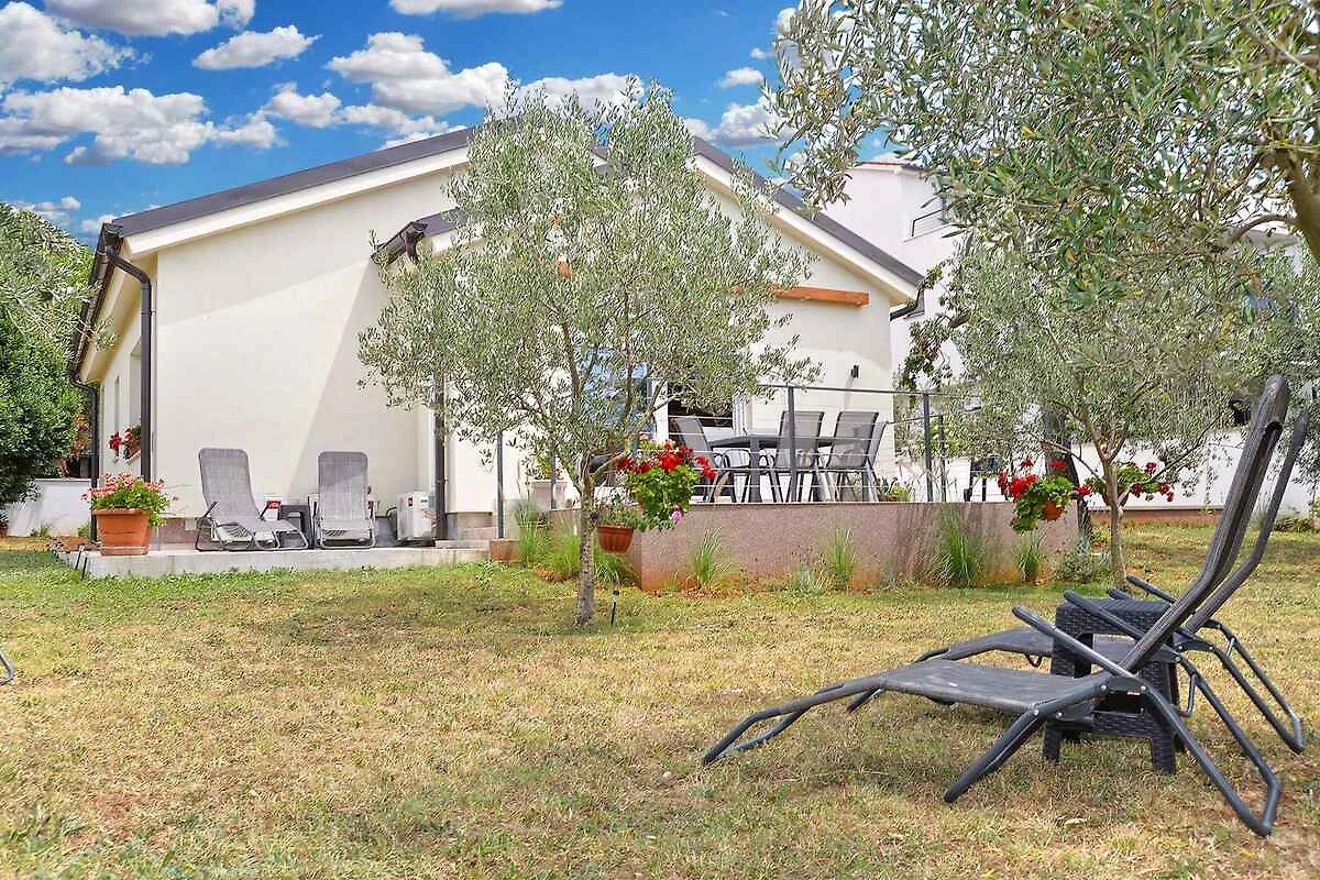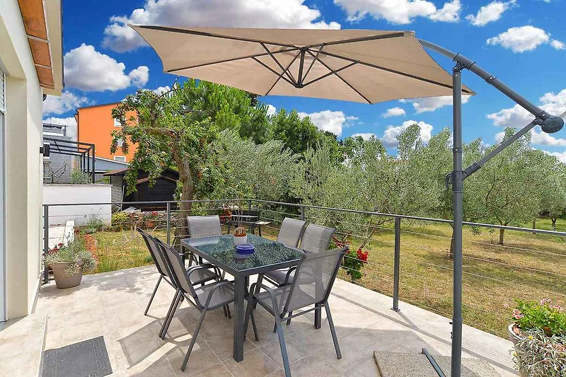Medulin. La casa vacanza si trova in una trama del giardino chiuso, grande 74 mq con prato, fiori, arbusti e alberi, delimitata da una recinzione e un muro. Il proprietario non abita nella casa o nella proprietá. L'accesso avviene vicino a una strada secondaria (asfaltata). Parcheggio sulla proprietà.
